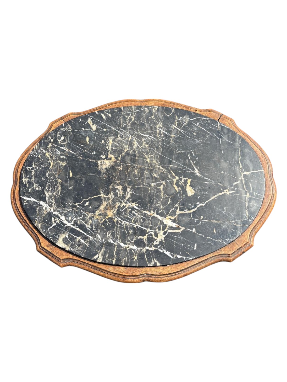 This antique French side table is hand carved oak from the 19th century. The oval top is Nero Portoro marble set into a carved wood frame of beaded pearl and ribbon motif with square rosette joining the legs. The legs are tapered with an X stretcher and a center urn. This is a very fun example of old world European craftsmanship. From the 19th century and in good condition except for small separation at the top corner frame that needs some wood filler to correct. Price reflects this condition