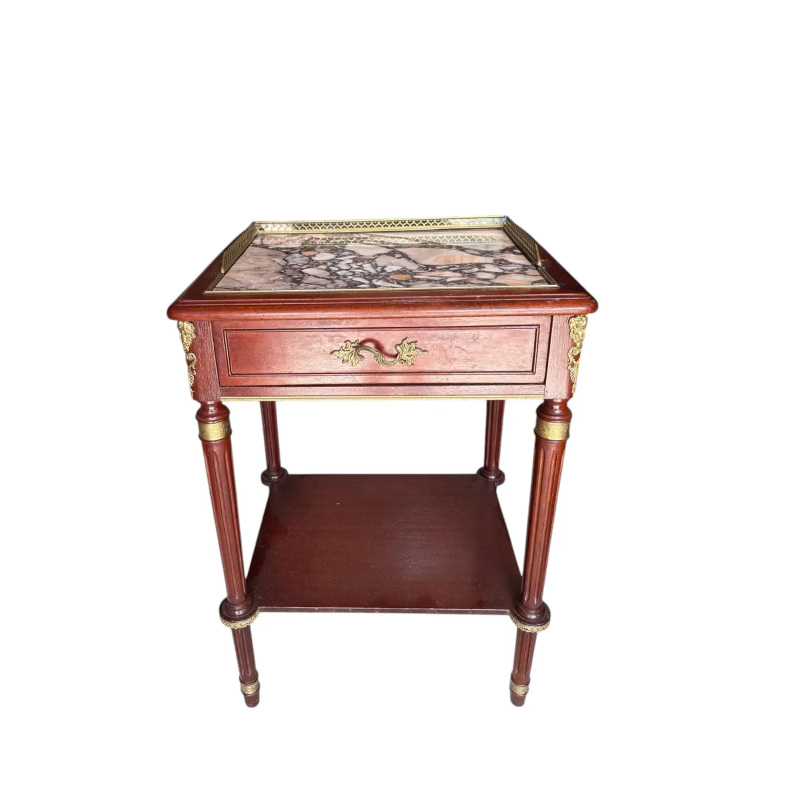 Marble top occasional table with three-quarter pierced gallery surround and ormolu detailing. Louis XVI style from the late 18th century. Perfect as a side table, entryway piece, of nightstand. There is a crack in the marble on the top but it still is gorgeous.