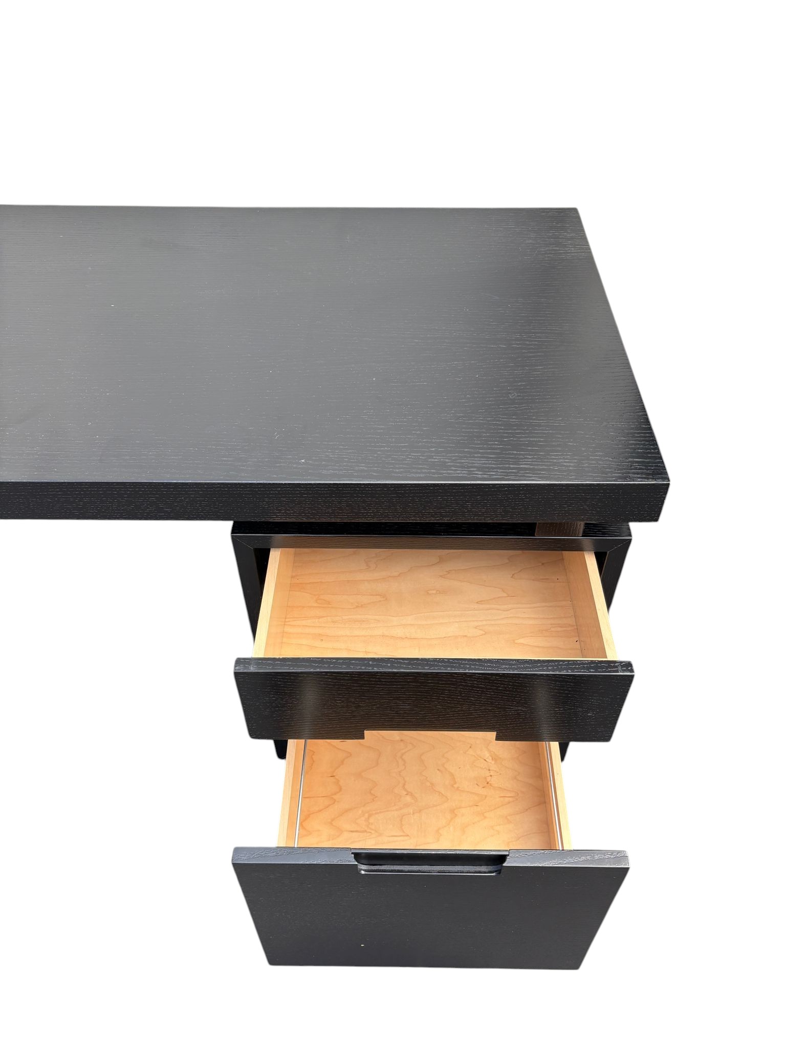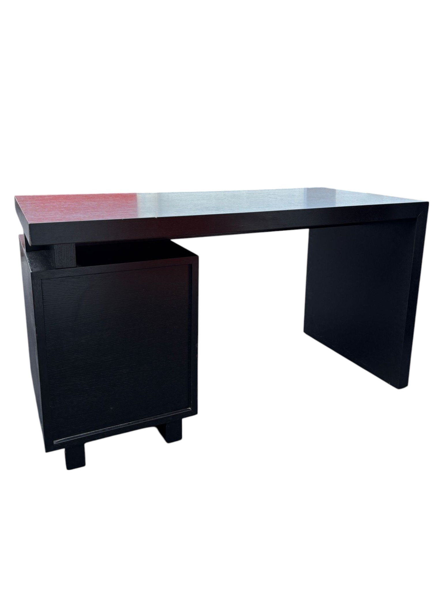If you are looking for a clean modern sleek desk look no further! This black ebonized modern desk has a file drawer and another top drawer for storage. It needs a good polish on both the side. Some scuffs due to moving otherwise in good condition.