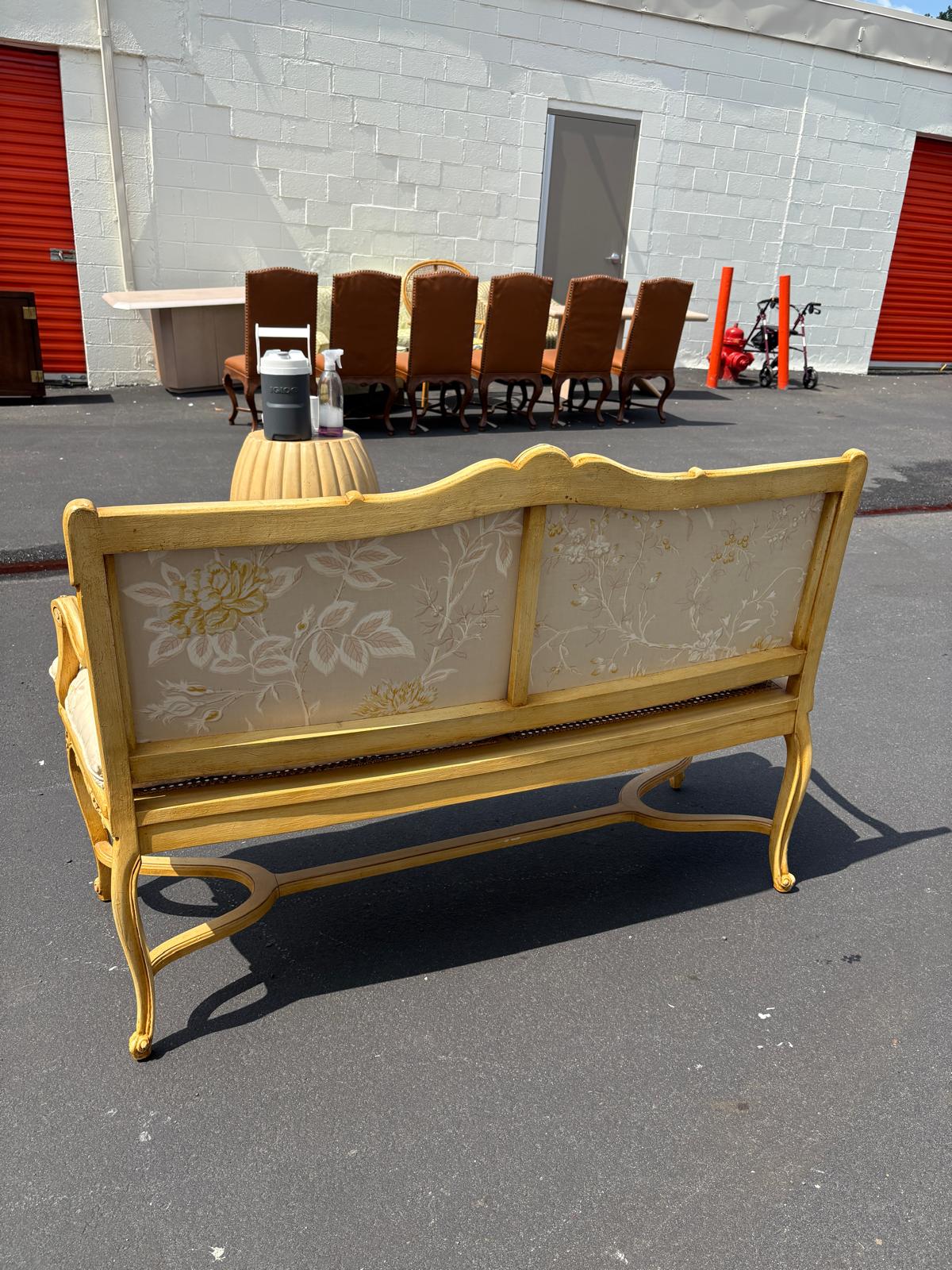 One of a kind custom upholstered settee with a cane seat under the cushion. Provincial style. Detailed scrolling frame. In very good condition.