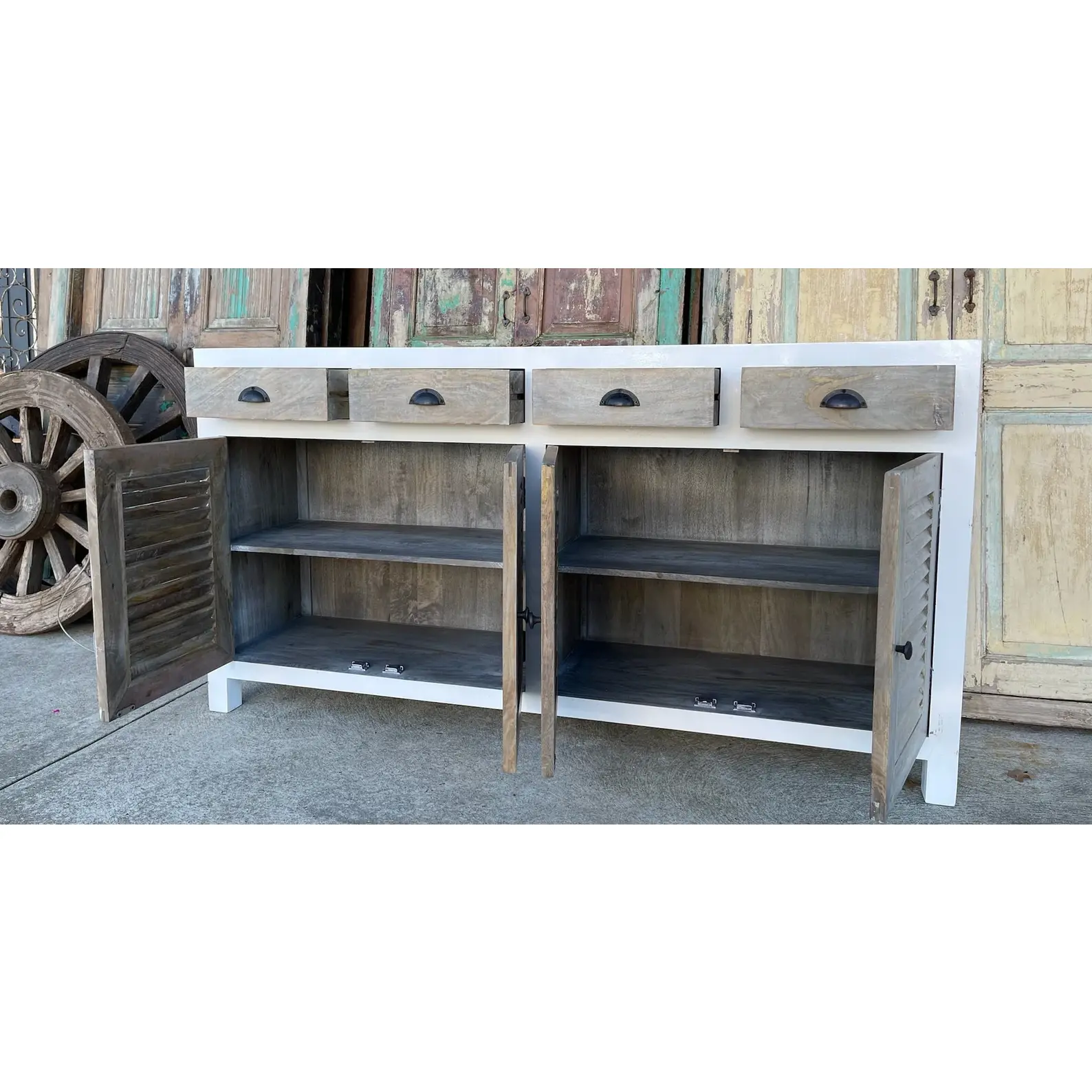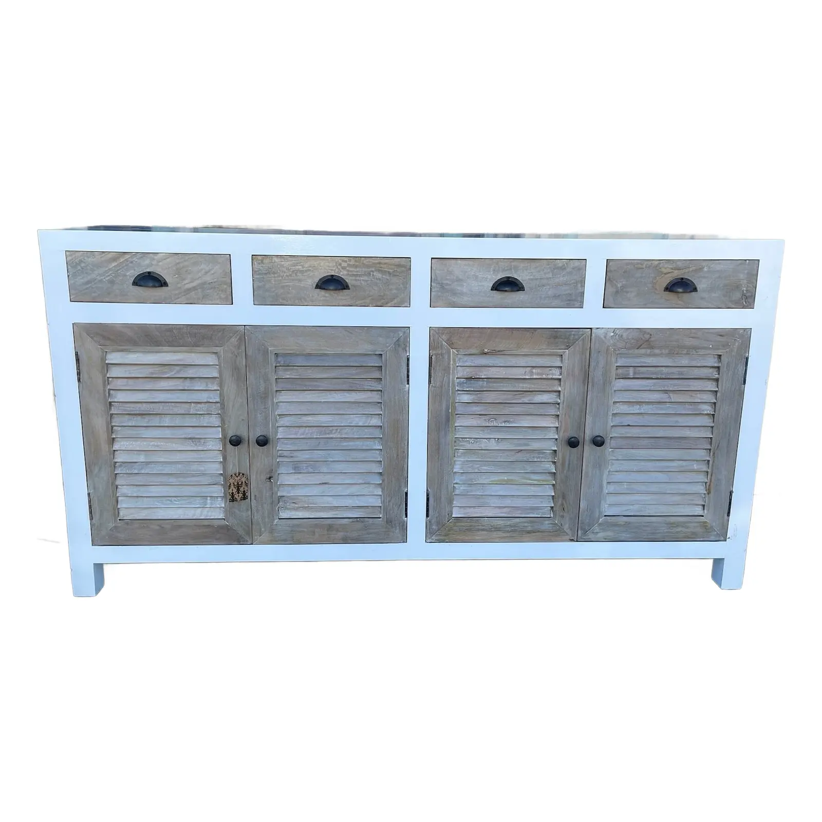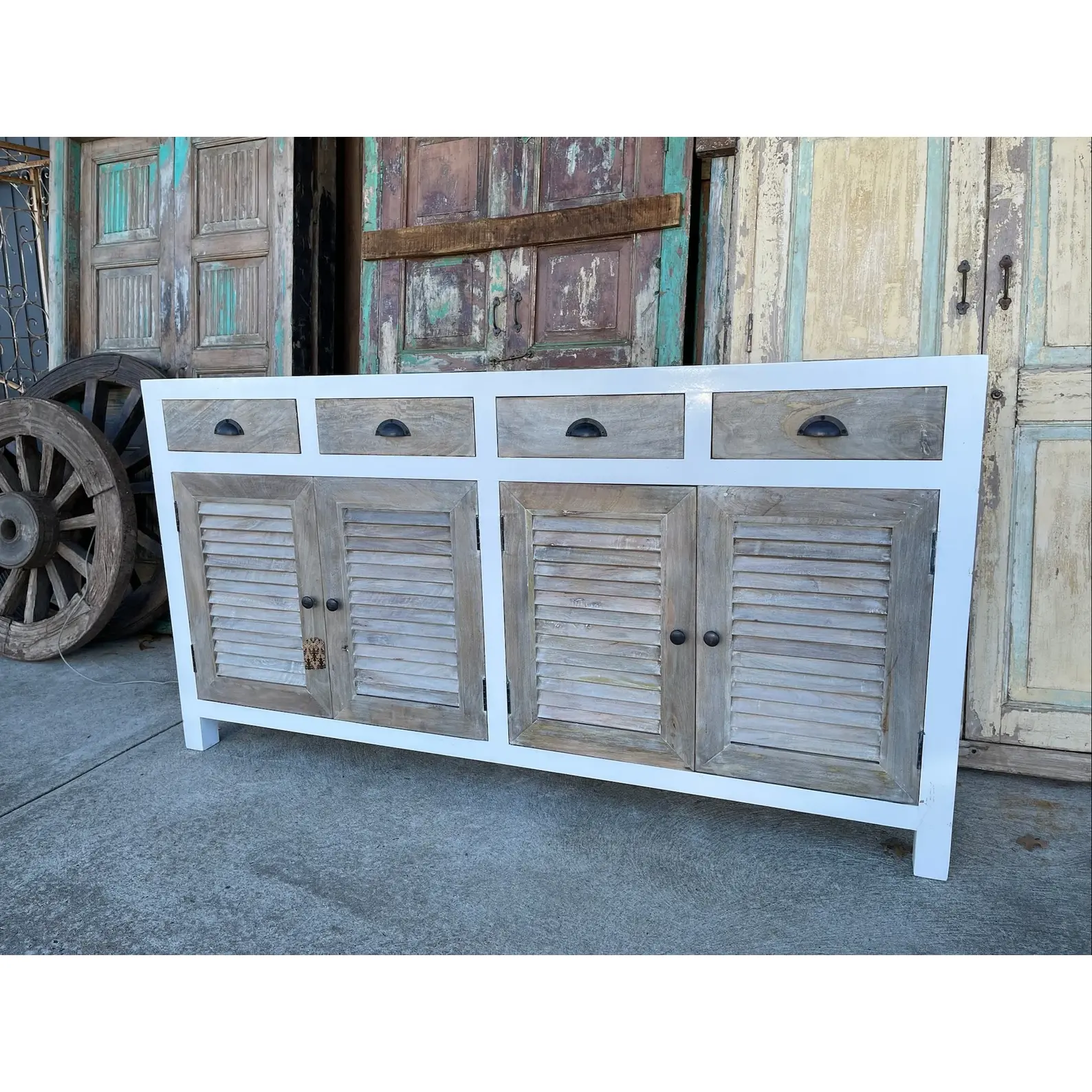 This Coastal Beach House media credenza features shutter doors and a two-tone white and driftwood finish, crafted from solid wood, functioning as a tall buffet server cabinet.