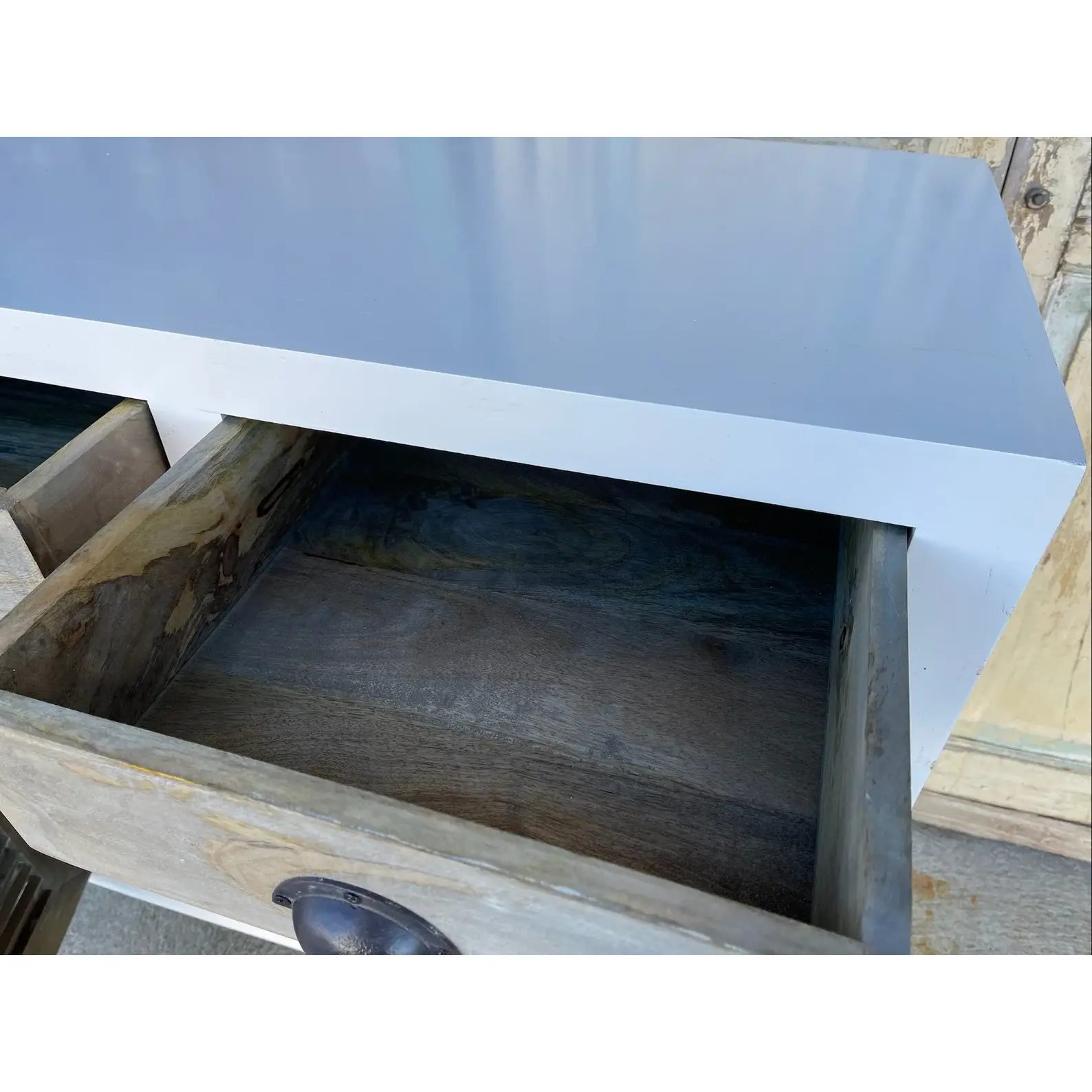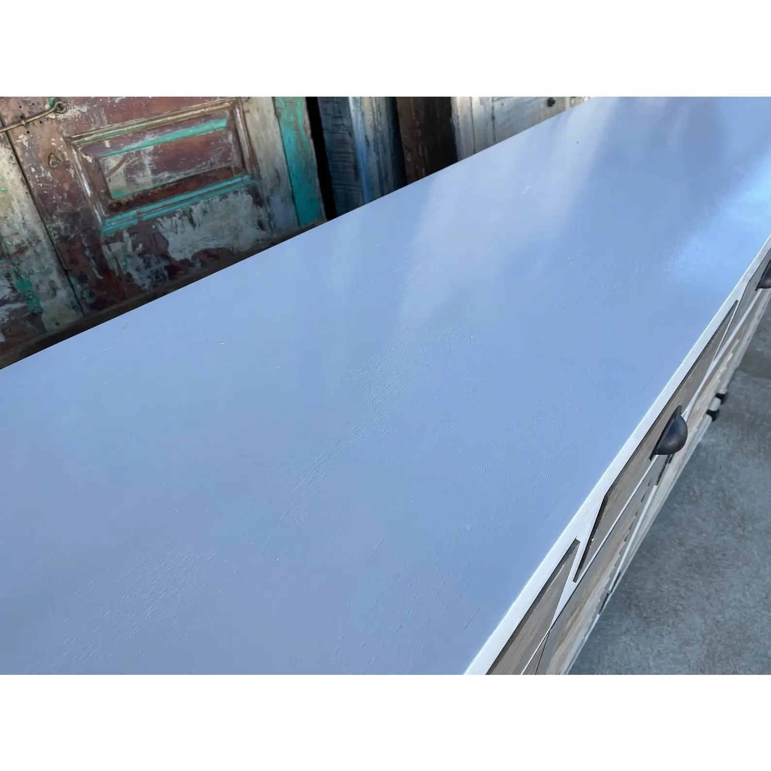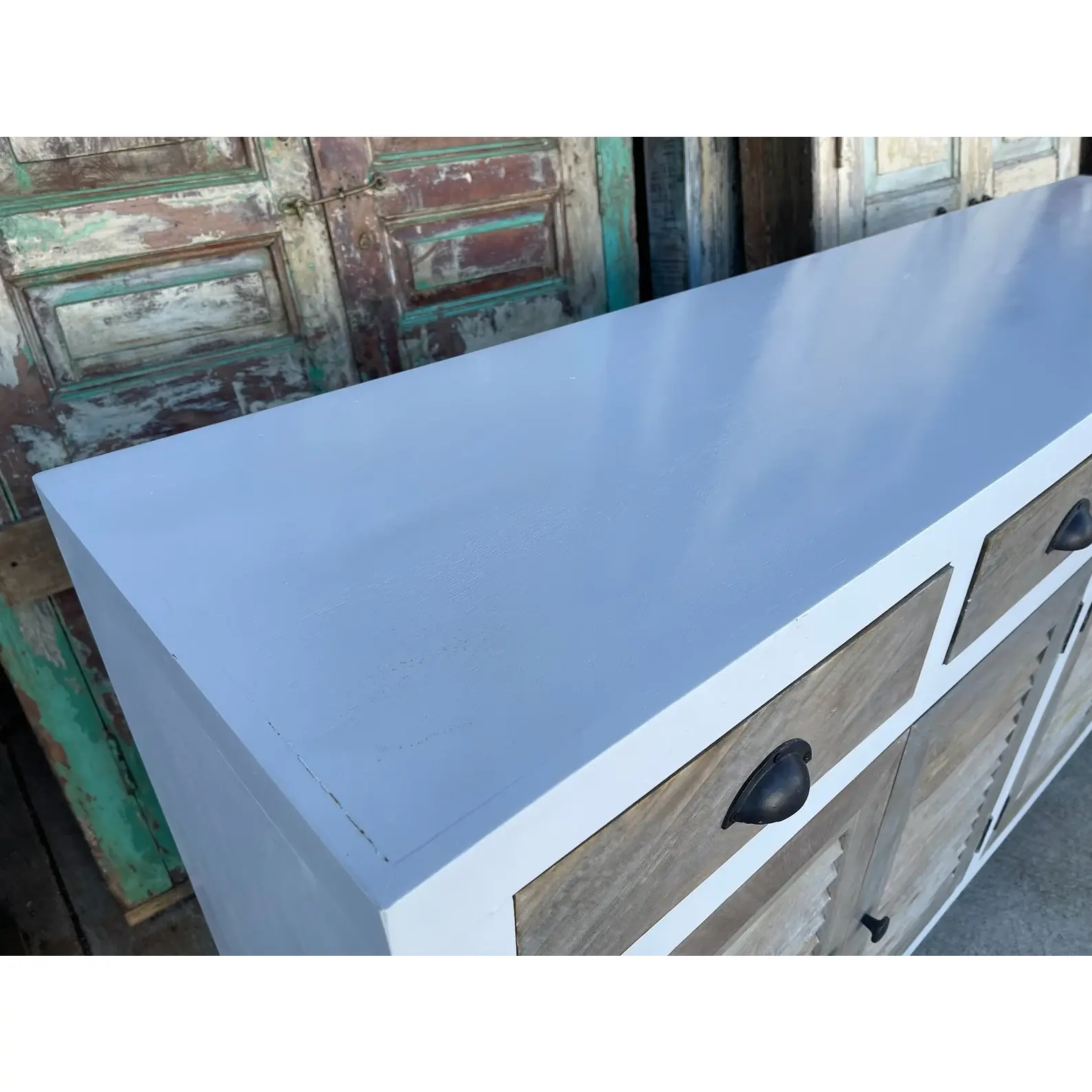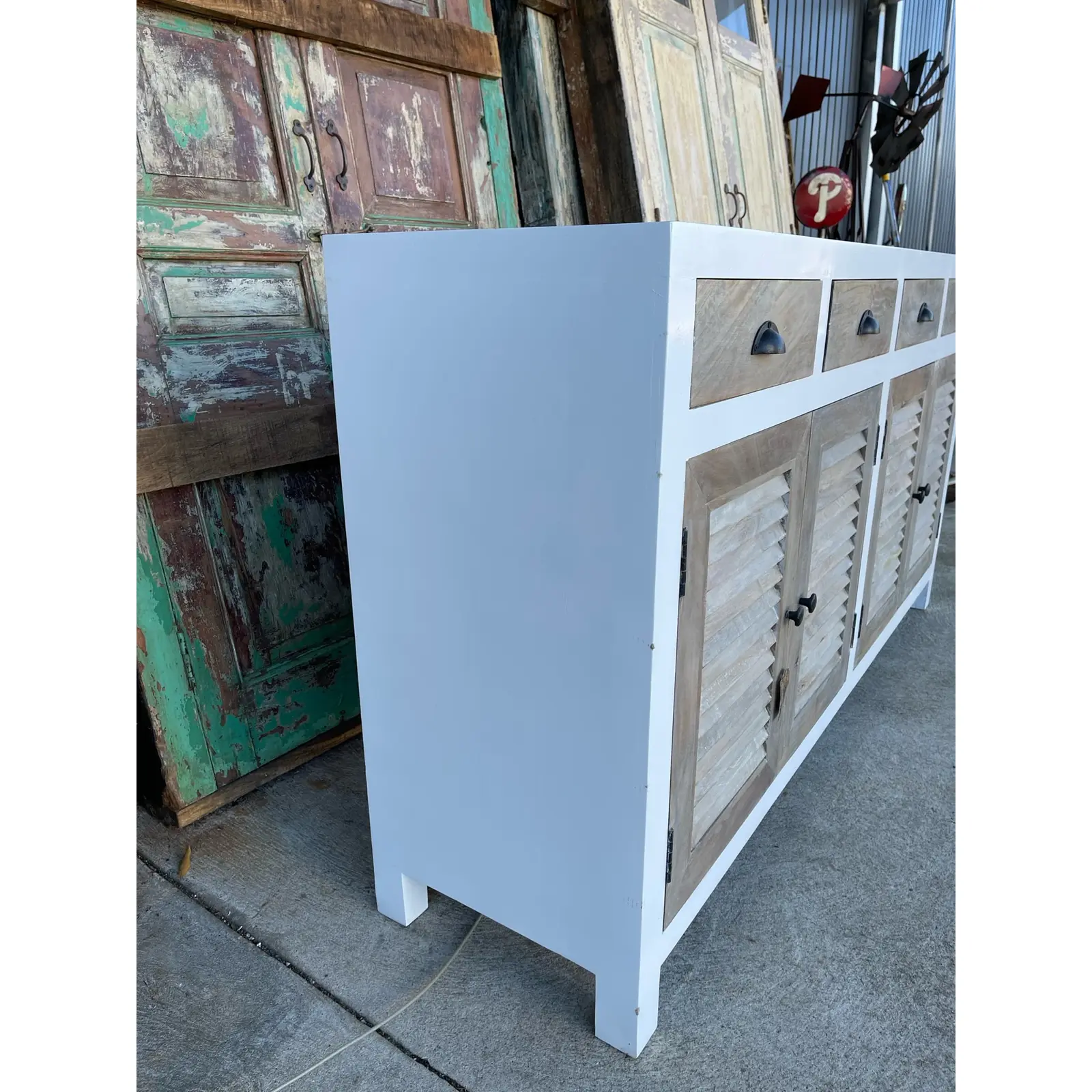 This Coastal Beach House media credenza features shutter doors and a two-tone white and driftwood finish, crafted from solid wood, functioning as a tall buffet server cabinet.
