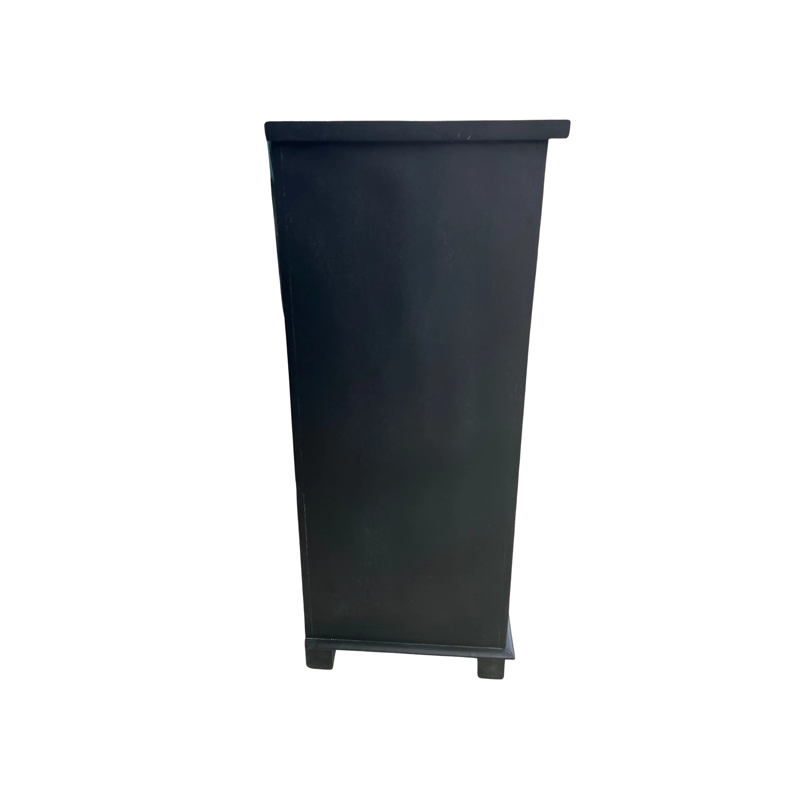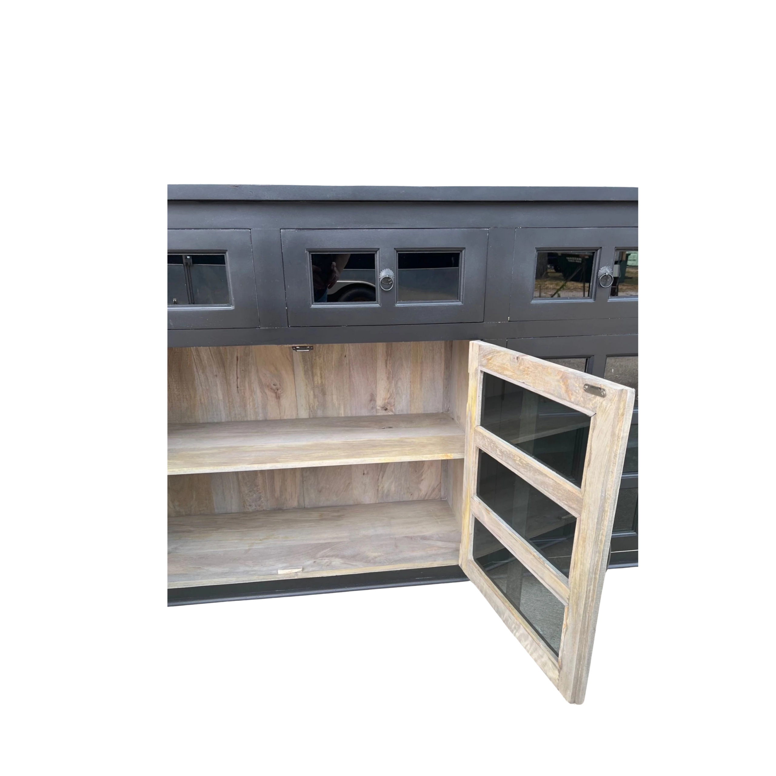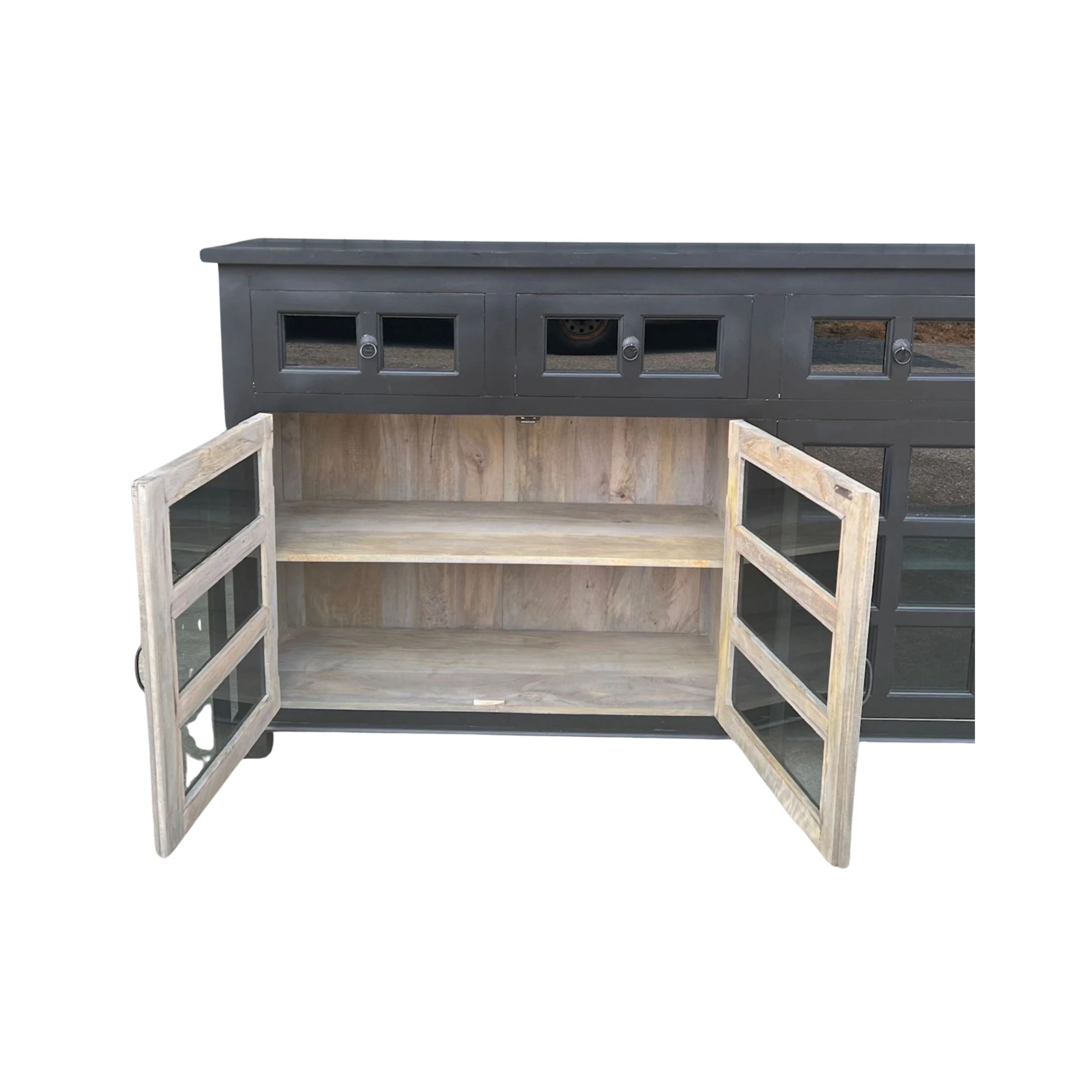 This contemporary Coastal entryway credenza features 32 smoked glass pane doors and drawers, offering a tall buffet server console in black.