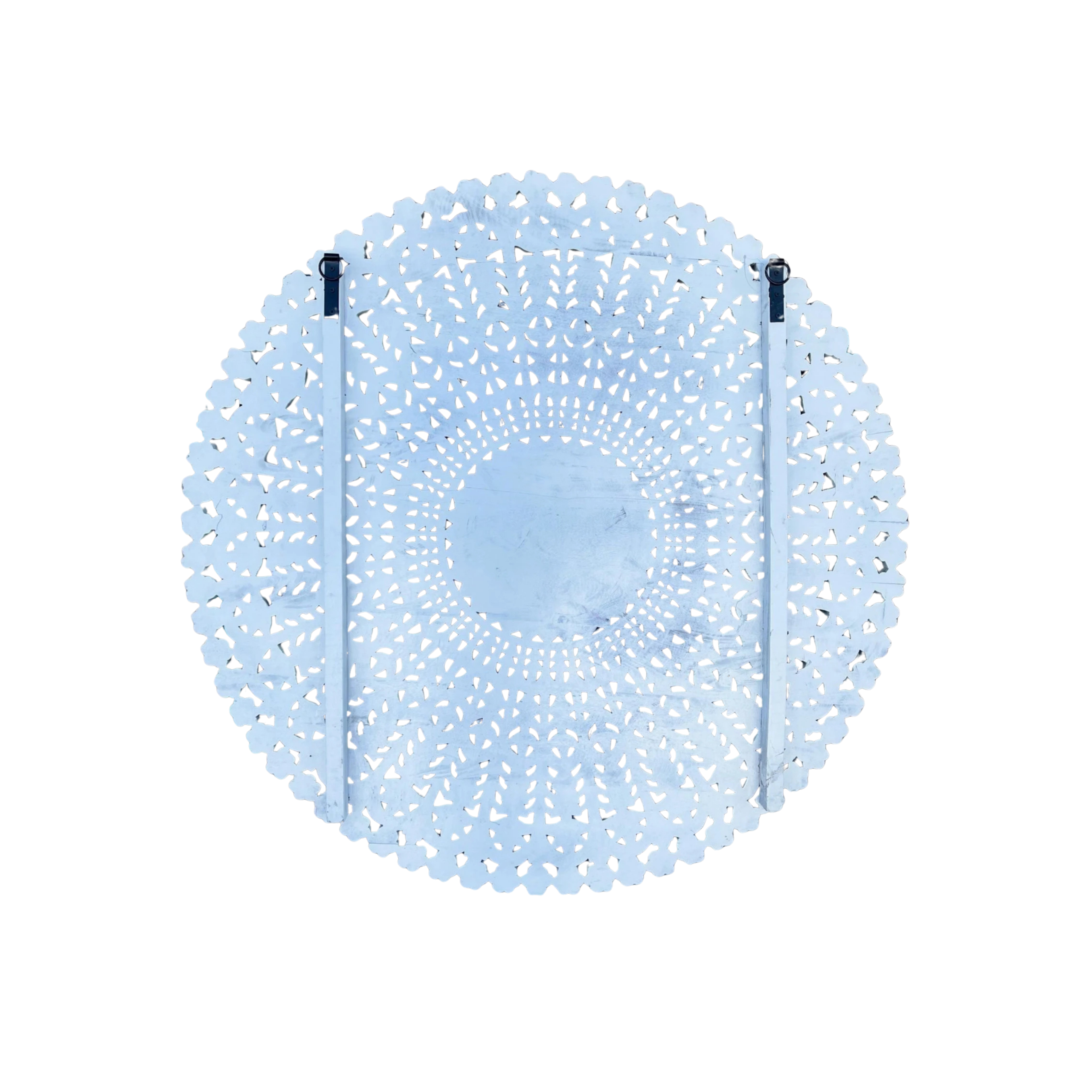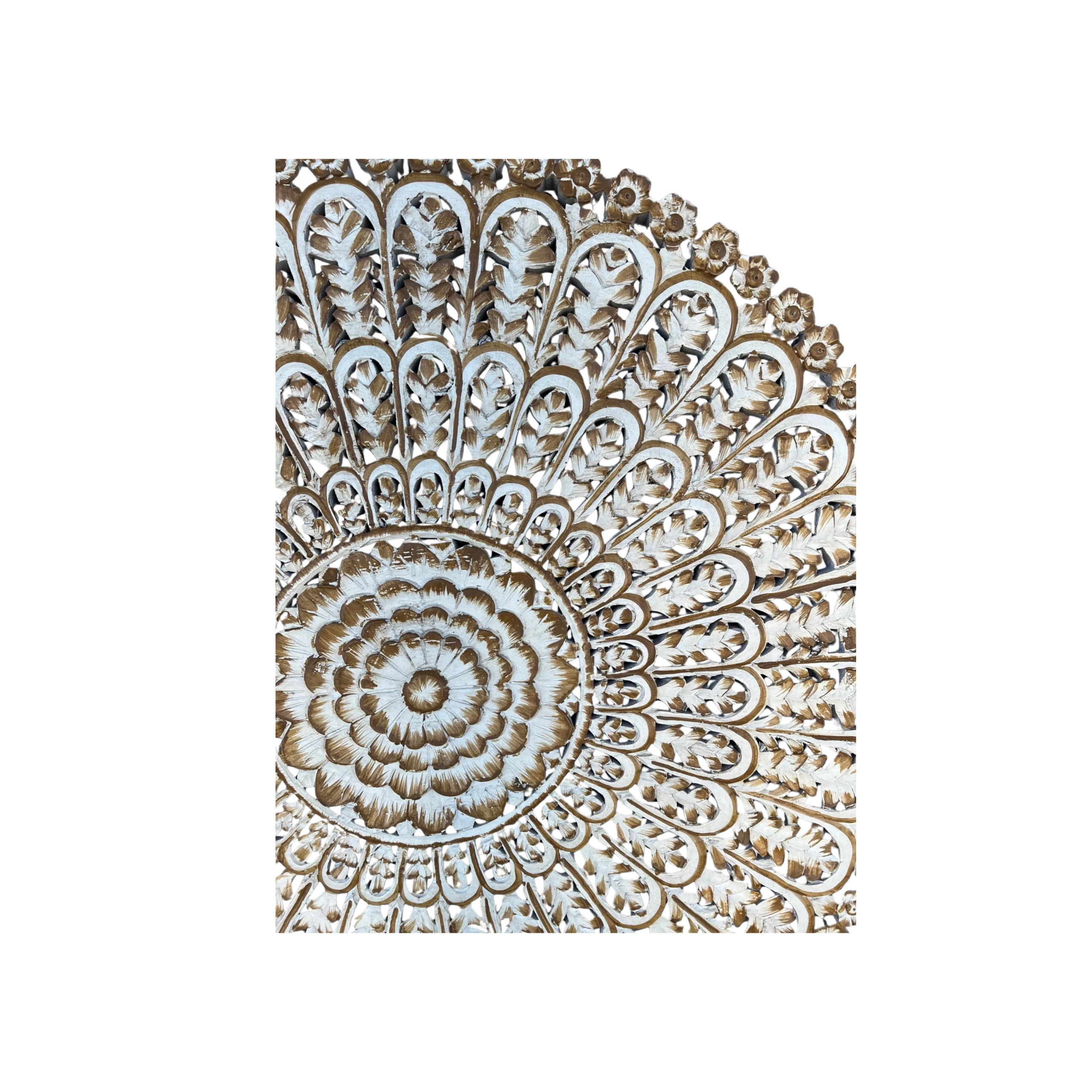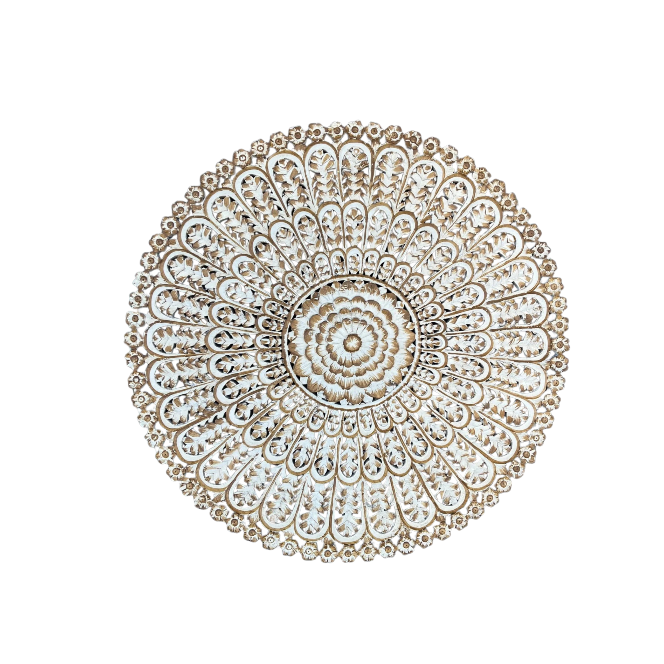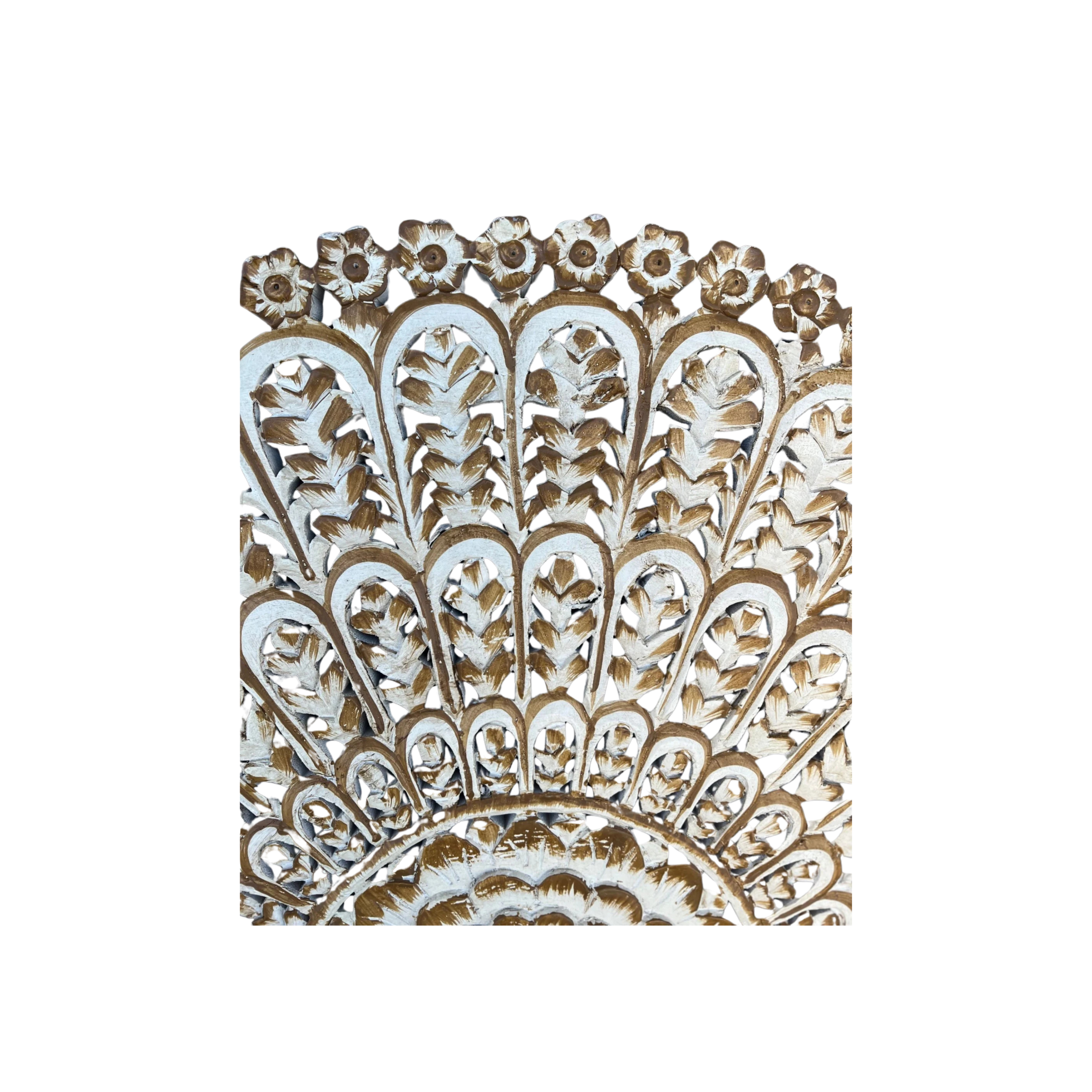 This Coastal Boho wall art features a 4′ tall, round design meticulously hand-carved from solid mango wood with an intricate floral fretwork pattern, perfect for adding a touch of natural artistry to your decor.