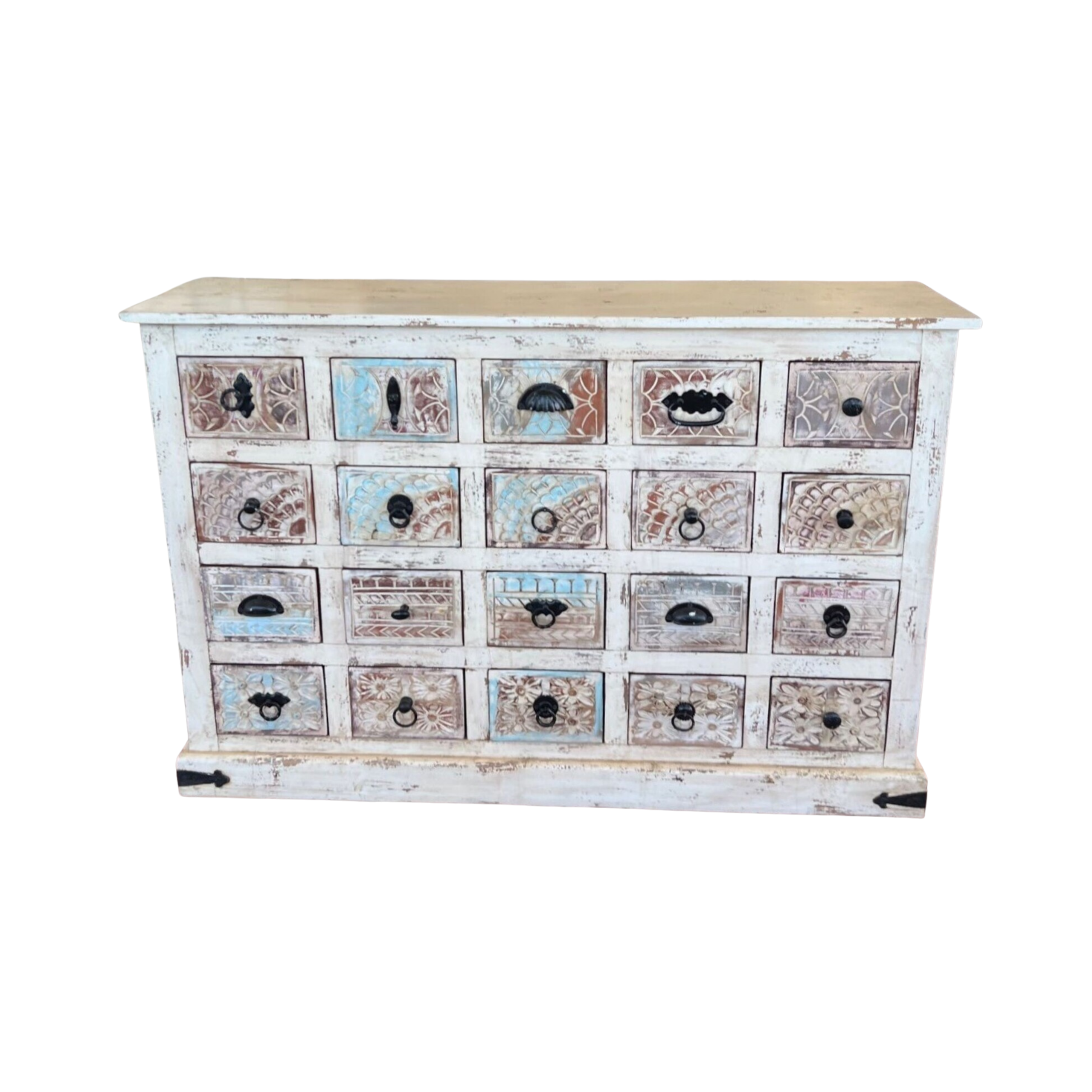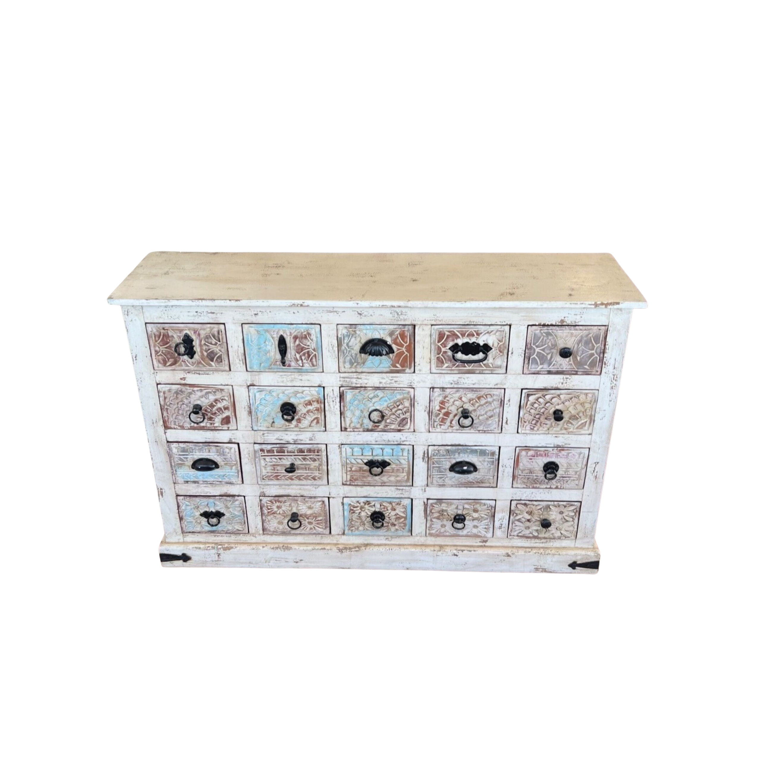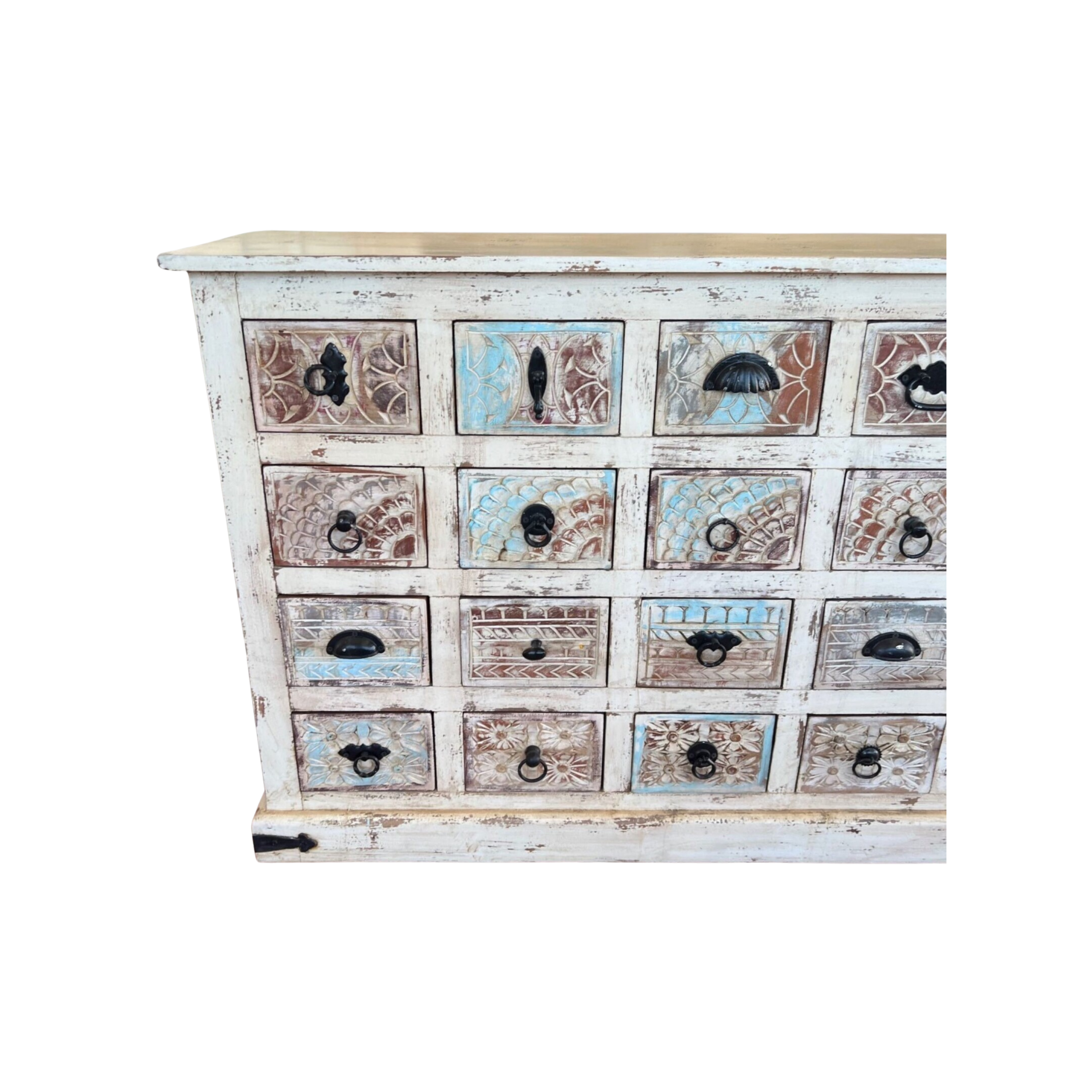 This Coastal Boho apothecary chest features 20 small drawers with carved flowers and seashells, all in a distressed white and ocean blue finish, perfect as a narrow entryway console.