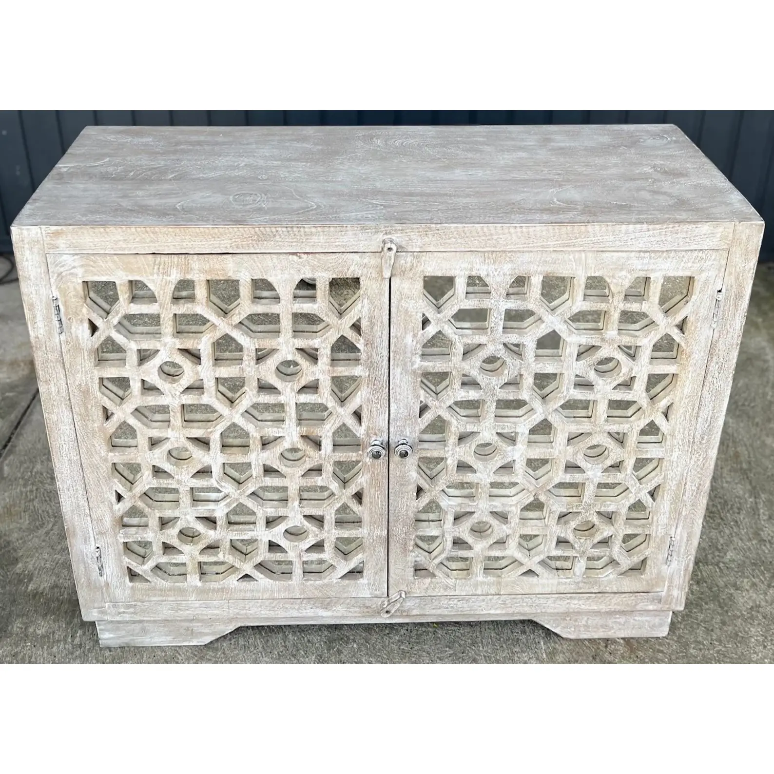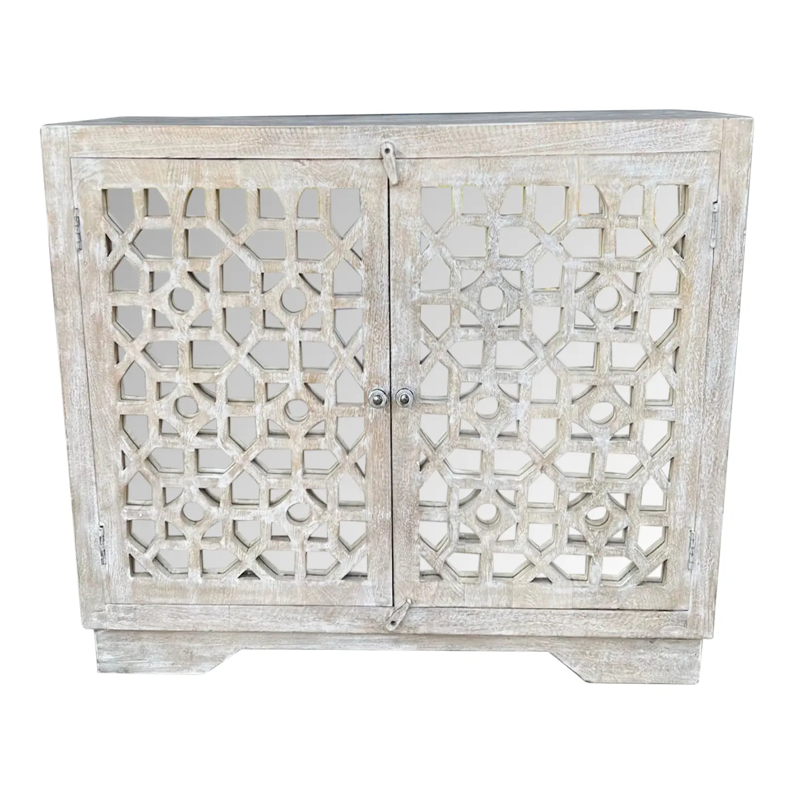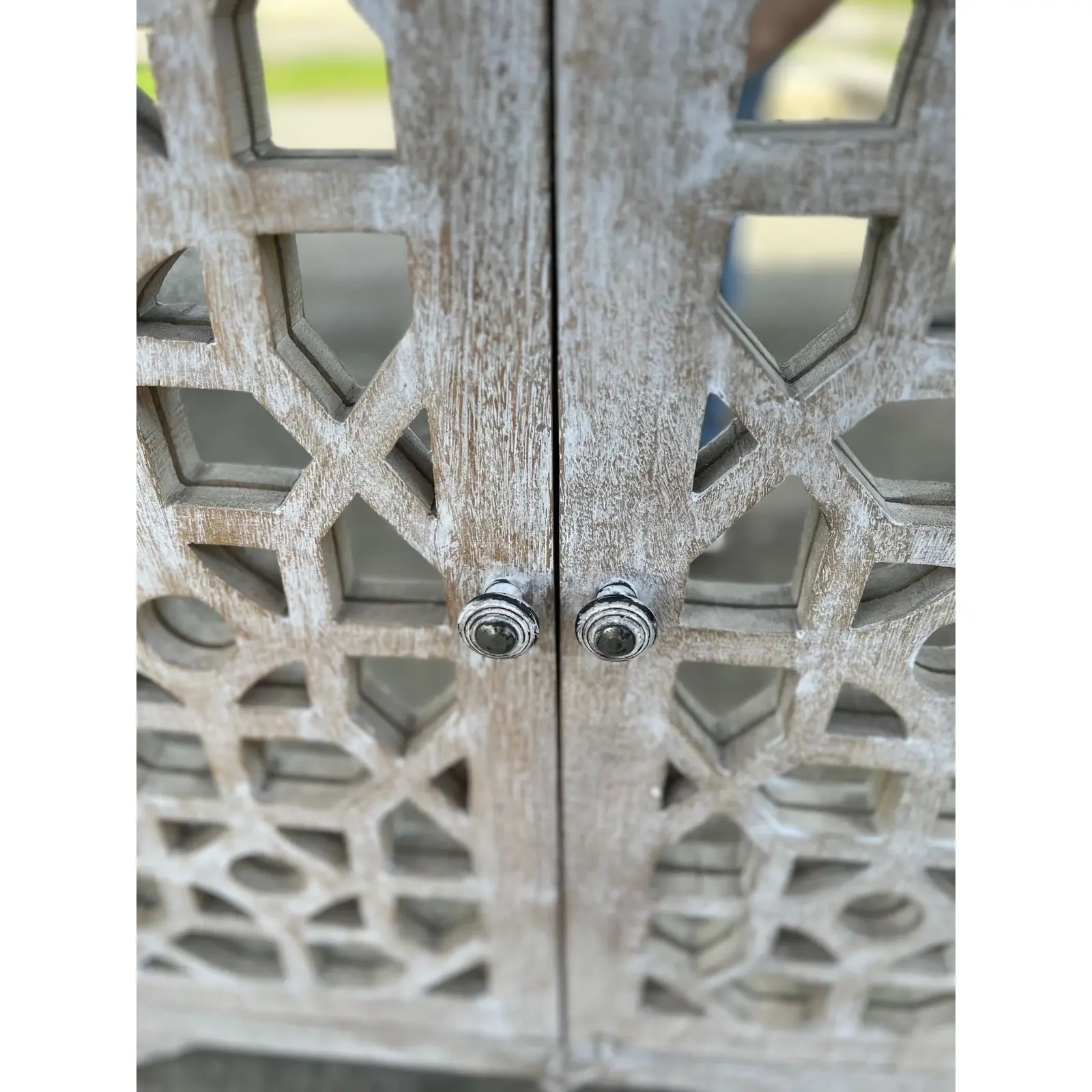 This Coastal Boho cabinet features carved fretwork glass doors and a whitewashed driftwood finish, perfect as a small entryway console, bedroom, or living room storage.