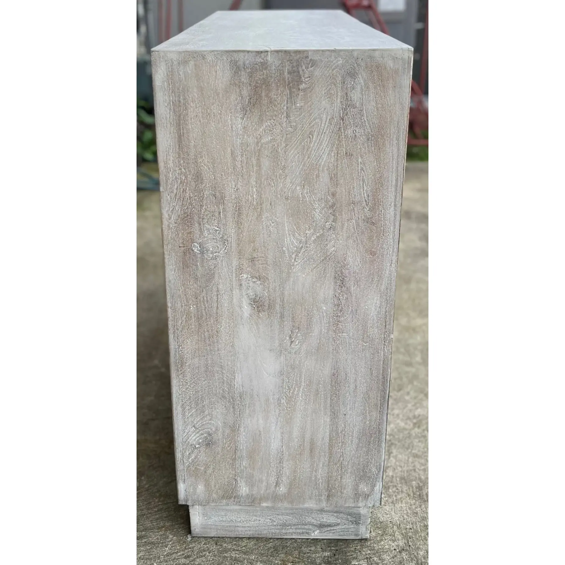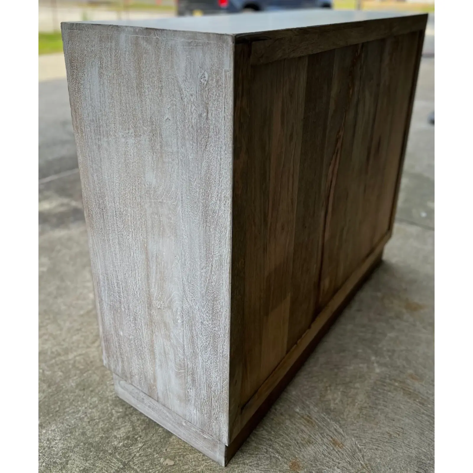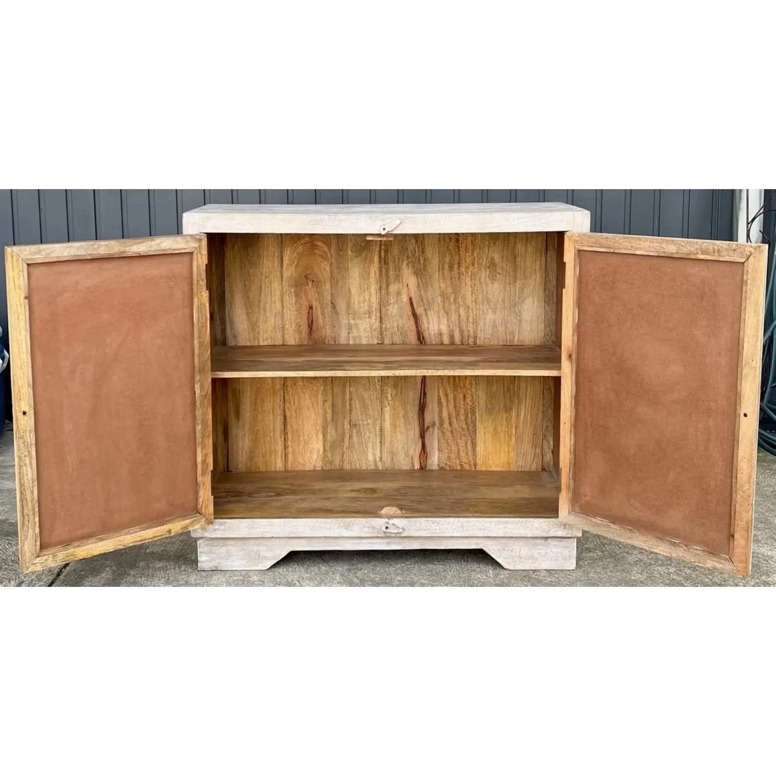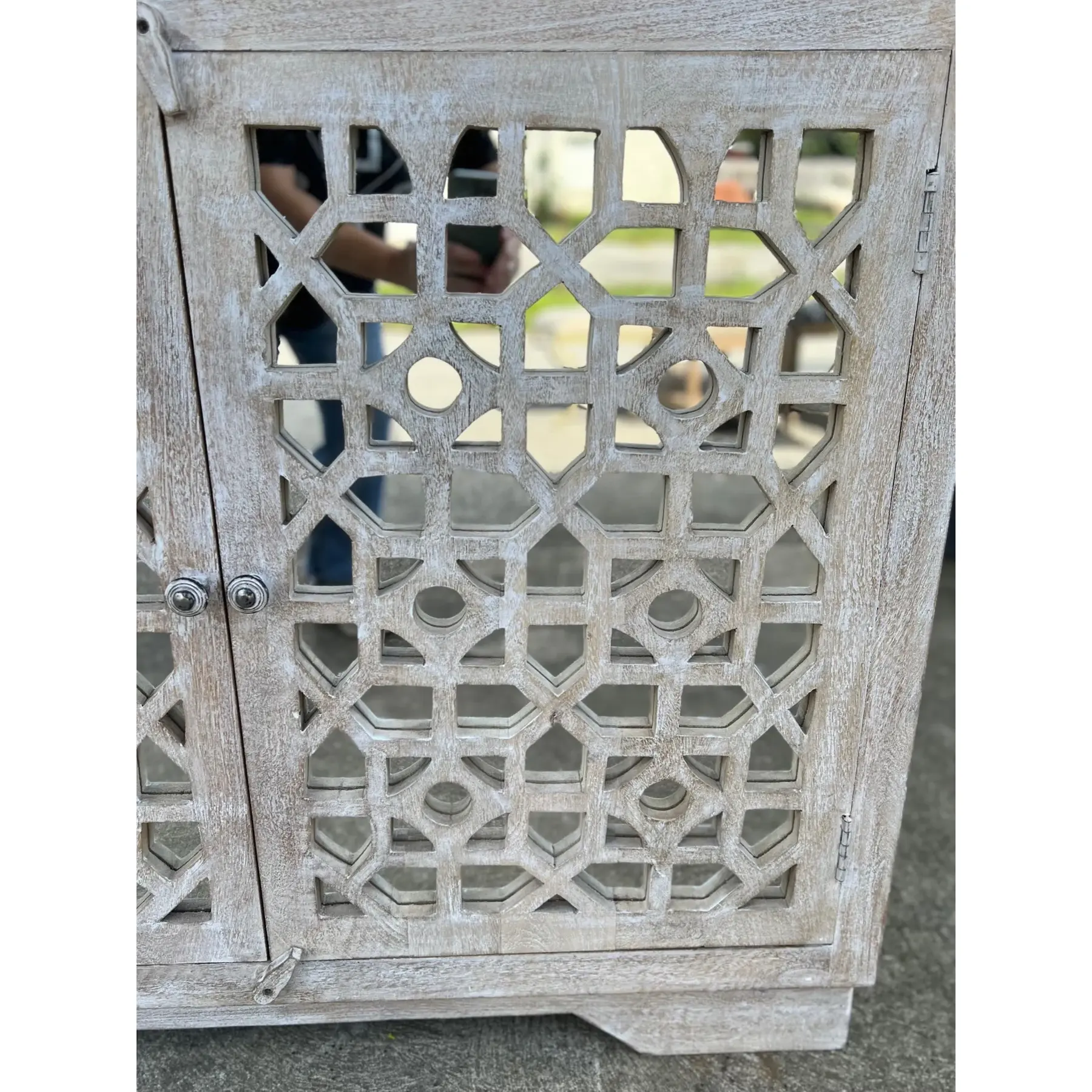 This Coastal Boho cabinet features carved fretwork glass doors and a whitewashed driftwood finish, perfect as a small entryway console, bedroom, or living room storage.