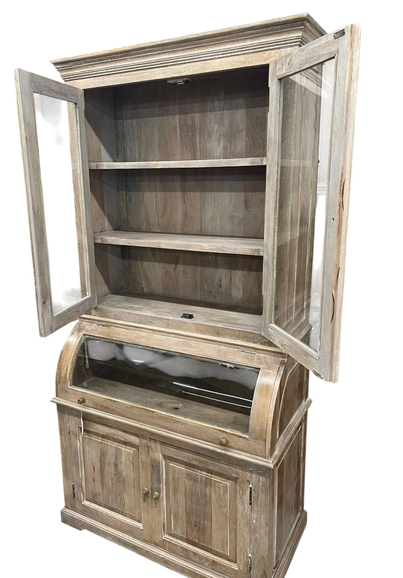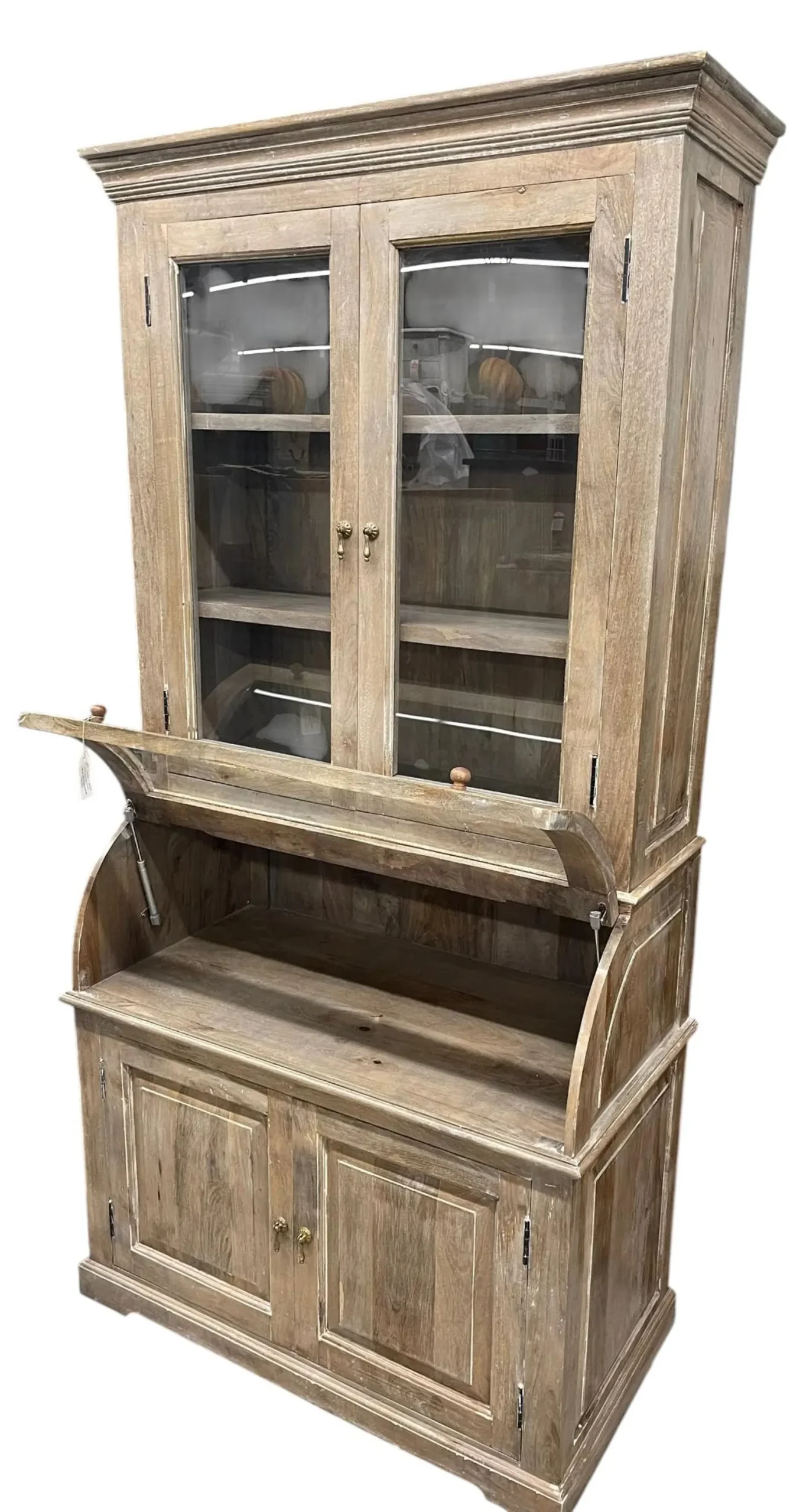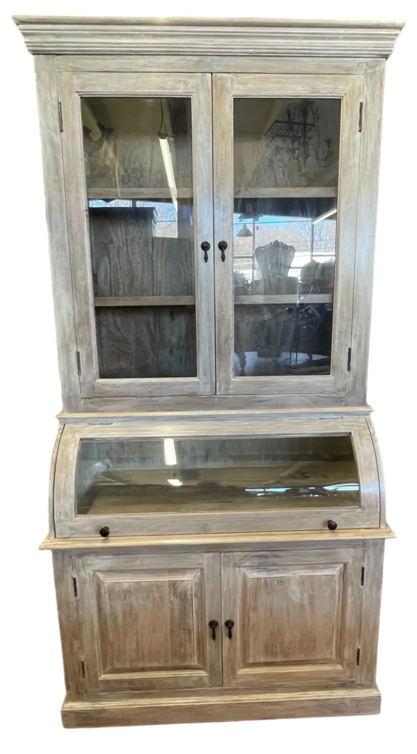 This Coastal Cottage kitchen pantry features a single roll curved glass bread cabinet and a tall glass door, functioning as a kitchen cupboard or storage hutch with a driftwood finish.