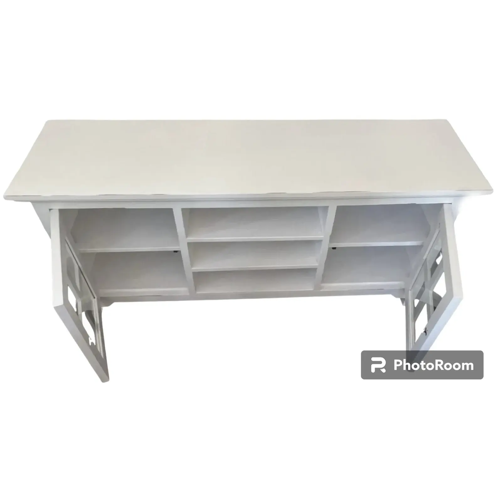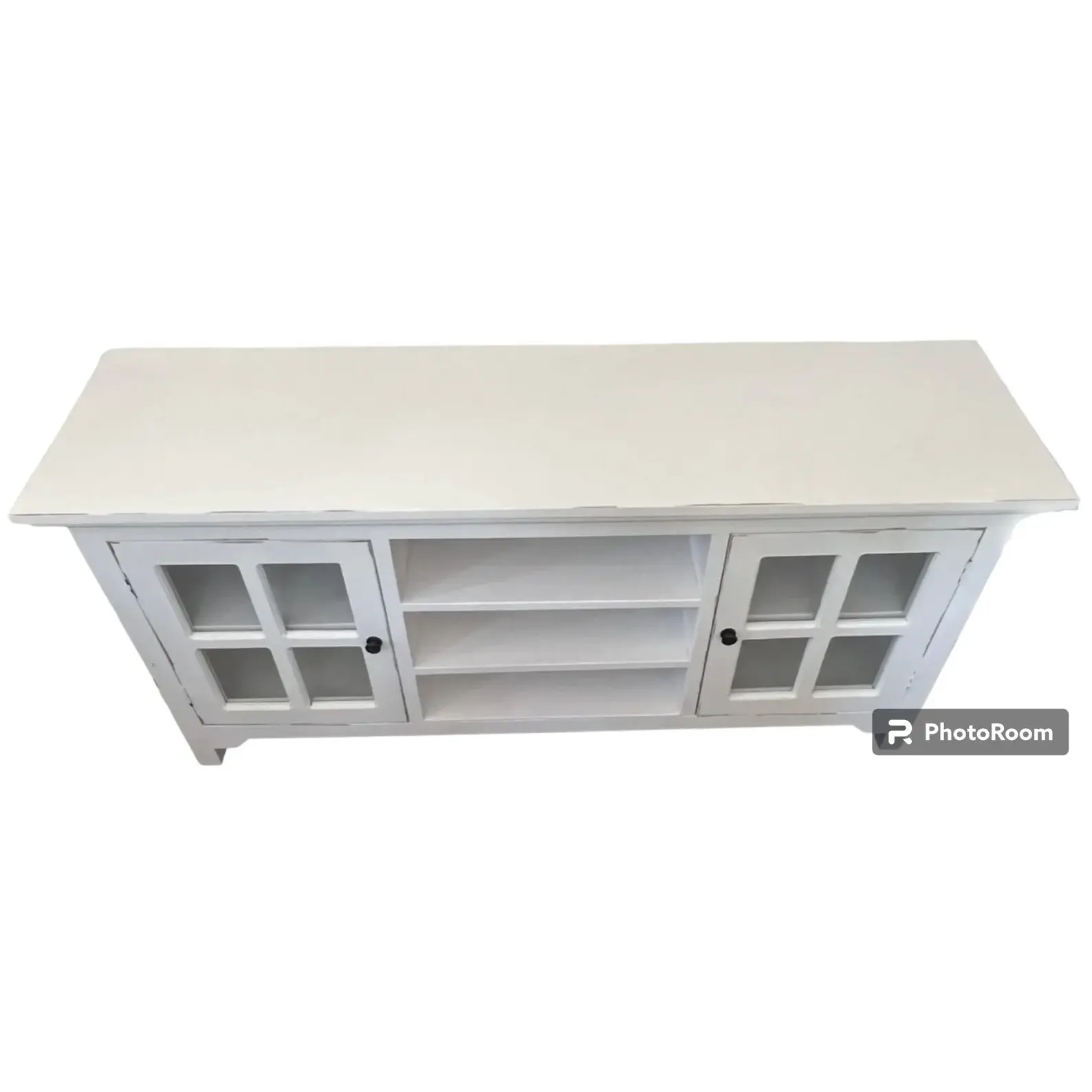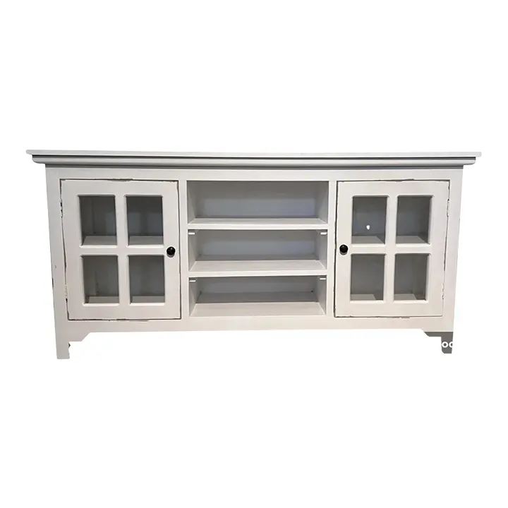 This Coastal media console cabinet features glass doors and open shelves, crafted from solid wood with a distressed white and driftwood finish.