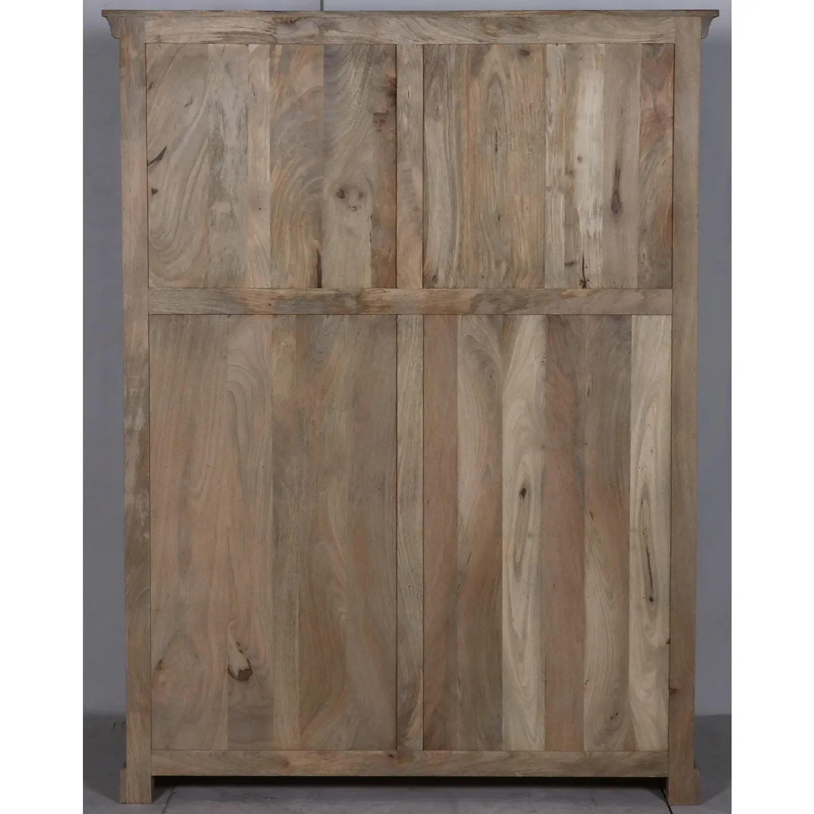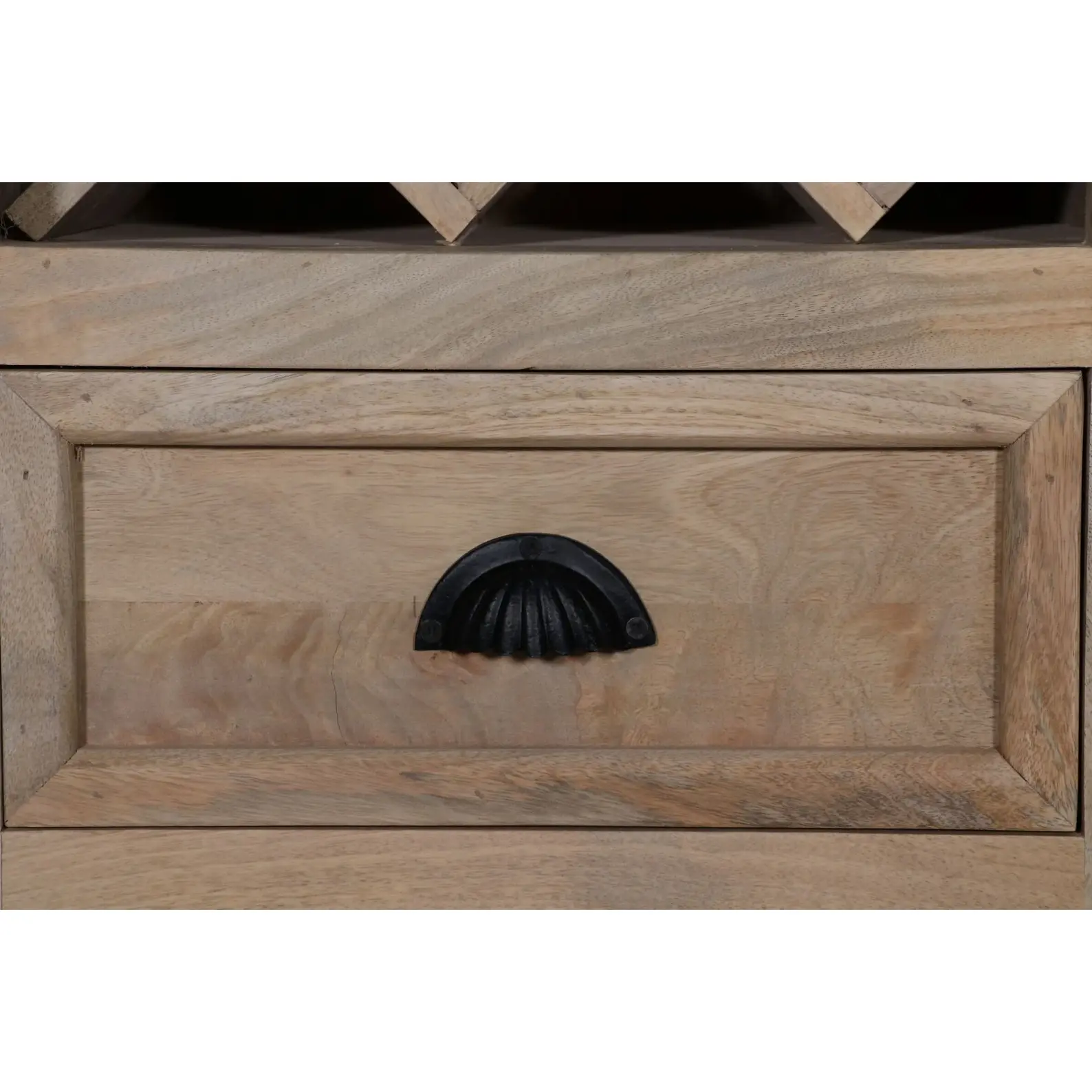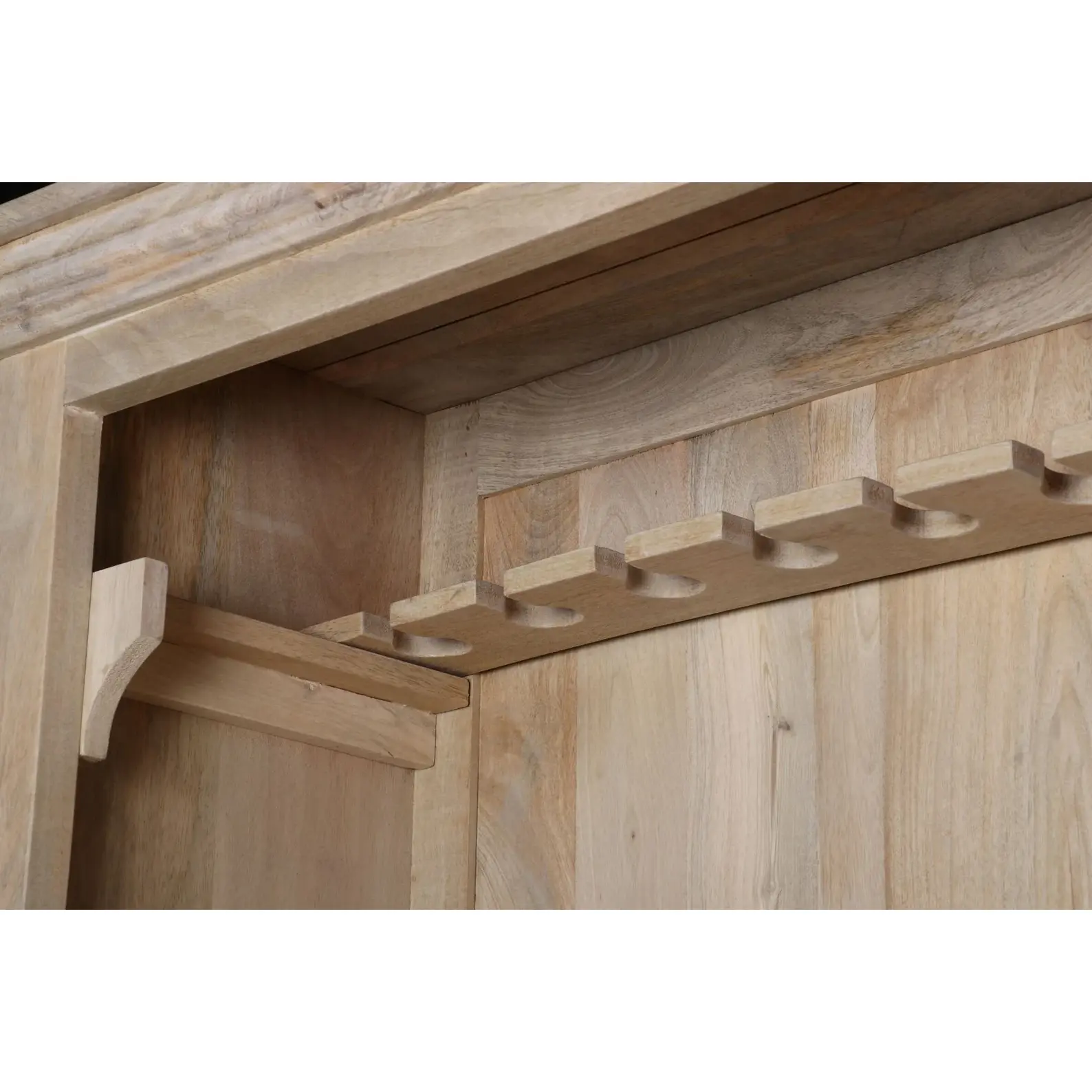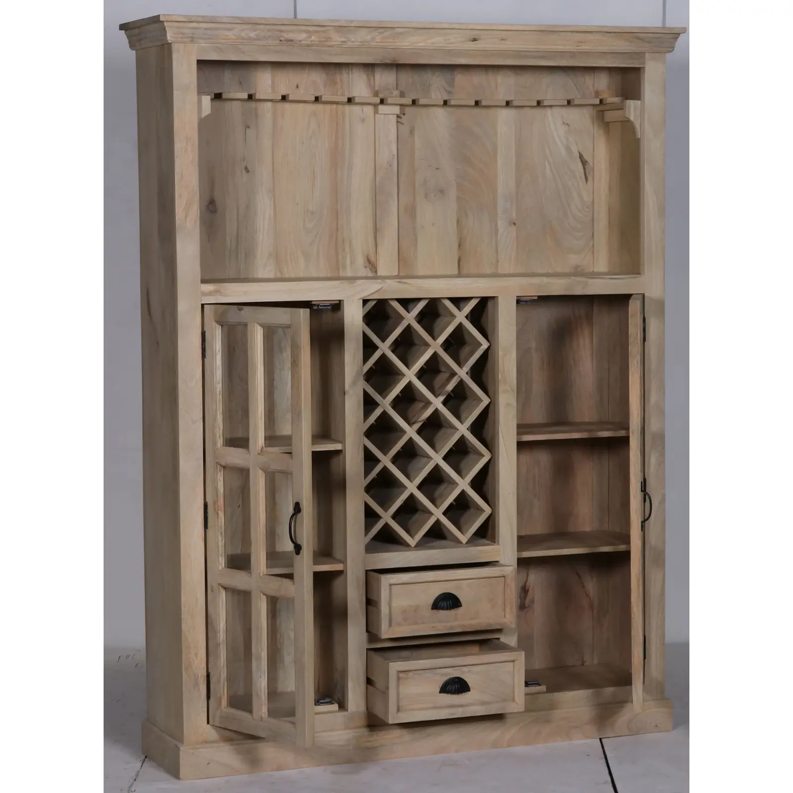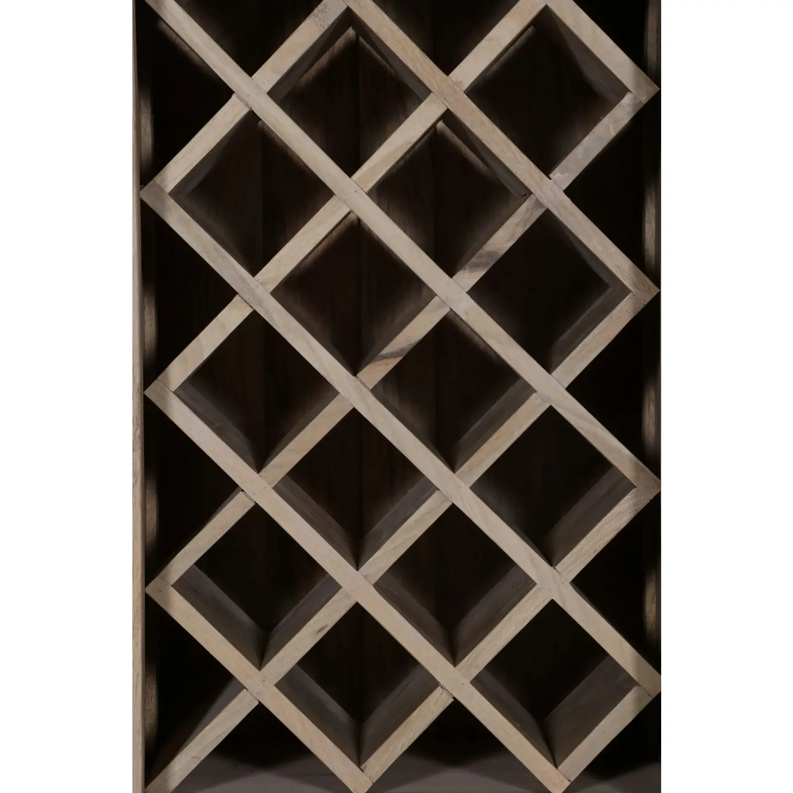 This contemporary Coastal wine rack liquor home bar cabinet is crafted from tall, narrow solid wood with a glass door and a driftwood finish.