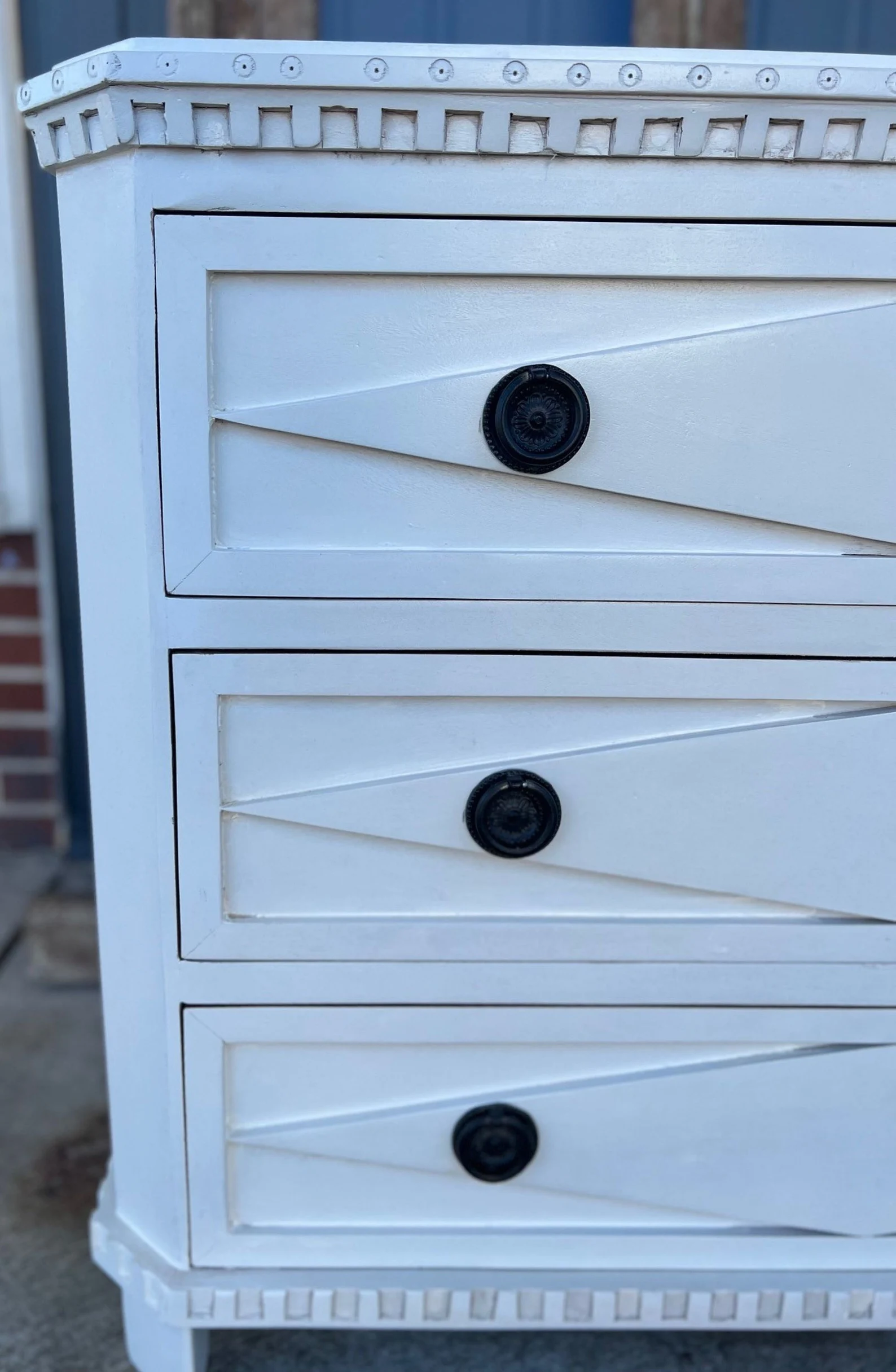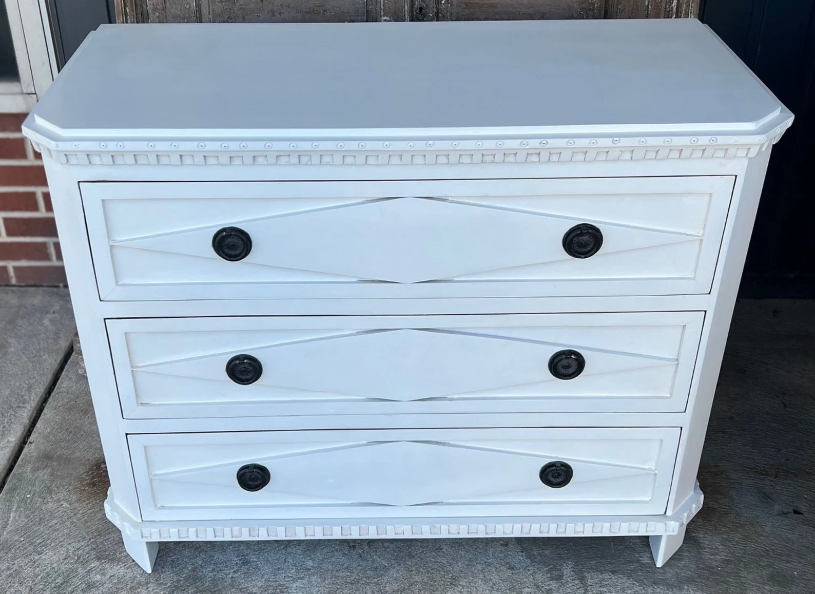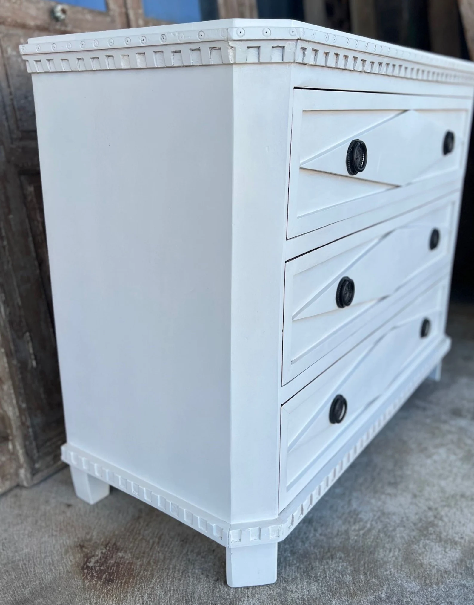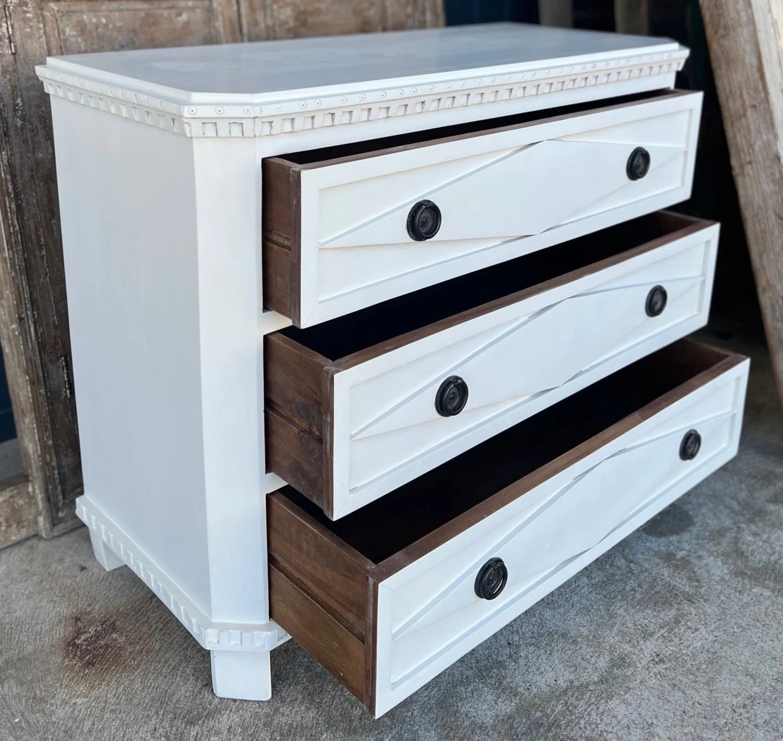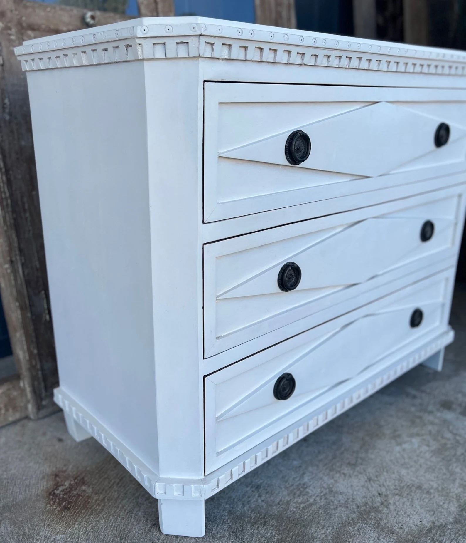 This Coastal Beach Marquise Diamond bachelor’s chest features three oversized drawers and is crafted from mango wood with a white finish, perfect as a dresser or nightstand.