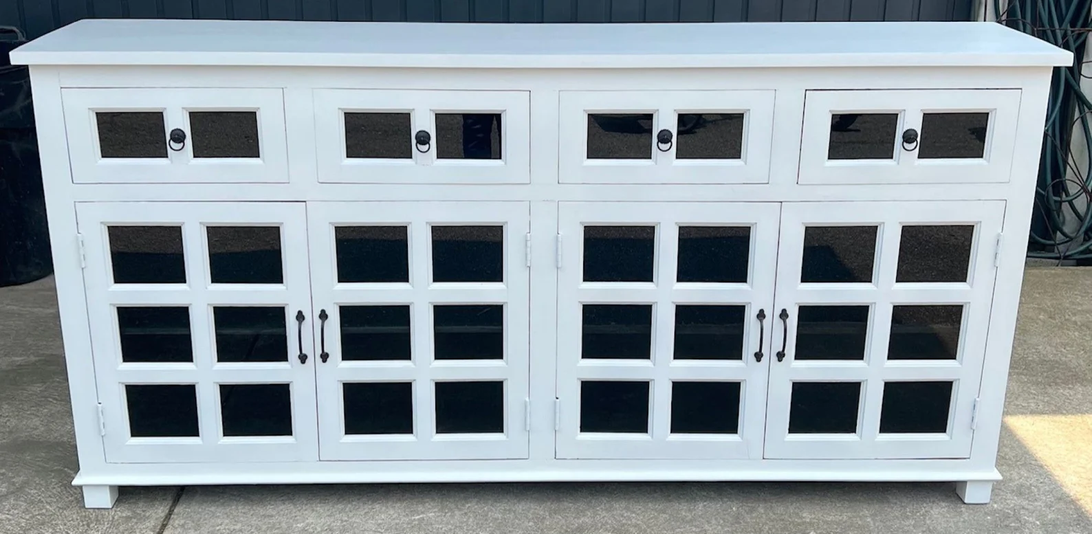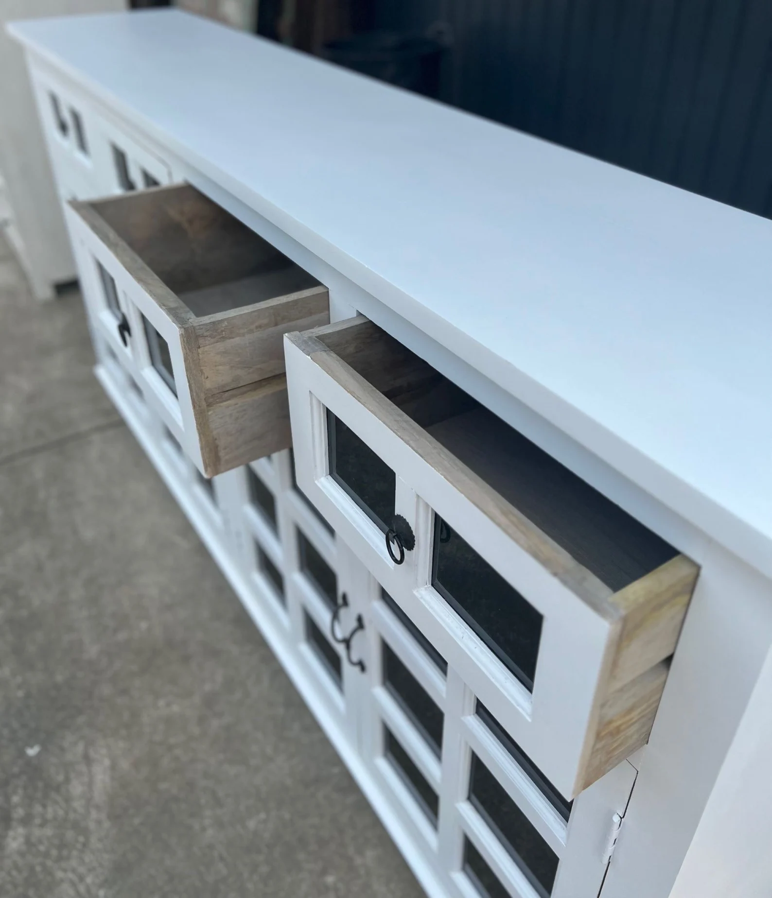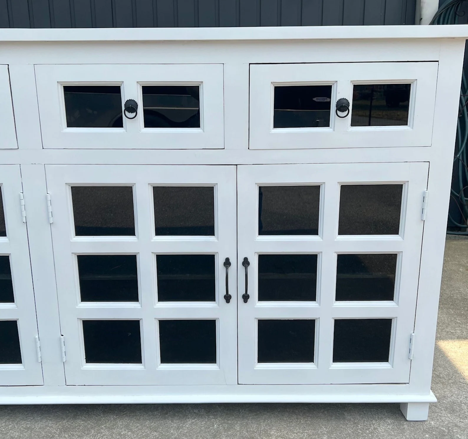 This contemporary Coastal entryway credenza features 32 smoked glass pane doors and drawers, offering a tall buffet server console in white.