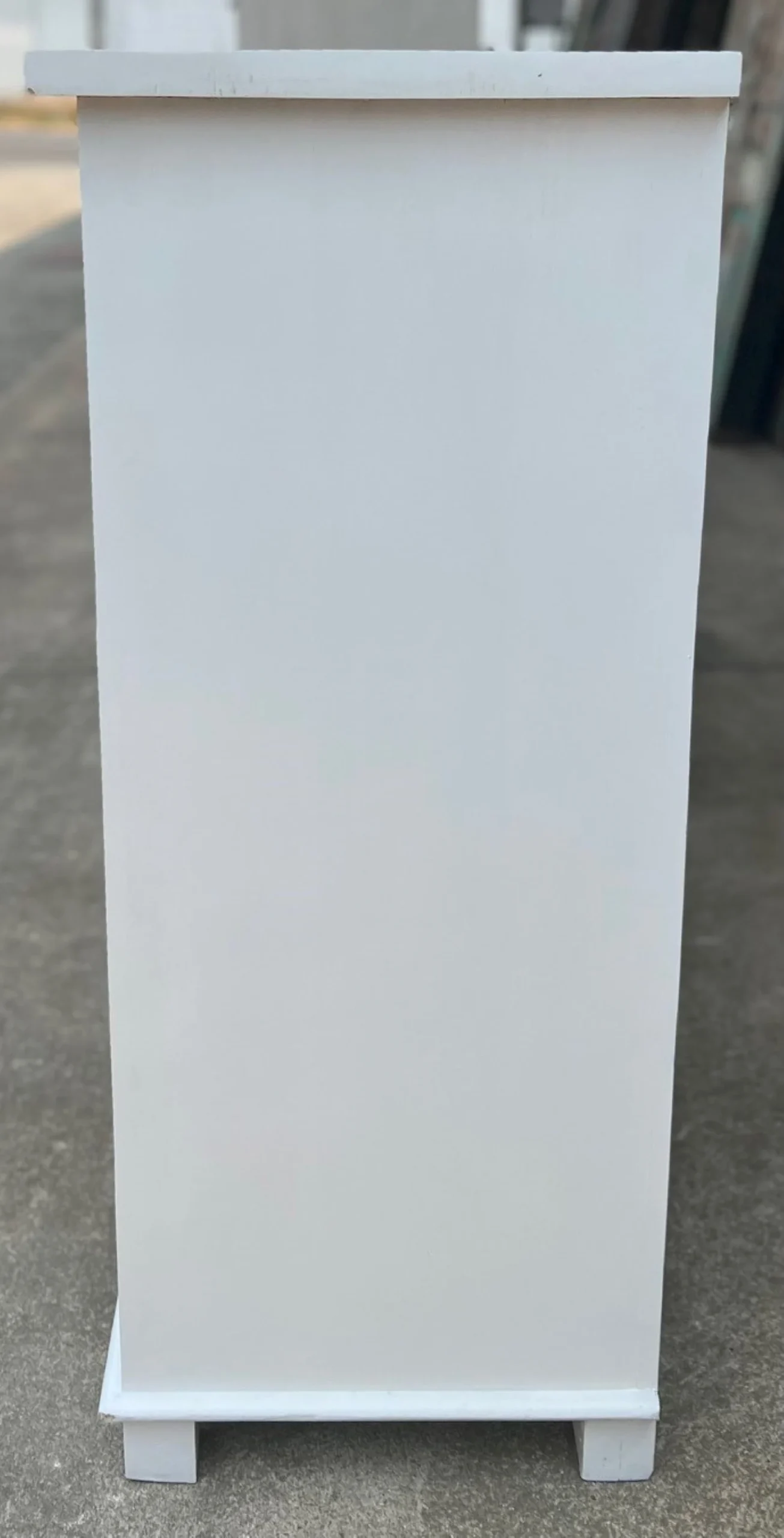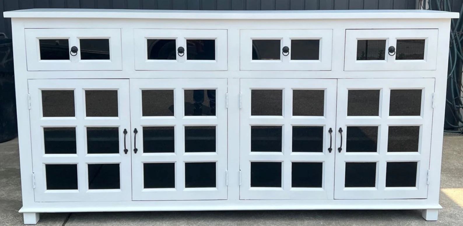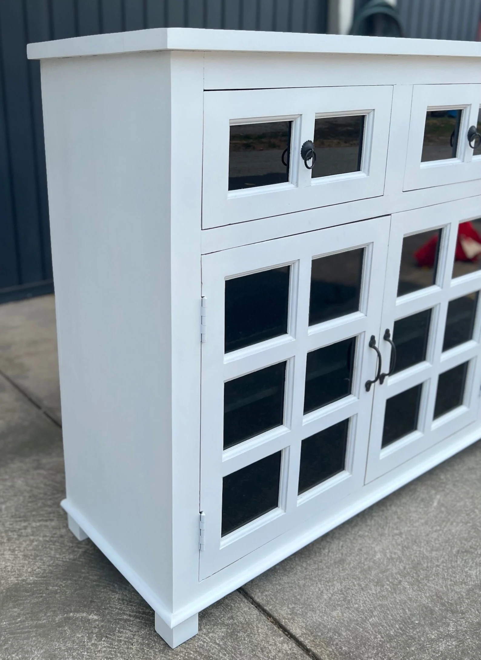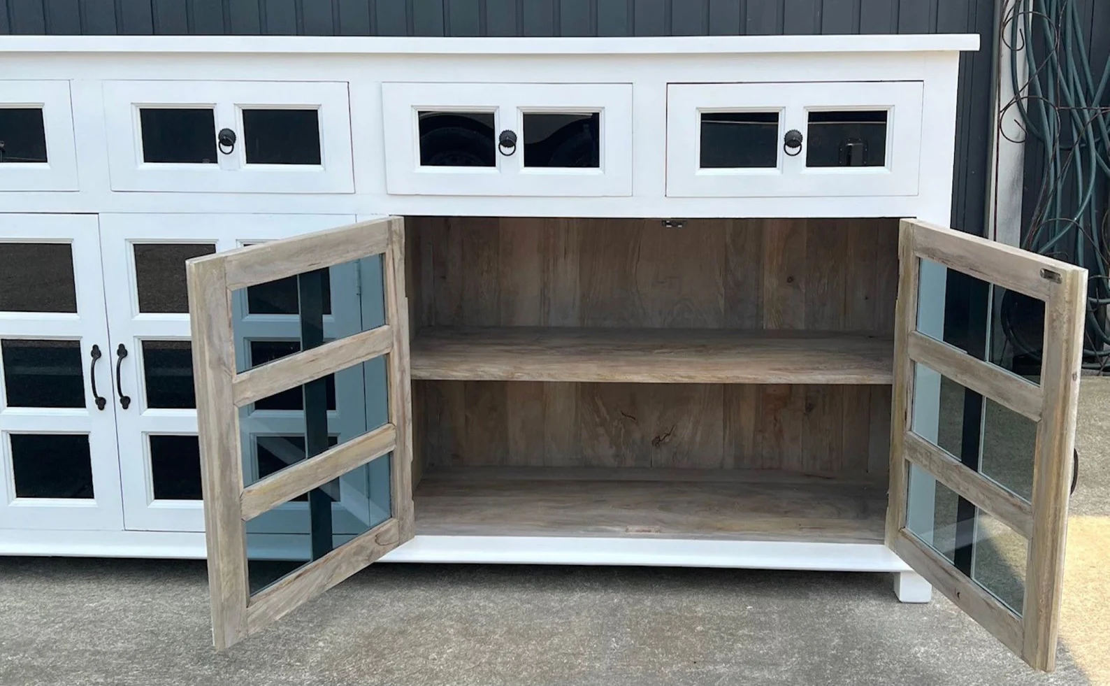This contemporary Coastal entryway credenza features 32 smoked glass pane doors and drawers, offering a tall buffet server console in white.