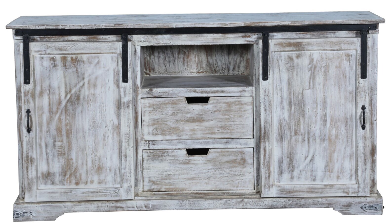 This Coastal Cottage TV stand is crafted from solid wood with a whitewash finish, measuring 5 feet long and featuring a sliding door, two center drawers, and open shelves, perfect as a media center or game console cabinet.