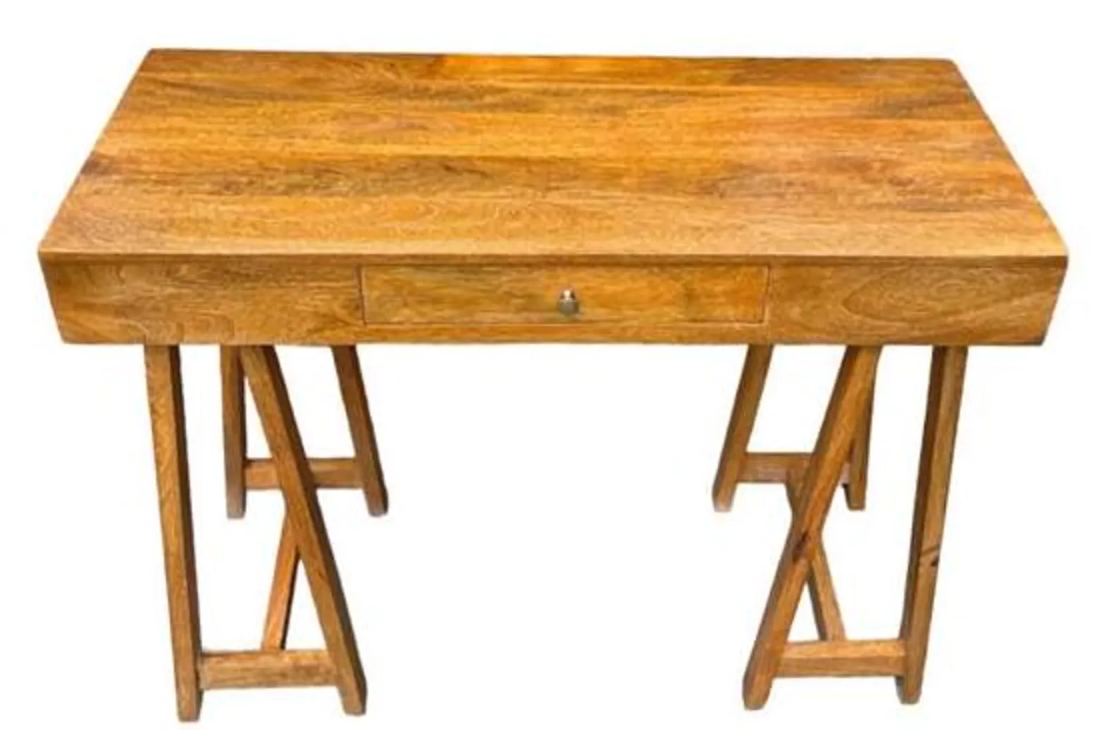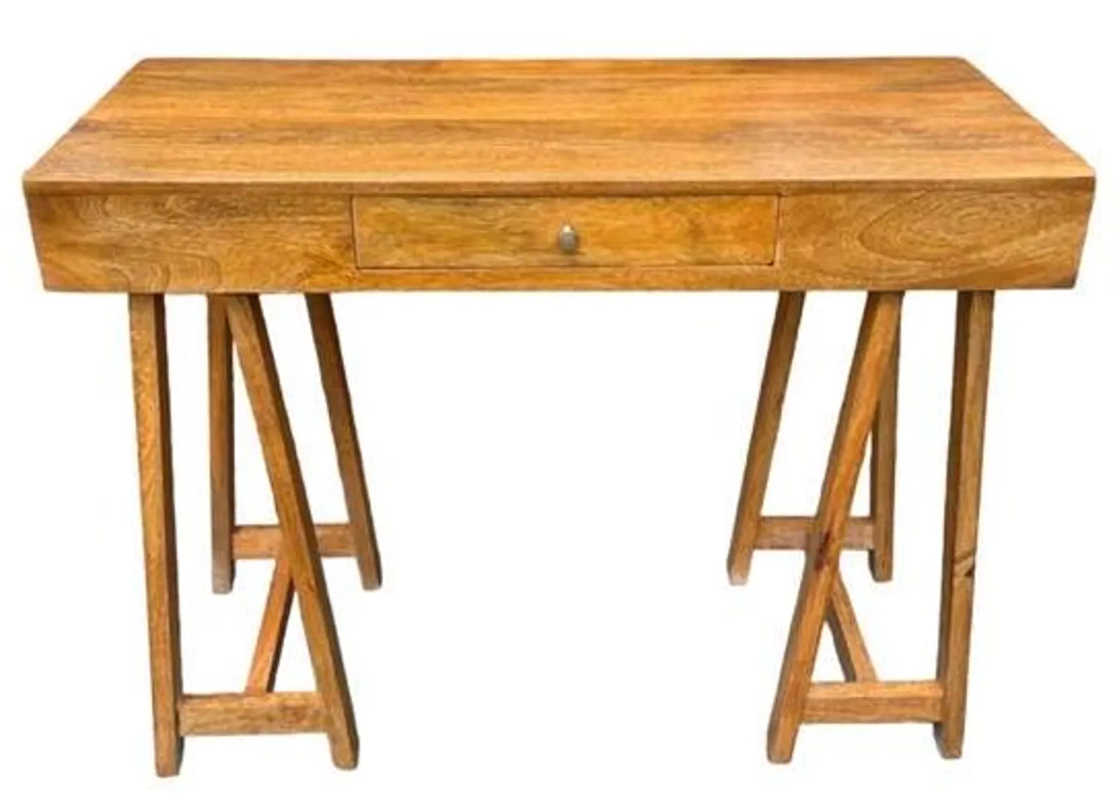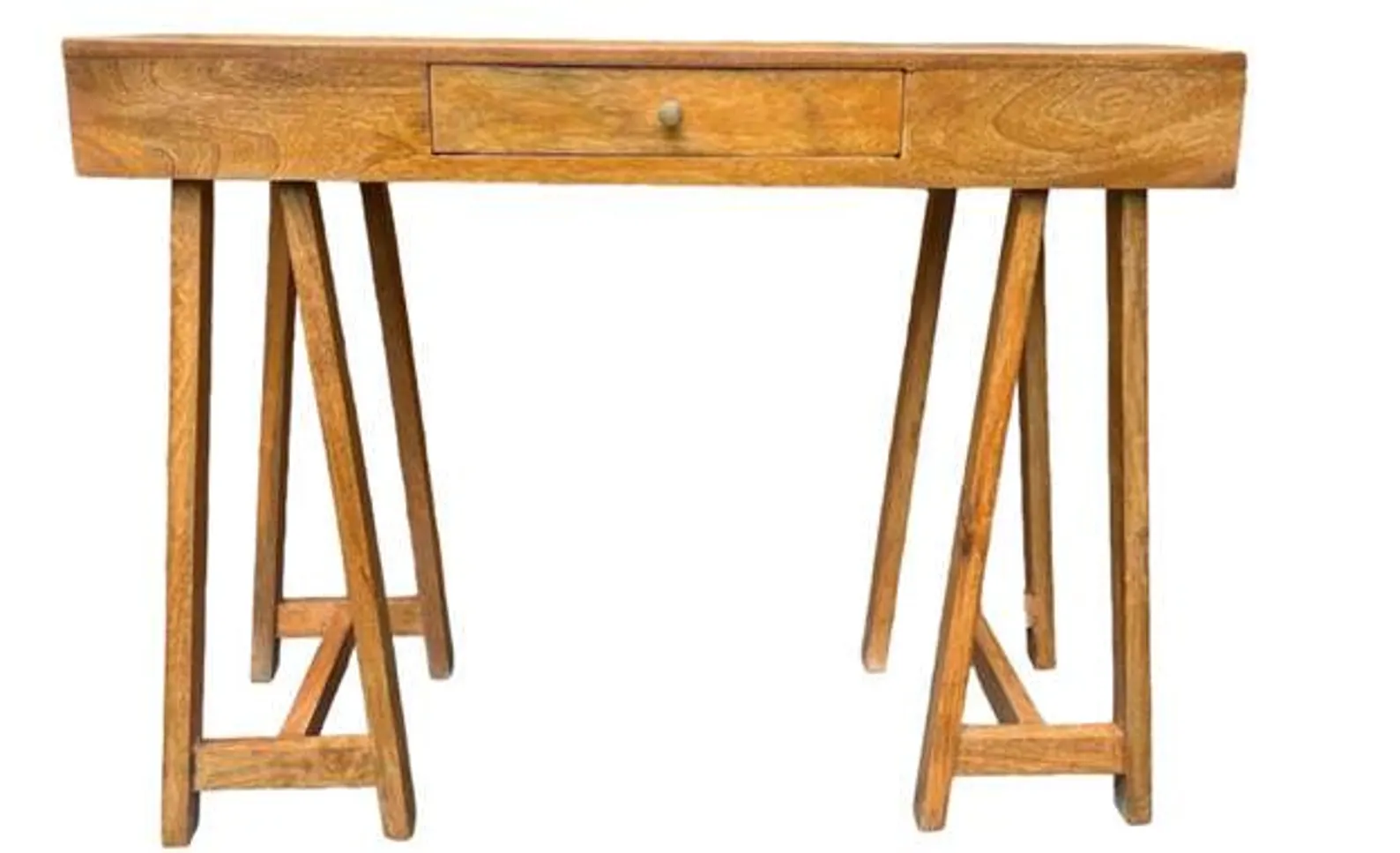 This compact, small-room-friendly desk features a single drawer and a sawhorse design, crafted from solid mango wood with a natural finish, perfect as a work table.