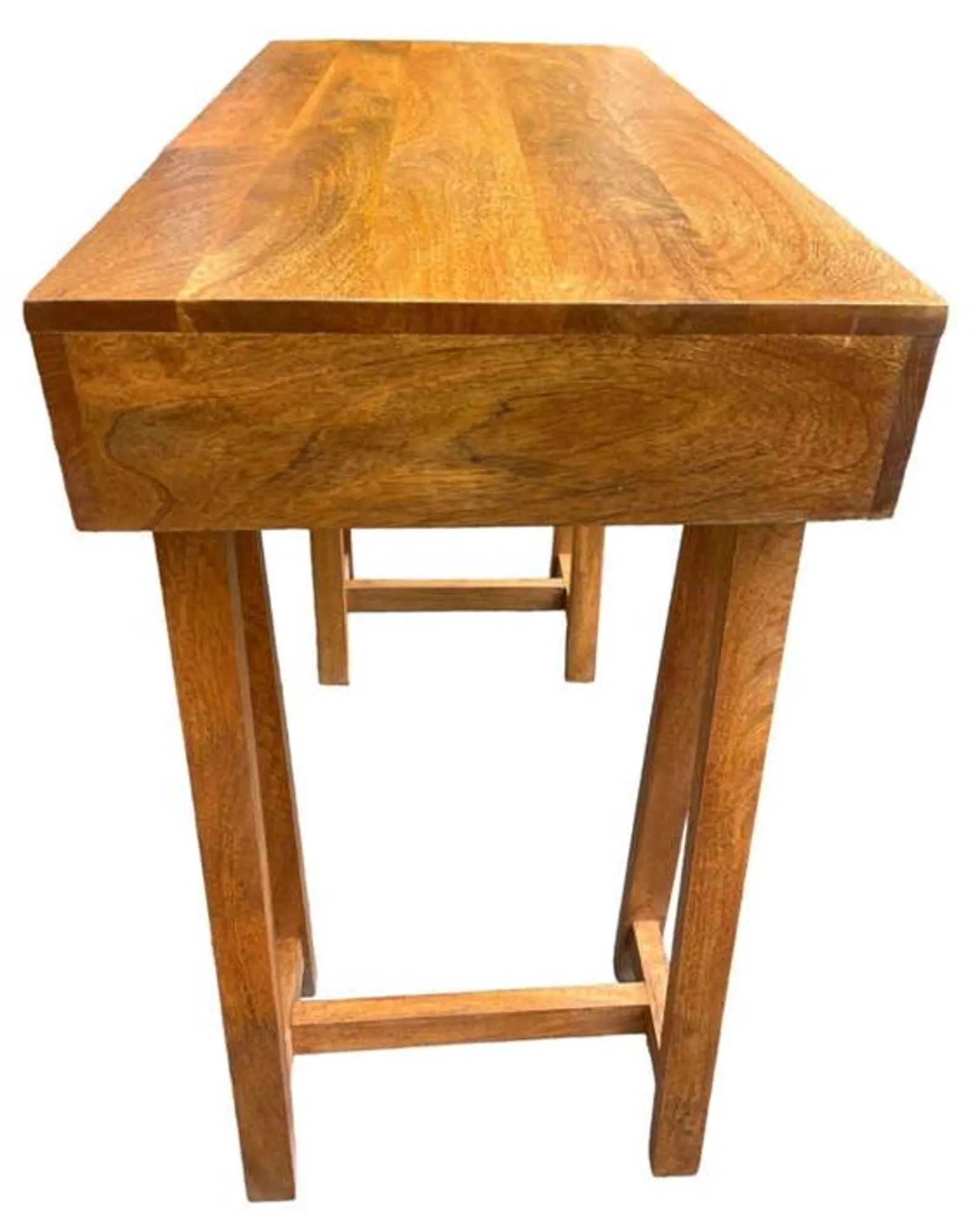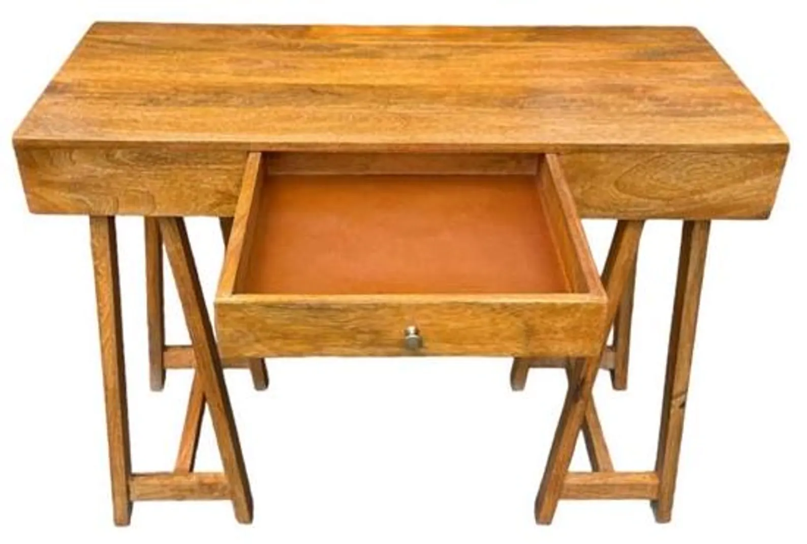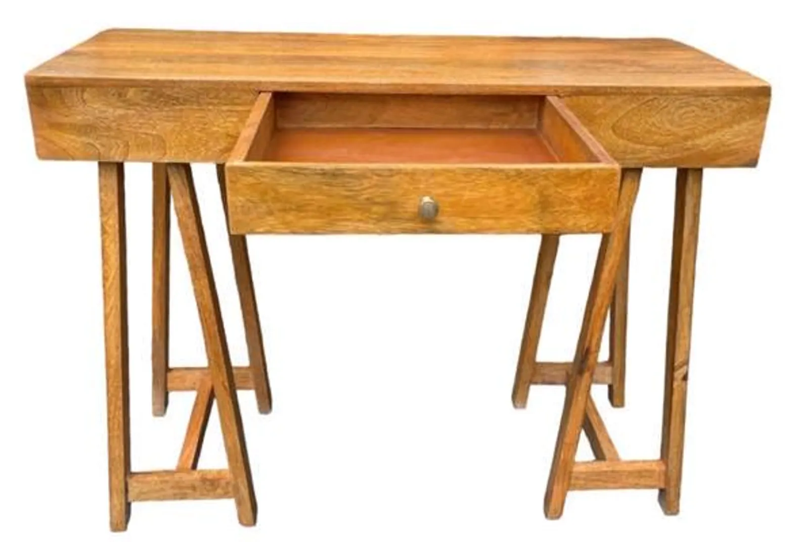 This compact, small-room-friendly desk features a single drawer and a sawhorse design, crafted from solid mango wood with a natural finish, perfect as a work table.