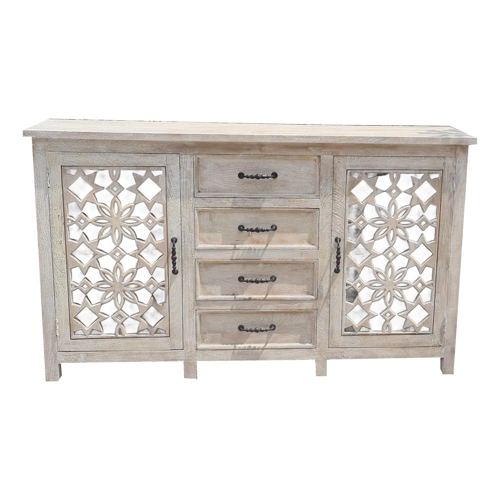 This Country Cottage Buffet Cabinet features floral carving, two doors, and four center drawers in a whitewashed mango wood design.