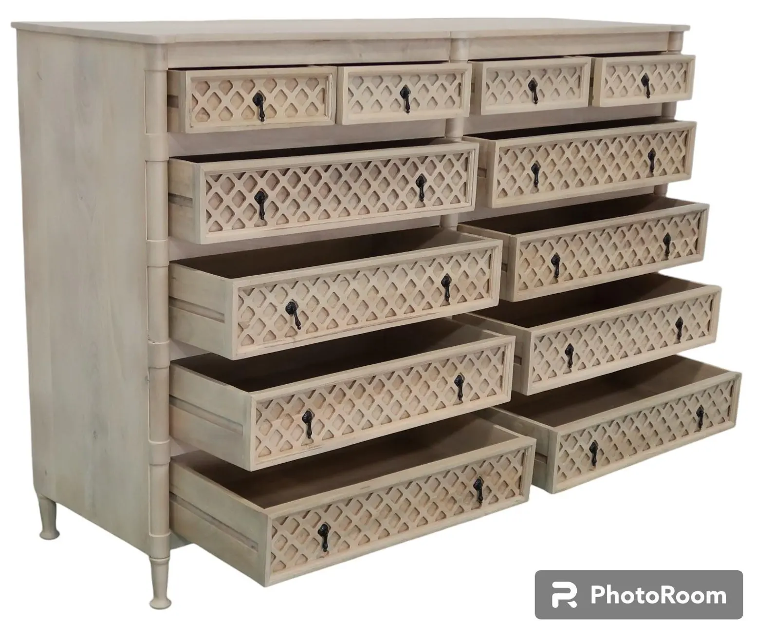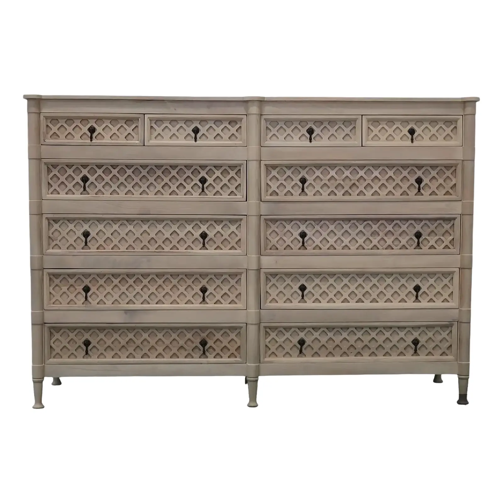 This extra-large Country Farmhouse rustic chest boasts 12 drawers and is crafted from solid mango wood, offering an oversized tall and wide double bedroom highboy dresser in a natural finish.