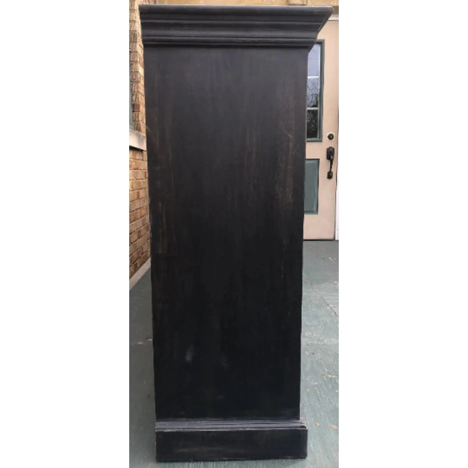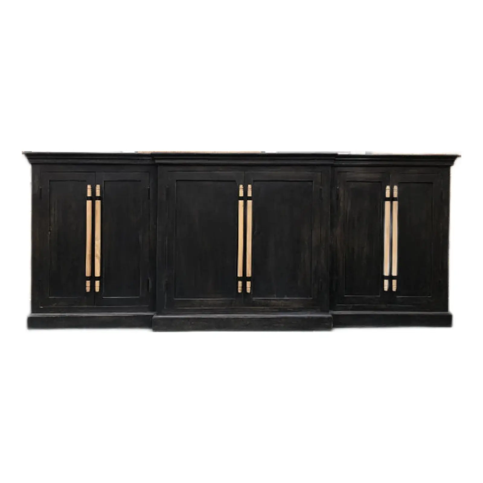 This 100-inch long tall French Country credenza is 8 feet long with a weathered black finish, crafted from solid wood, perfect as an entryway media console cabinet, dining buffet server, or large sideboard.