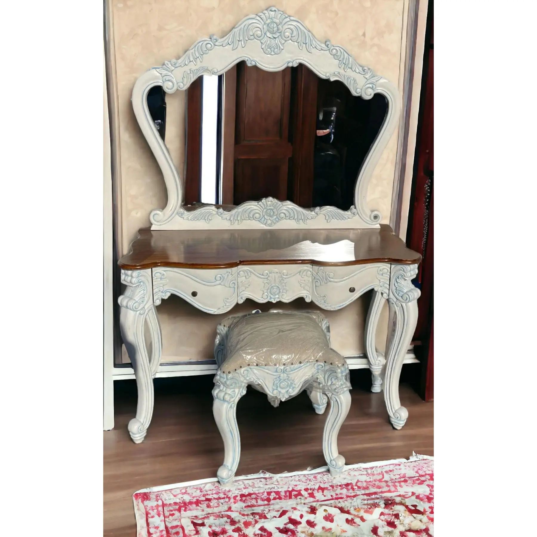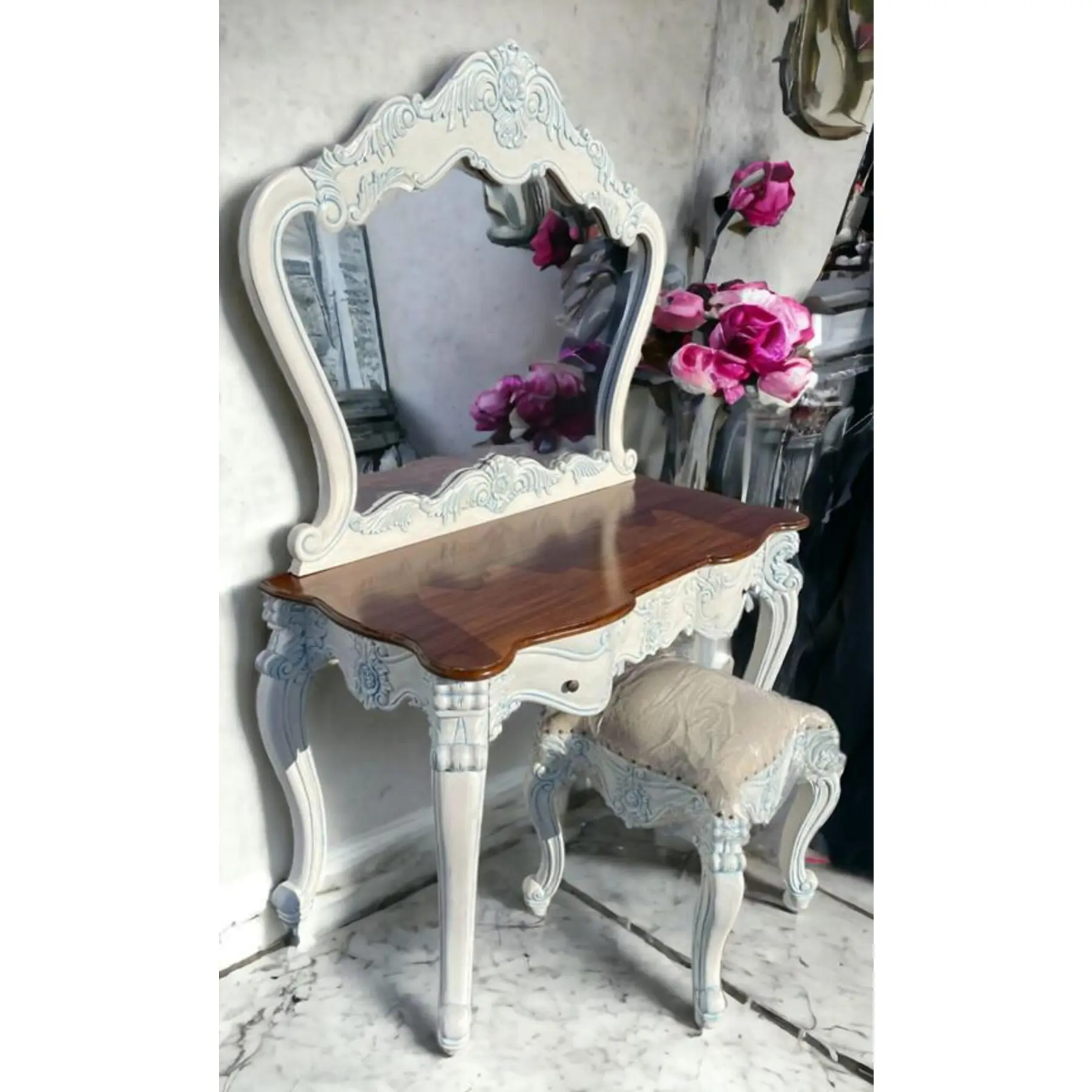 This French Country Vintage Style Old Paris French bedroom makeup vanity is crafted from solid wood, featuring a dressing table with a mirror and stool.