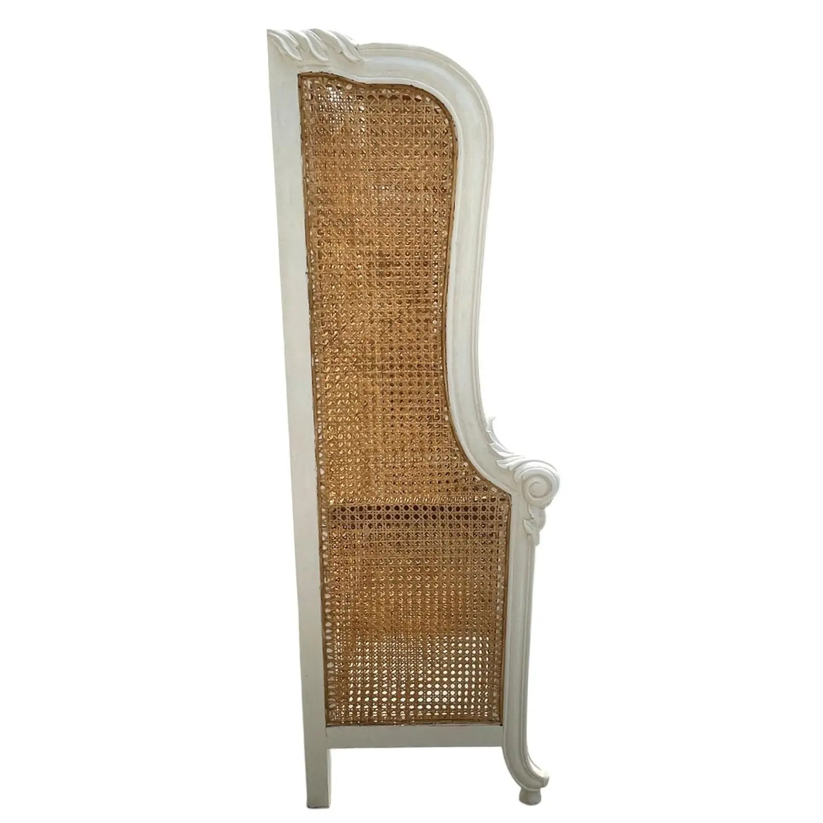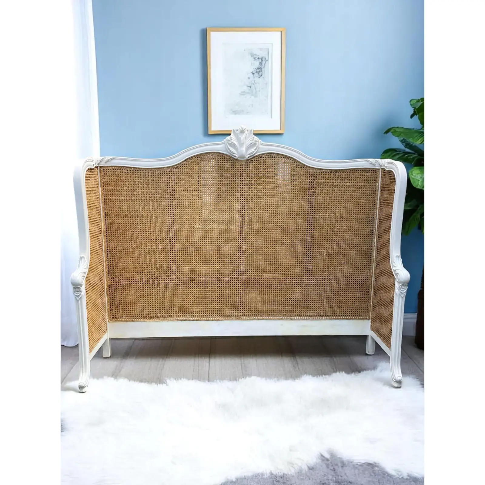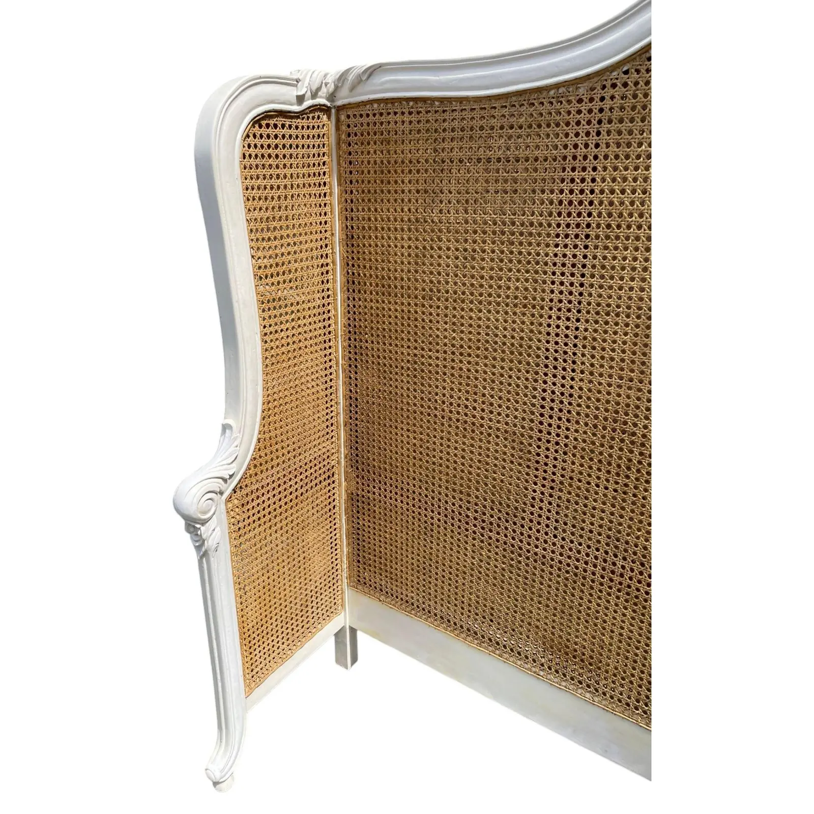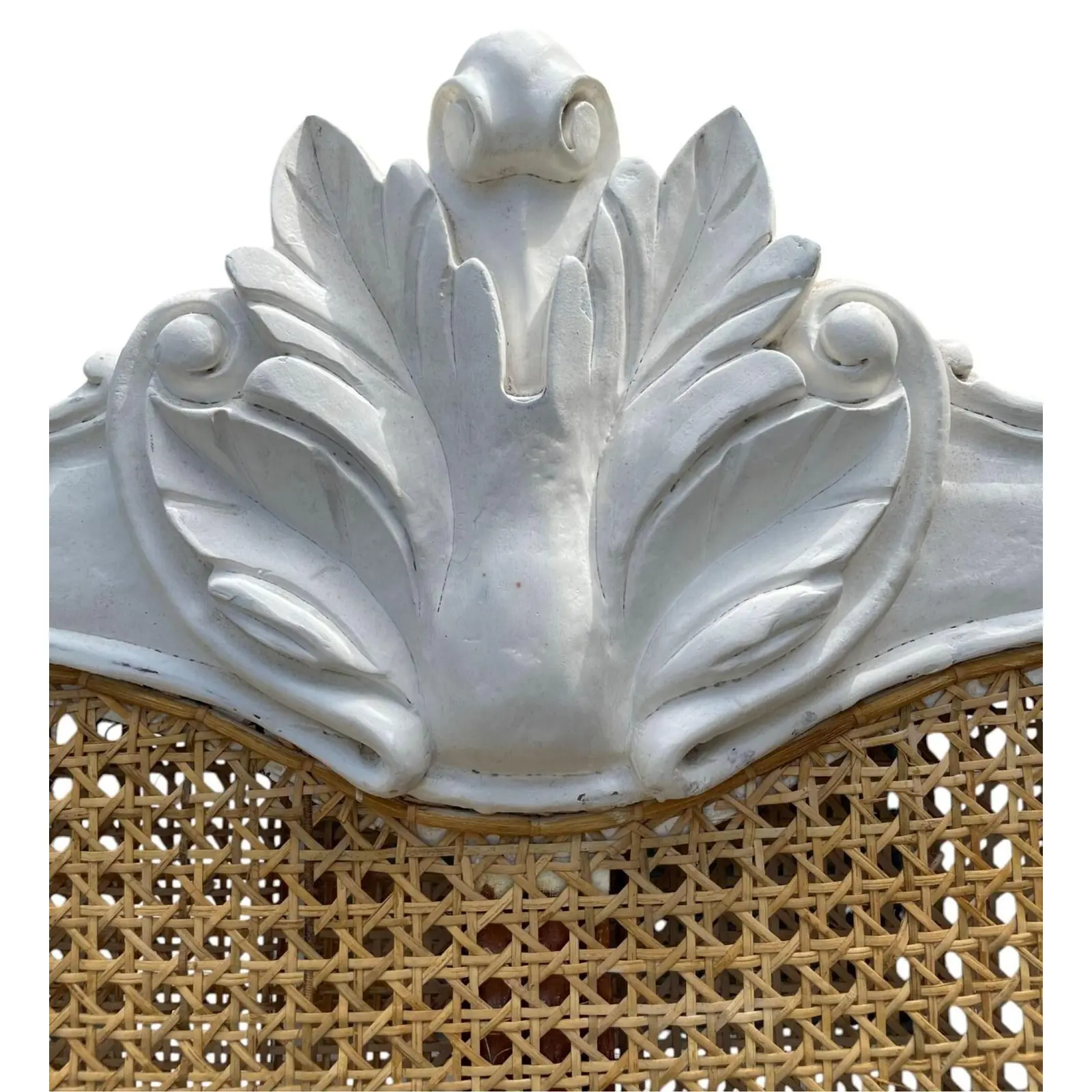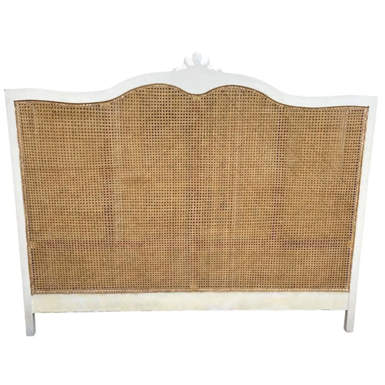 The French Regency King Headboard is made of white mahogany and natural rattan in a grand wraparound style with cane detailing.