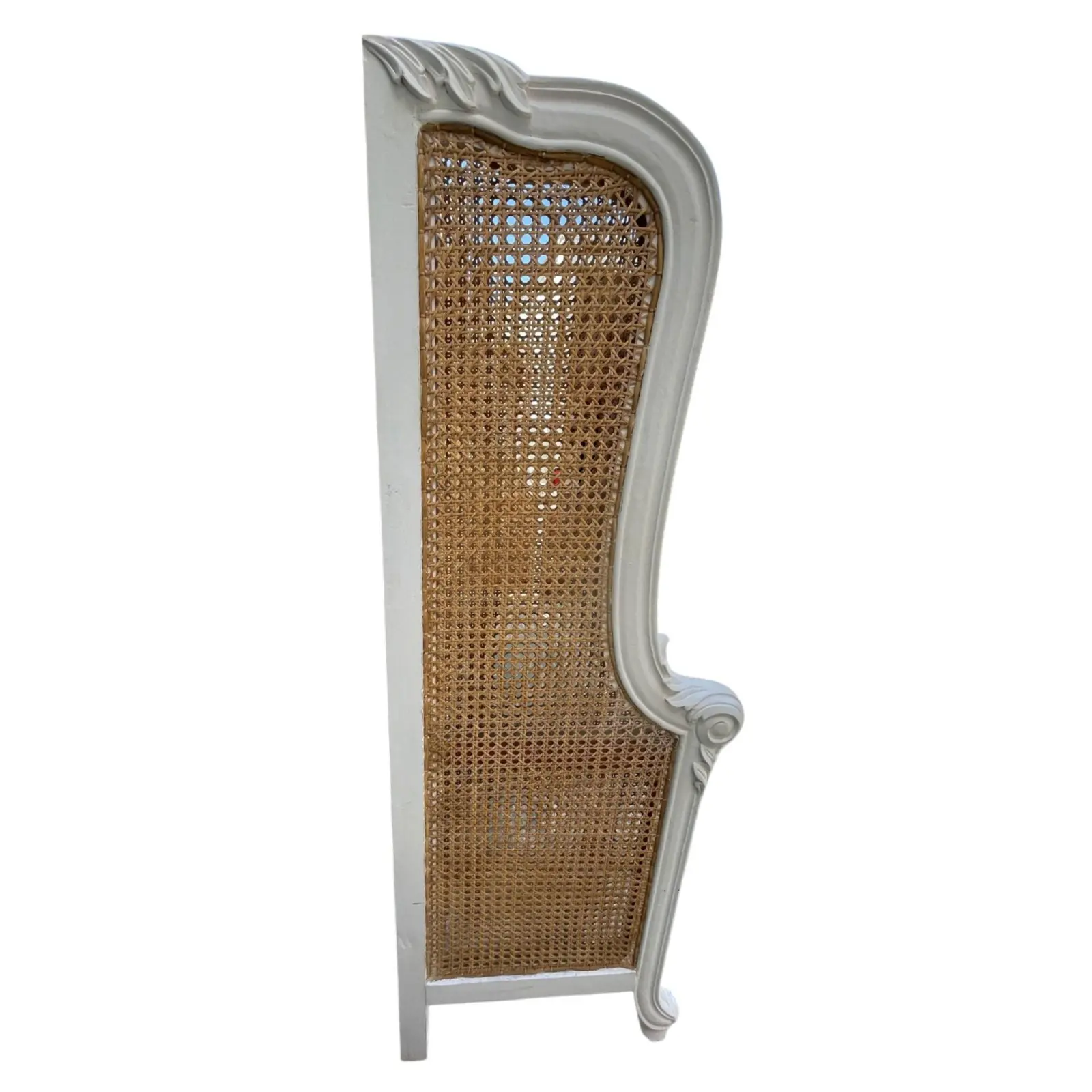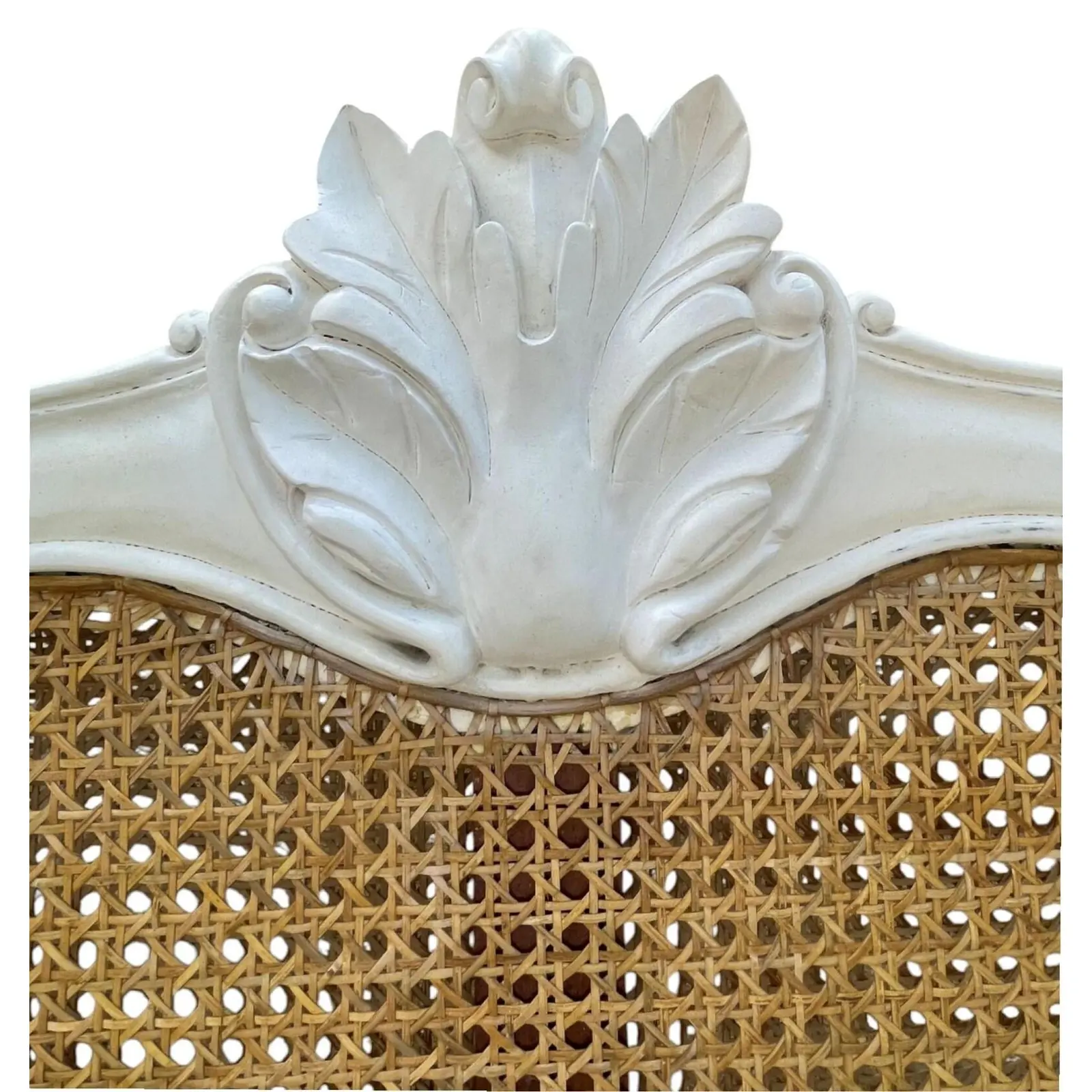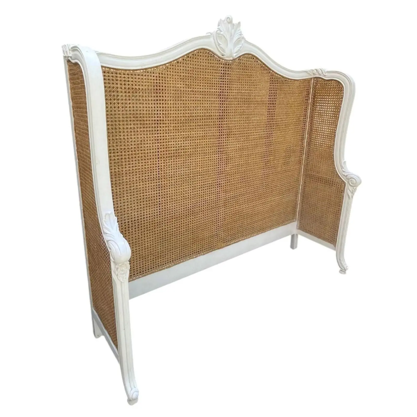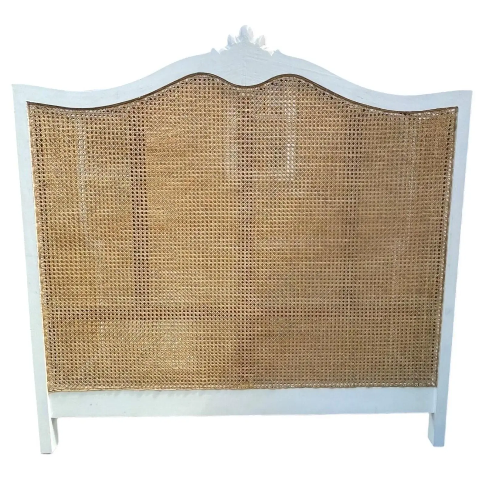 The French Regency Queen Headboard features a double-hole cane design with natural rattan and white mahogany wood in an oversized wraparound form.