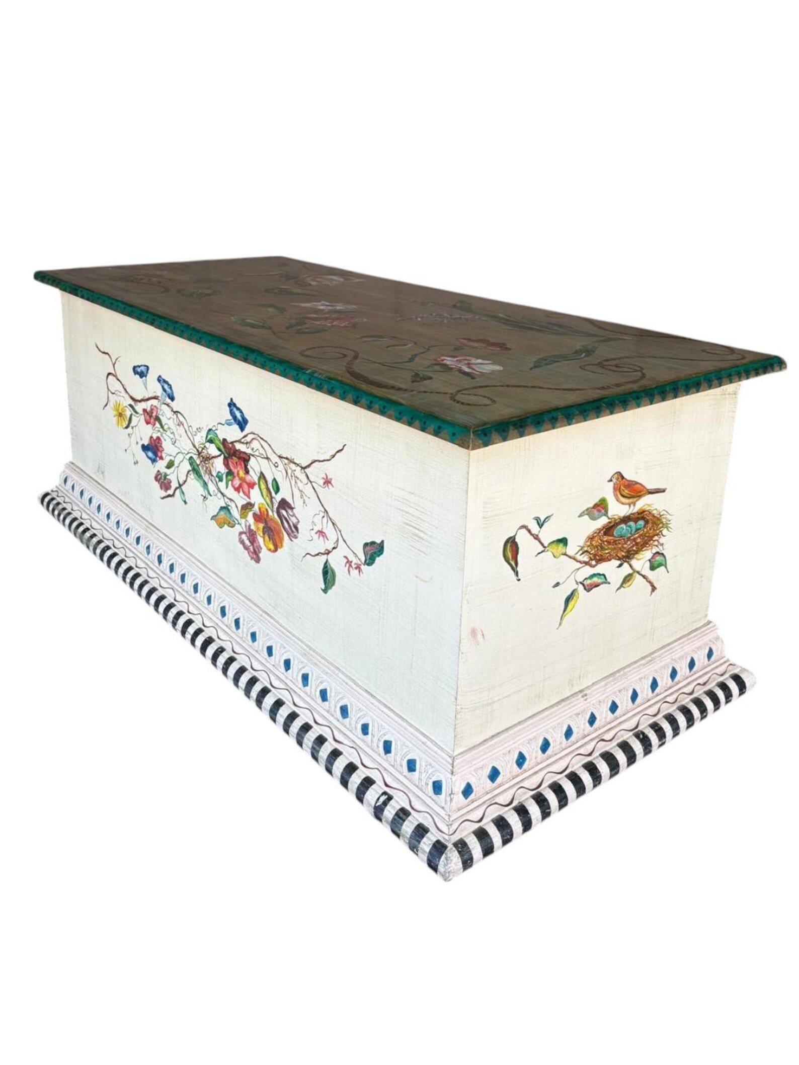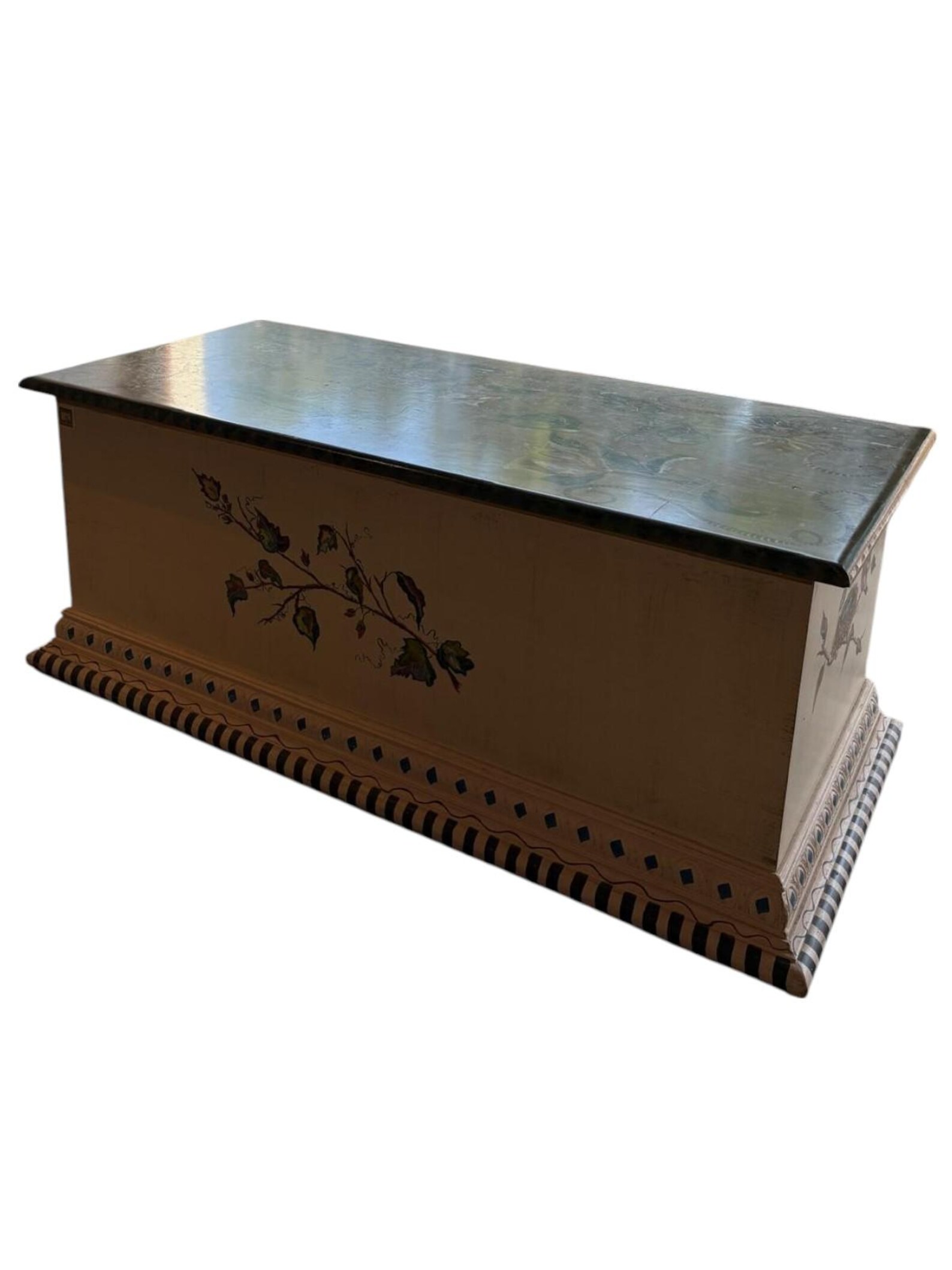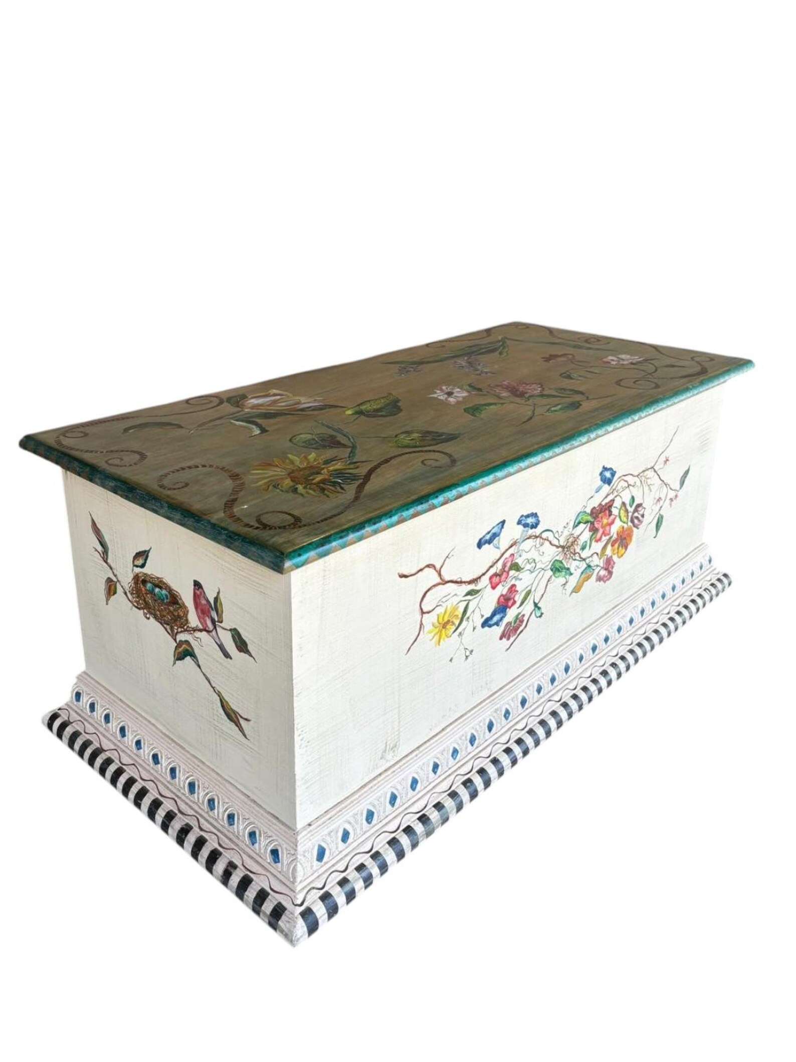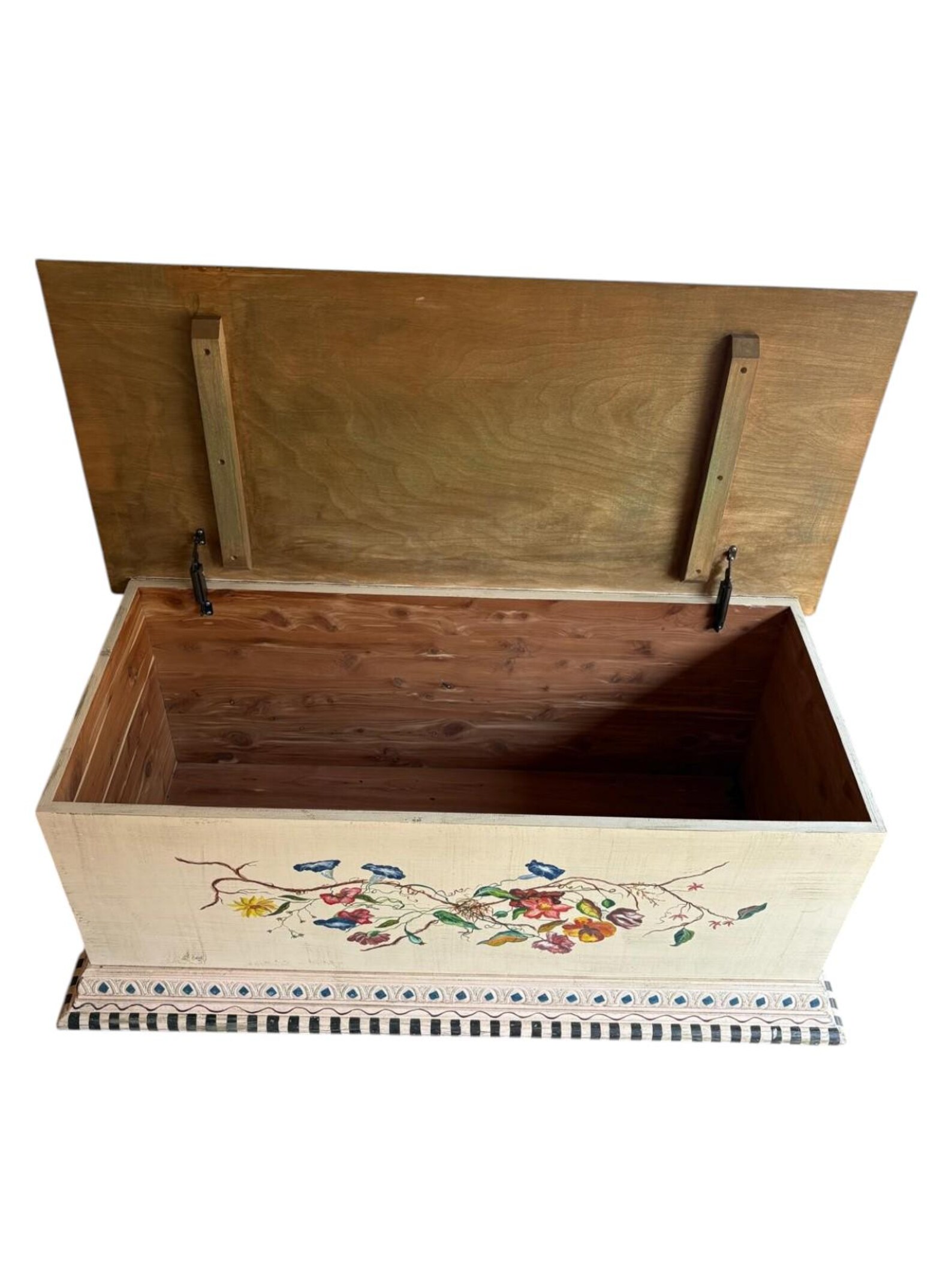 Solid wood custom hand painted trunk. Ideal for storing linens, end of bed blankets, or could serve as a coffee table! Farmhouse style and made of solid wood.