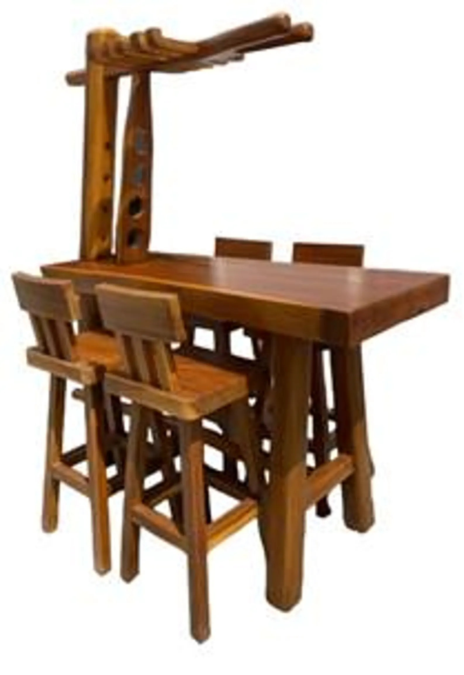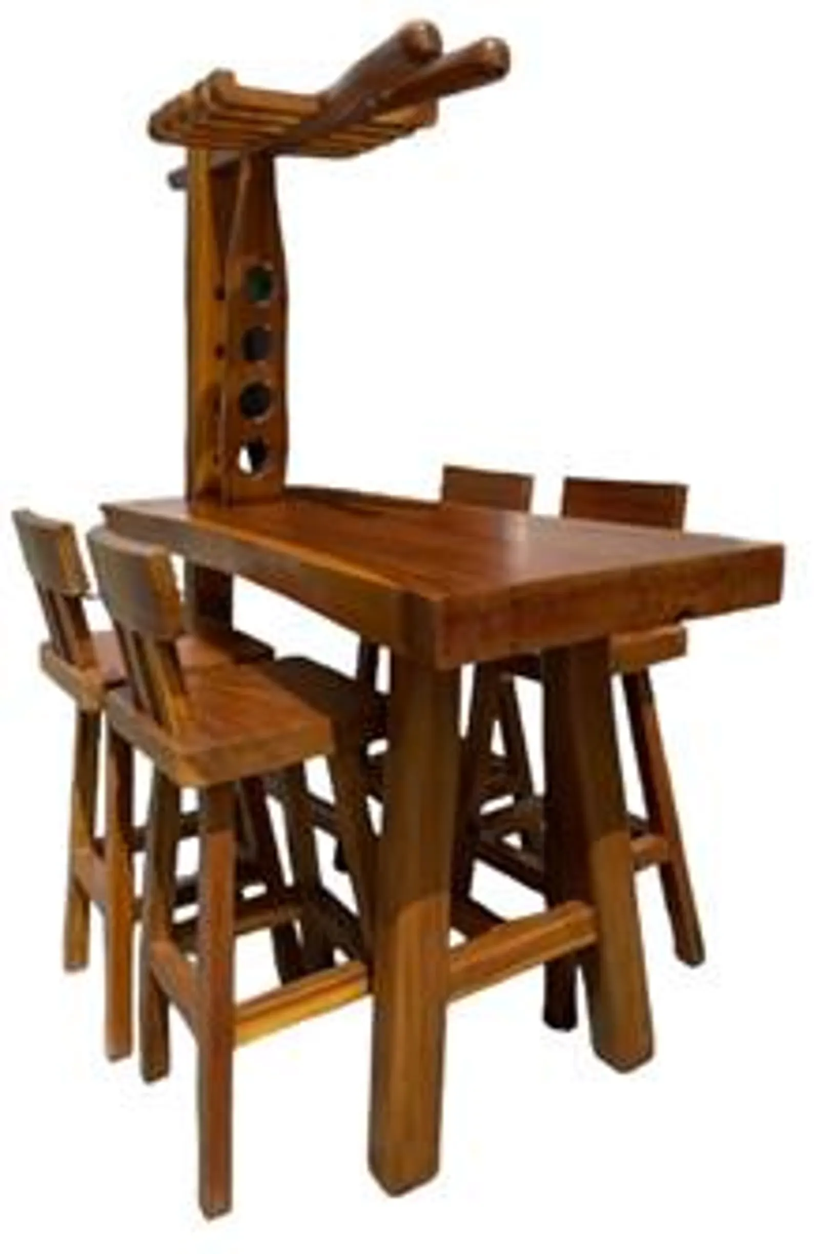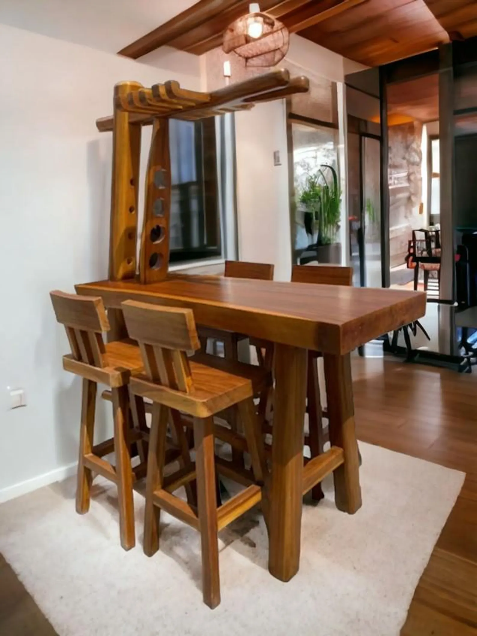 This indoor/outdoor deck patio garden set includes a tall pub table and four stools, crafted from solid teak wood, featuring a bar counter with liquor/wine bottle holders and a stemware rack.