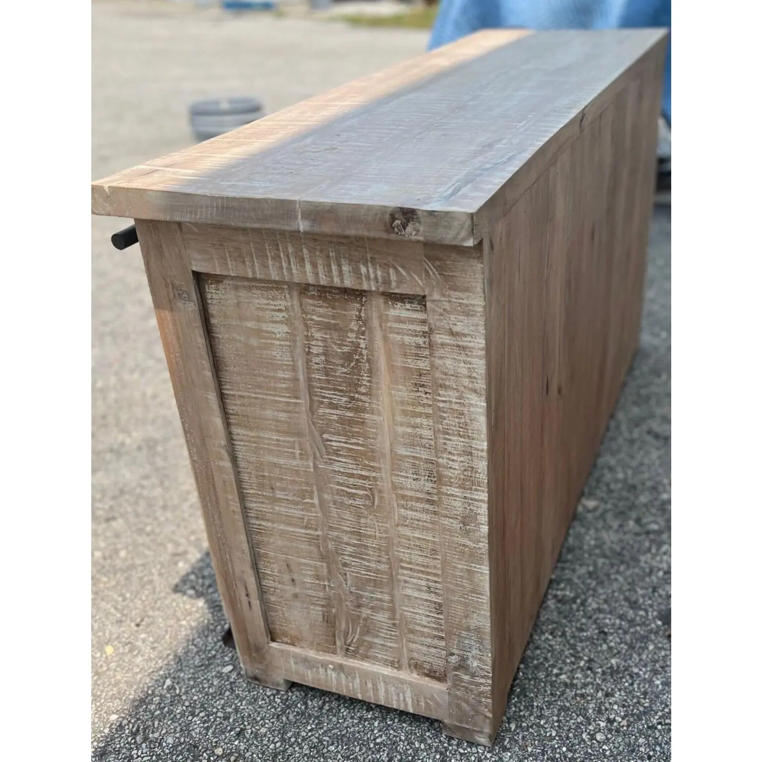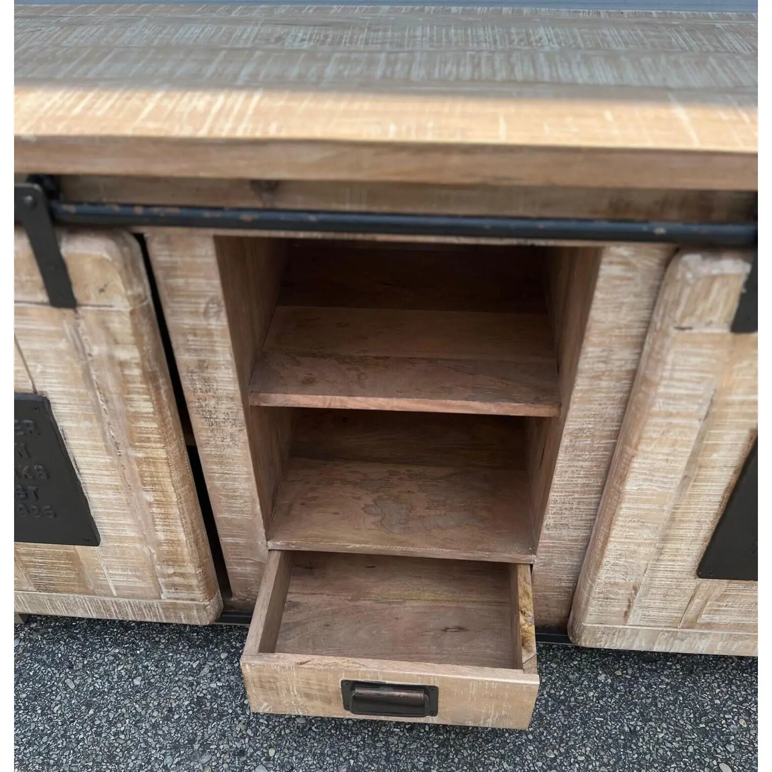 This industrial Jupiter media cabinet features an iron sliding door and solid wood construction, offering a narrow open shelf rustic design with a lime wash finish.