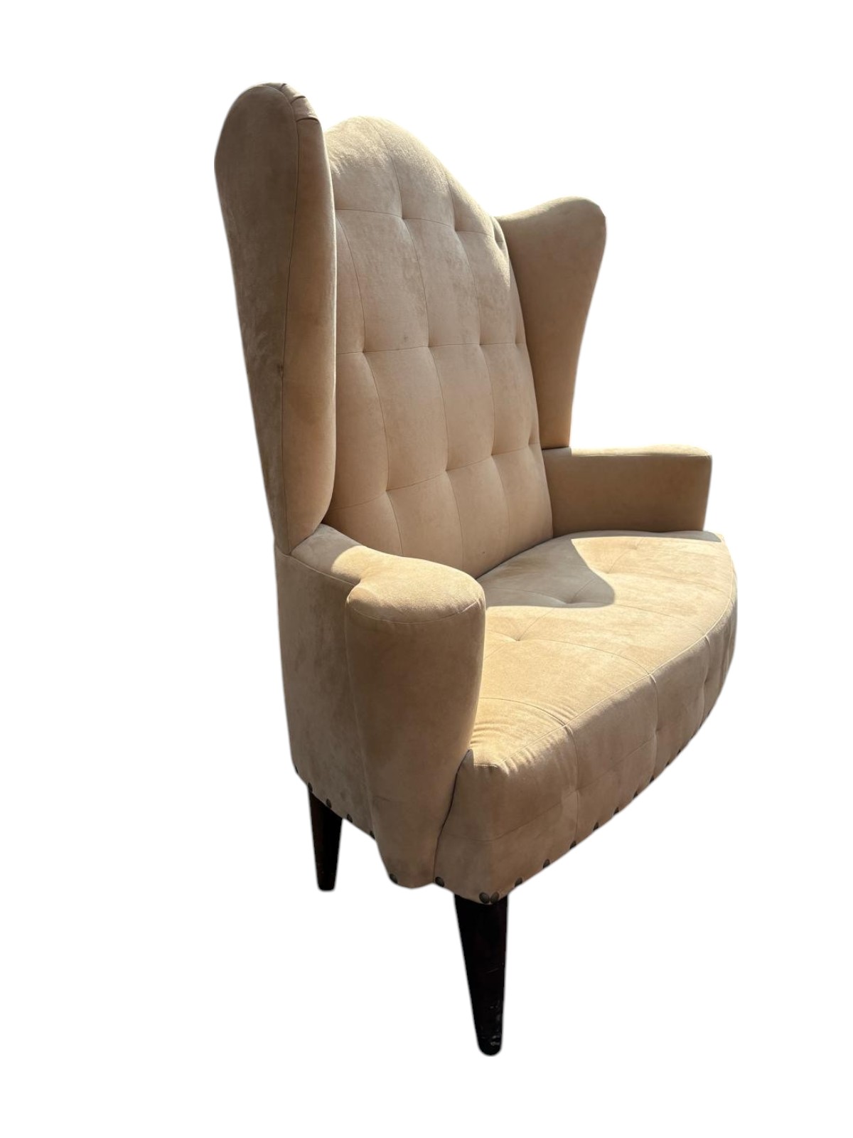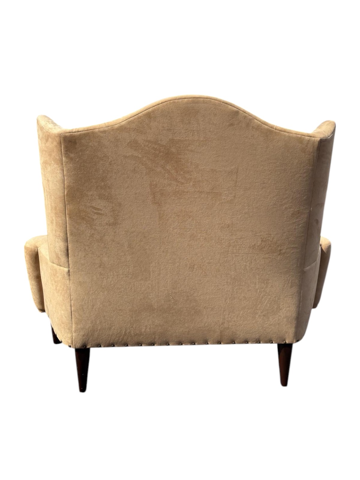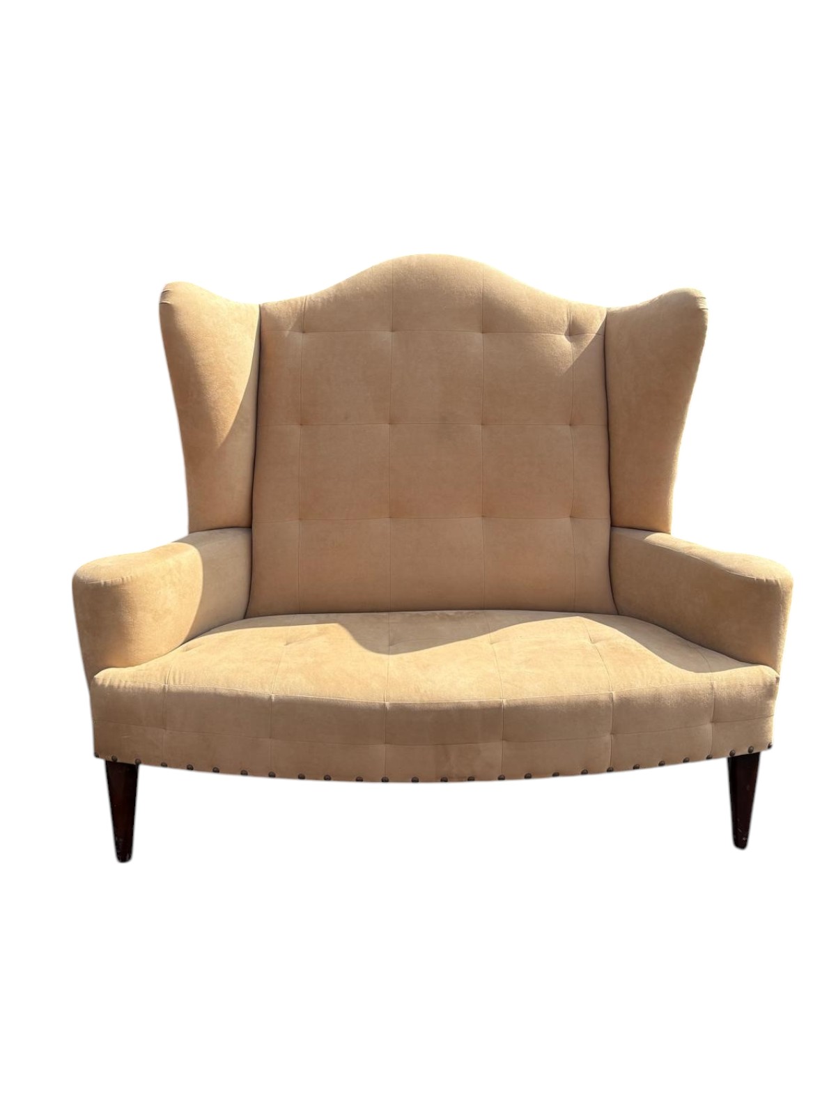 High back tan suede love seat with nailhead trim around the bottom. Upholstery is in good condition. The legs are wood.