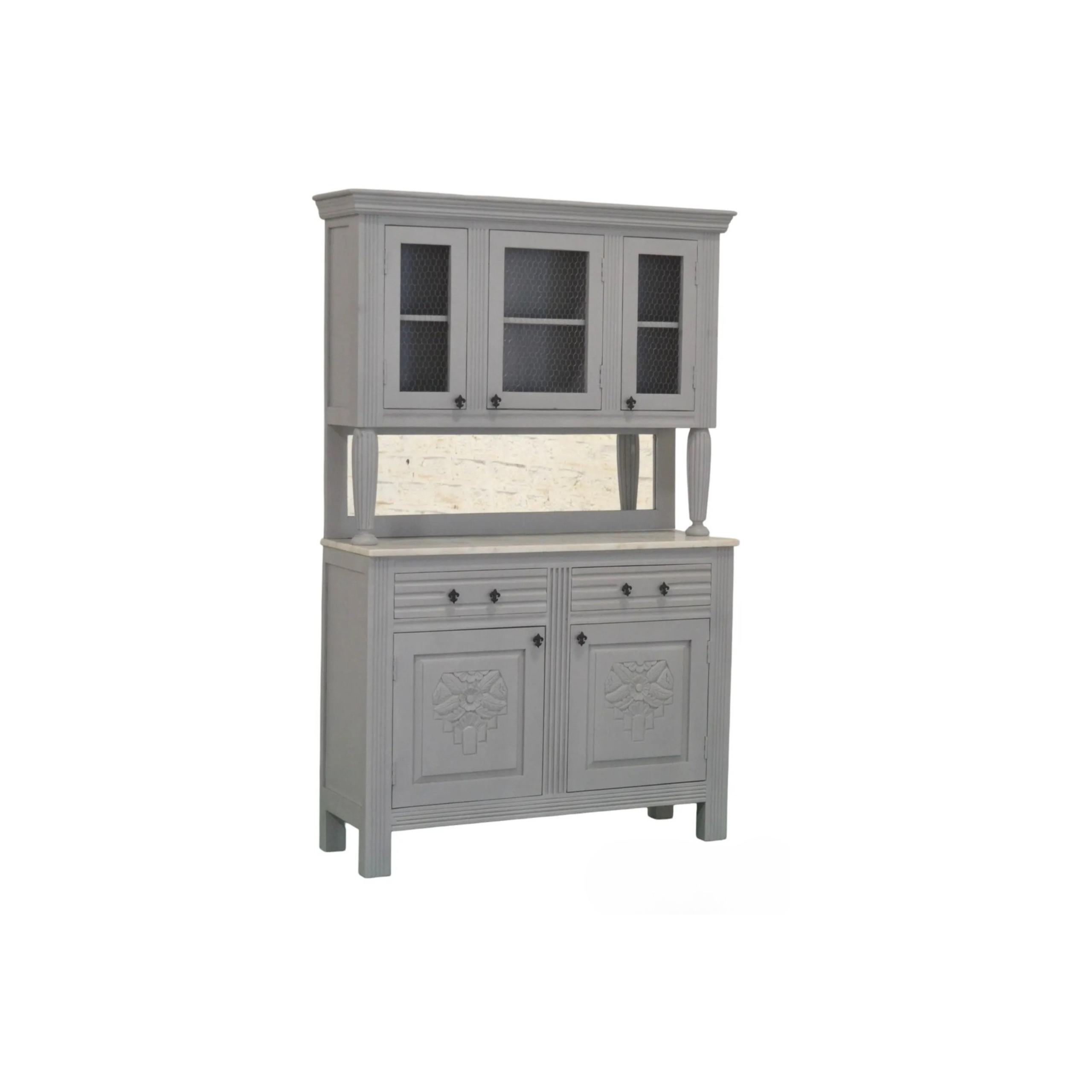 This Mini General Store kitchen cupboard is a tall white piece with open shelves, crafted from solid mango wood, perfect for retail display or as a 2-piece hutch or craft/laundry room storage cabinet.