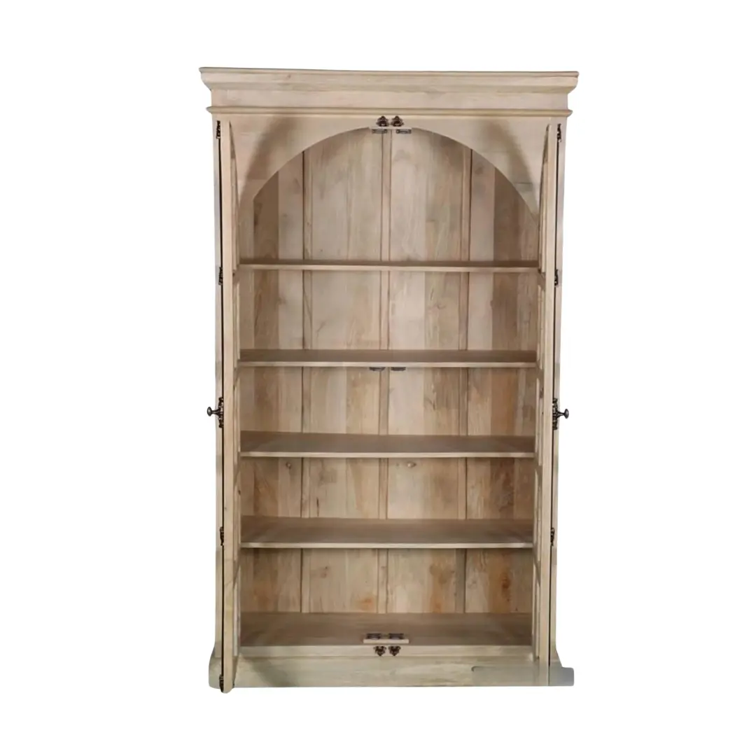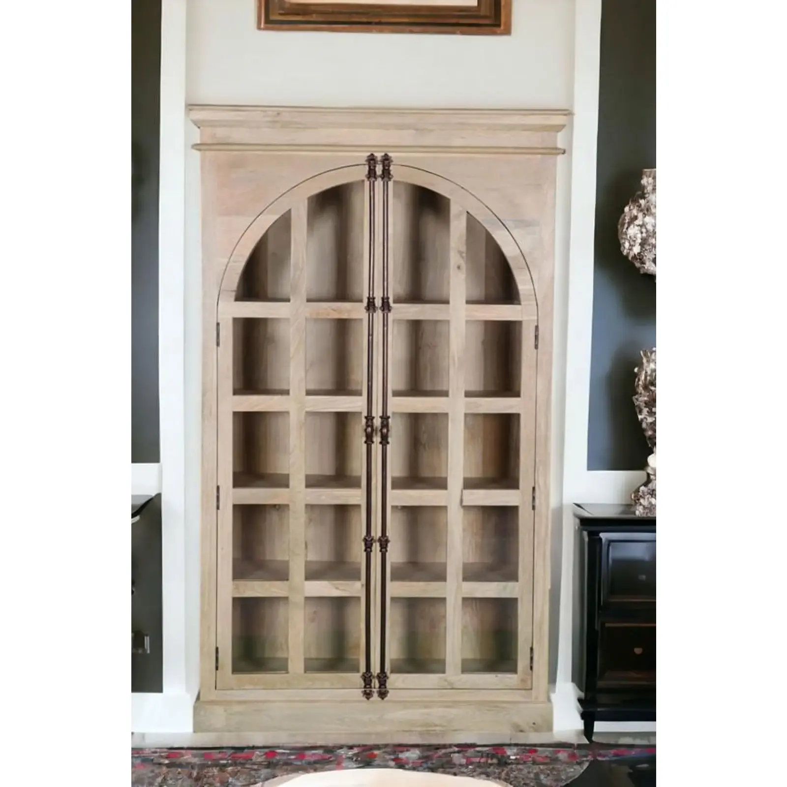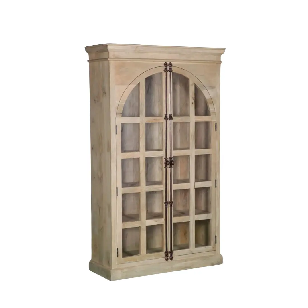 This Modern Coastal Arched Glass Bookcase is made from solid mango wood with a light driftwood finish and natural charm.