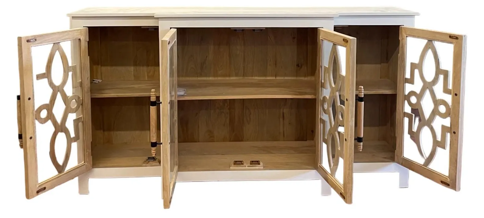 This Modern Farmhouse credenza is crafted from tall solid mango wood with four glass doors, offering an entryway console or sofa table height cabinet with a natural wood and white two-tone finish.