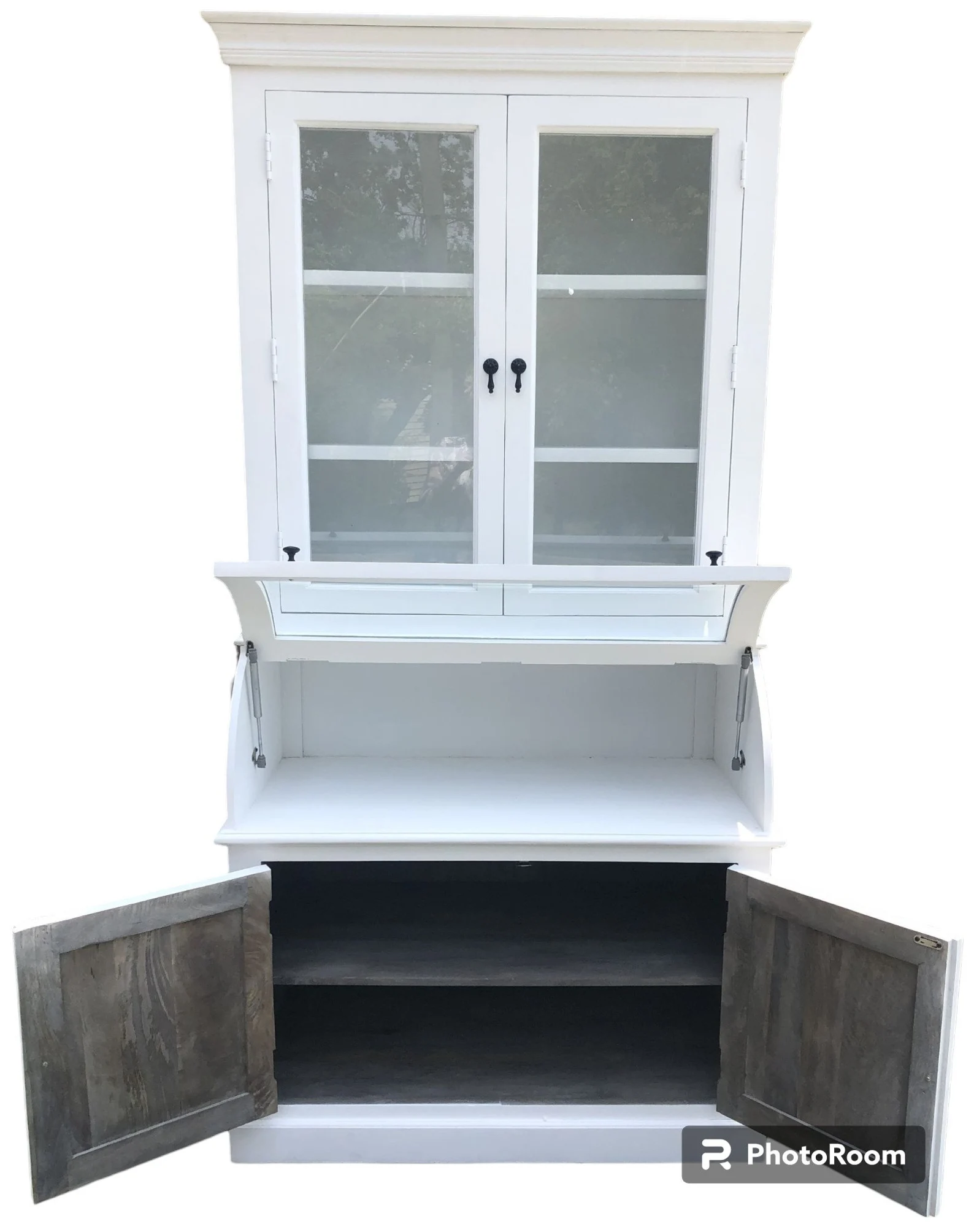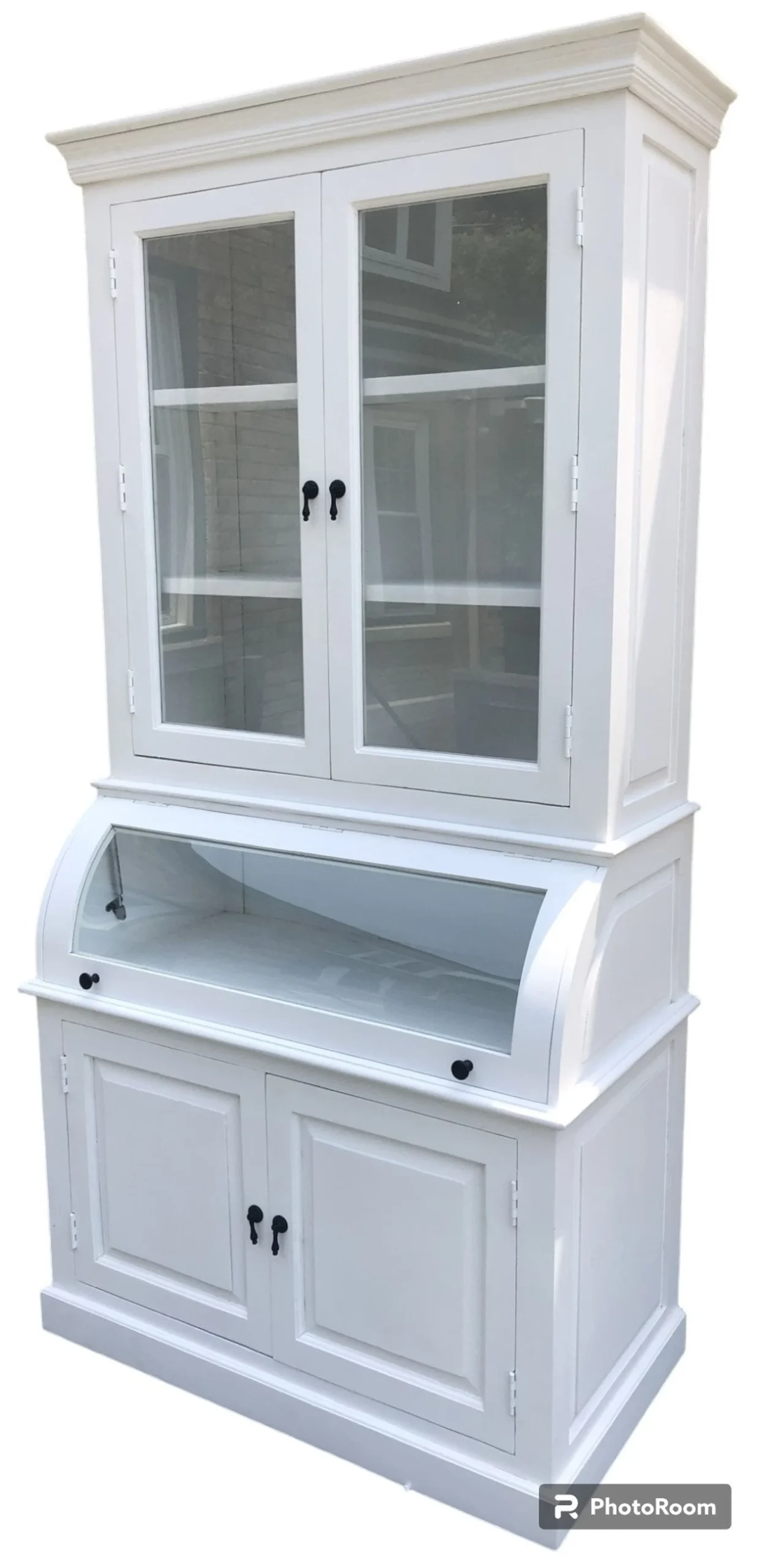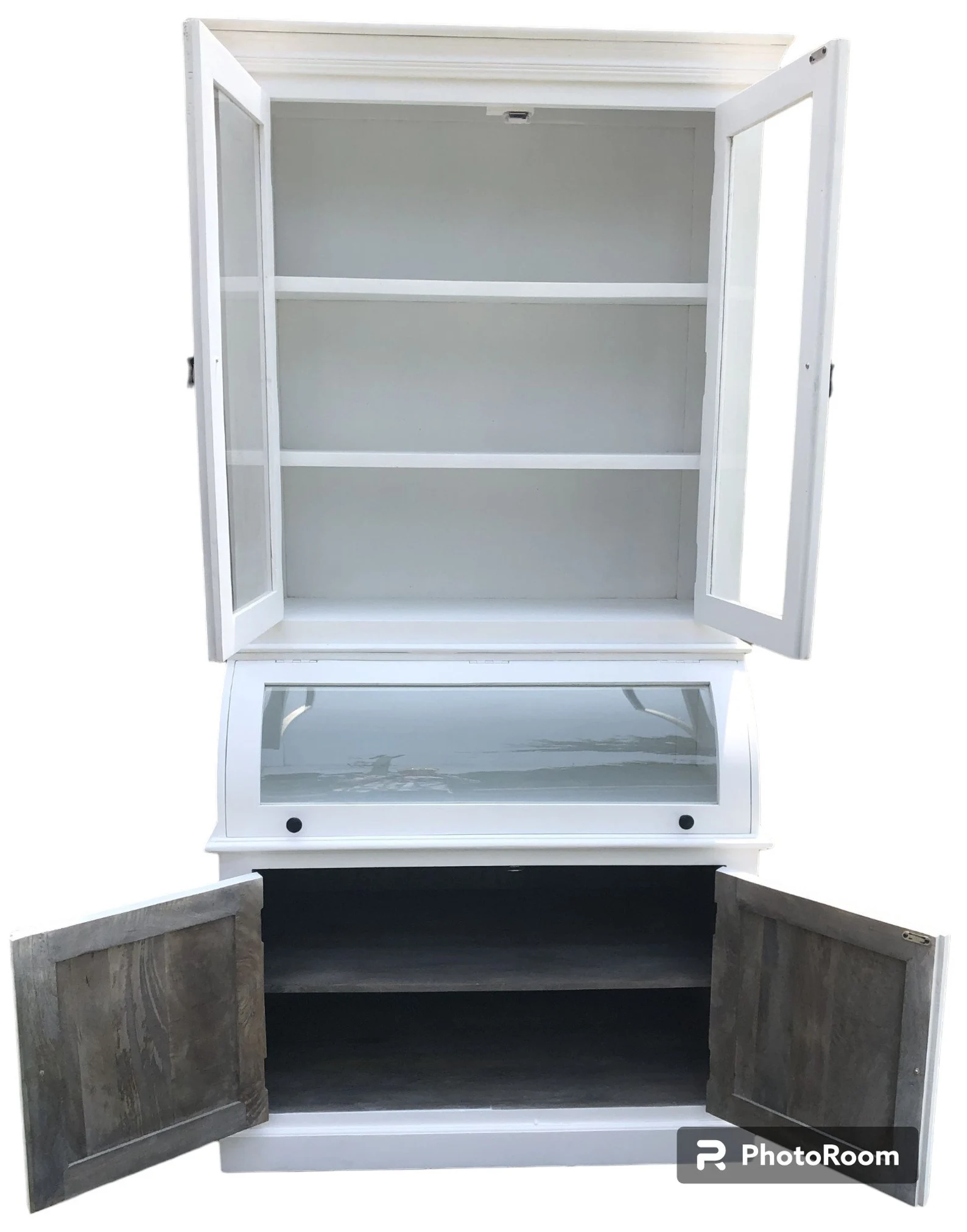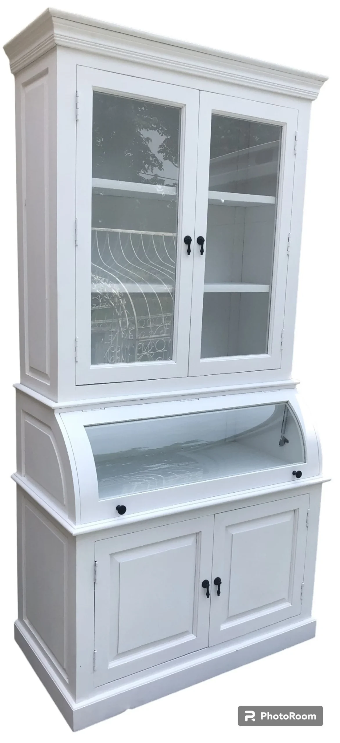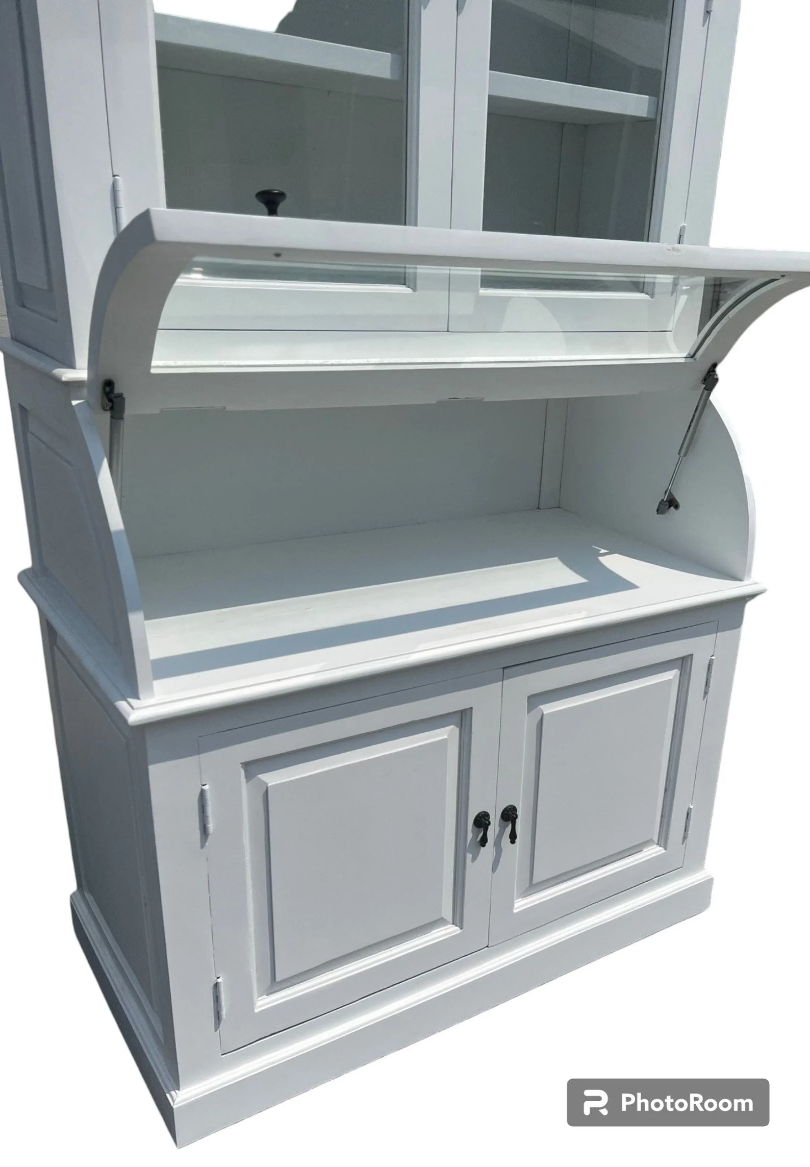 This Modern Farmhouse kitchen pantry cupboard features a tall white glass door and curved glass for bread rolls, offering a 2-piece solid wood display hutch.