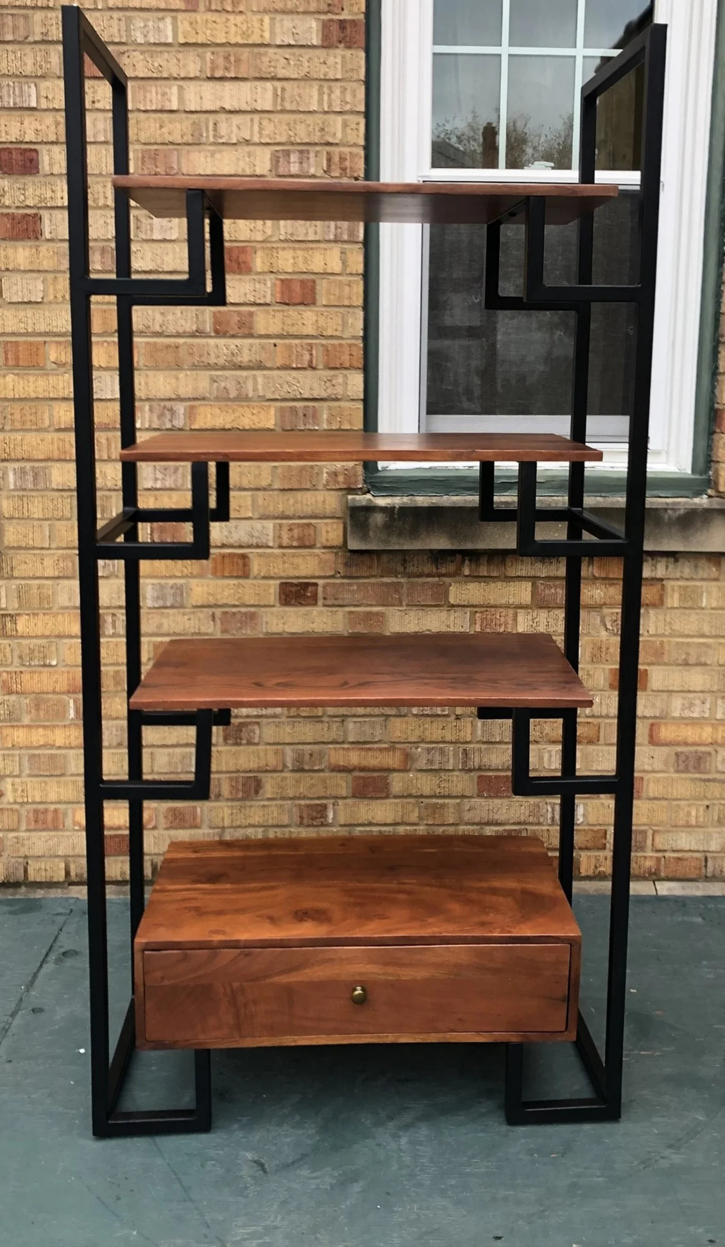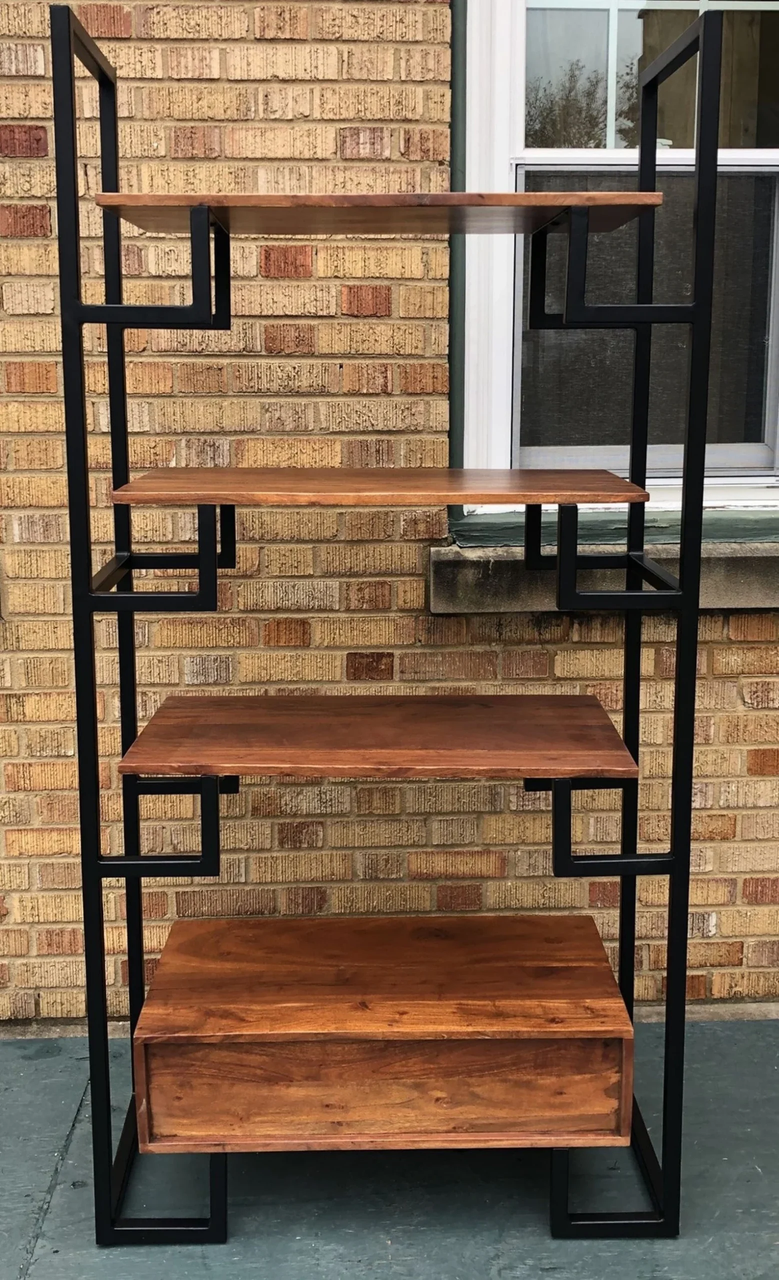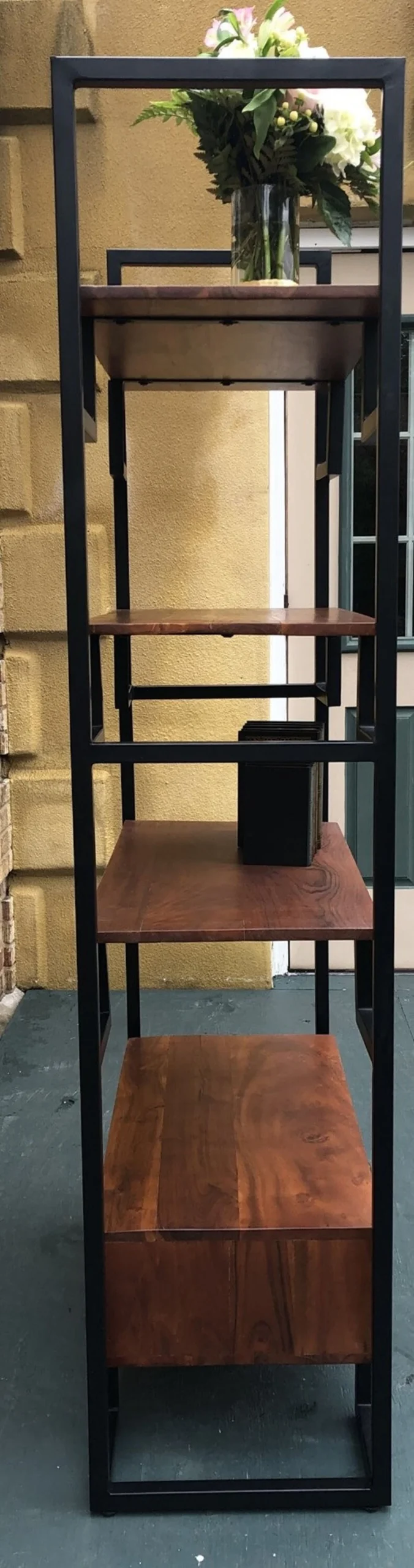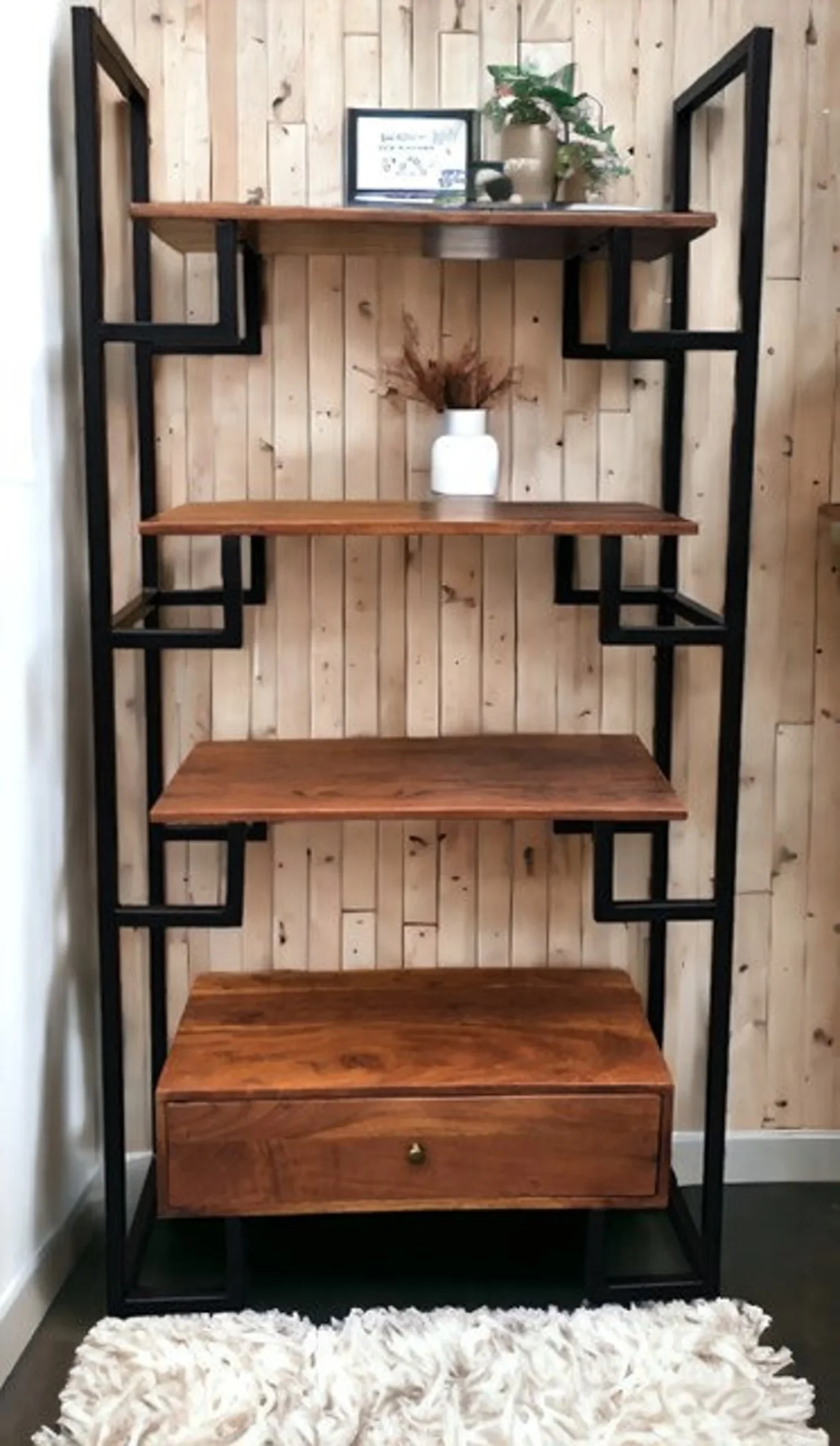 This modern industrial chic bookcase features a black iron base and acacia wood, offering a tall and narrow open design with four display shelves and a convenient bottom drawer for storage.