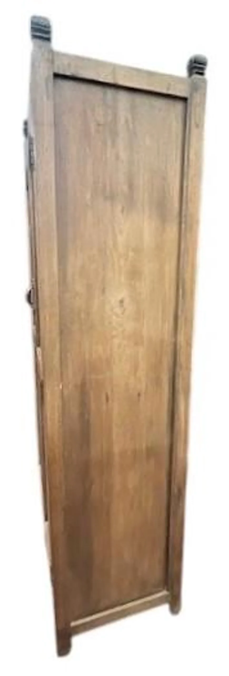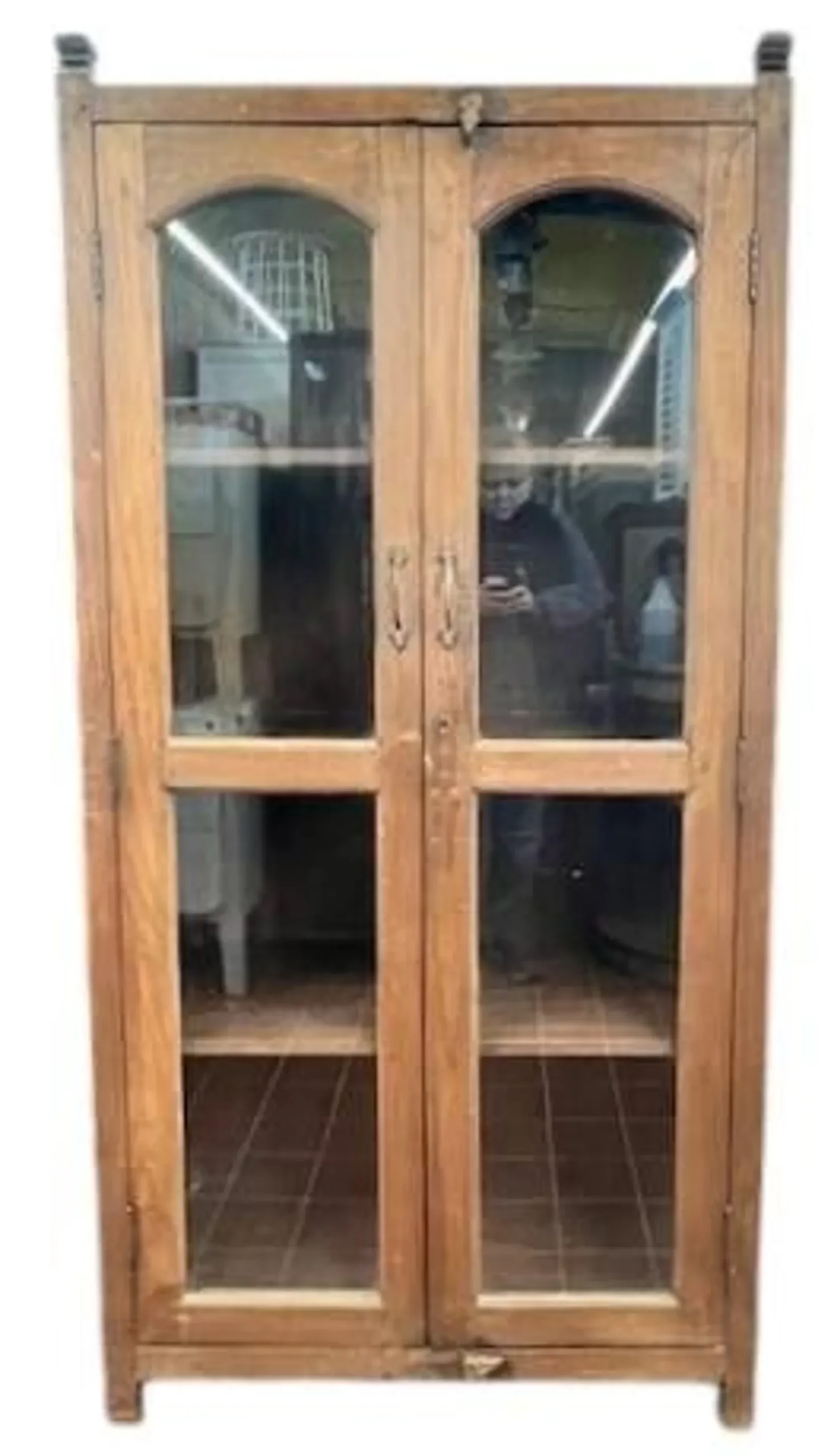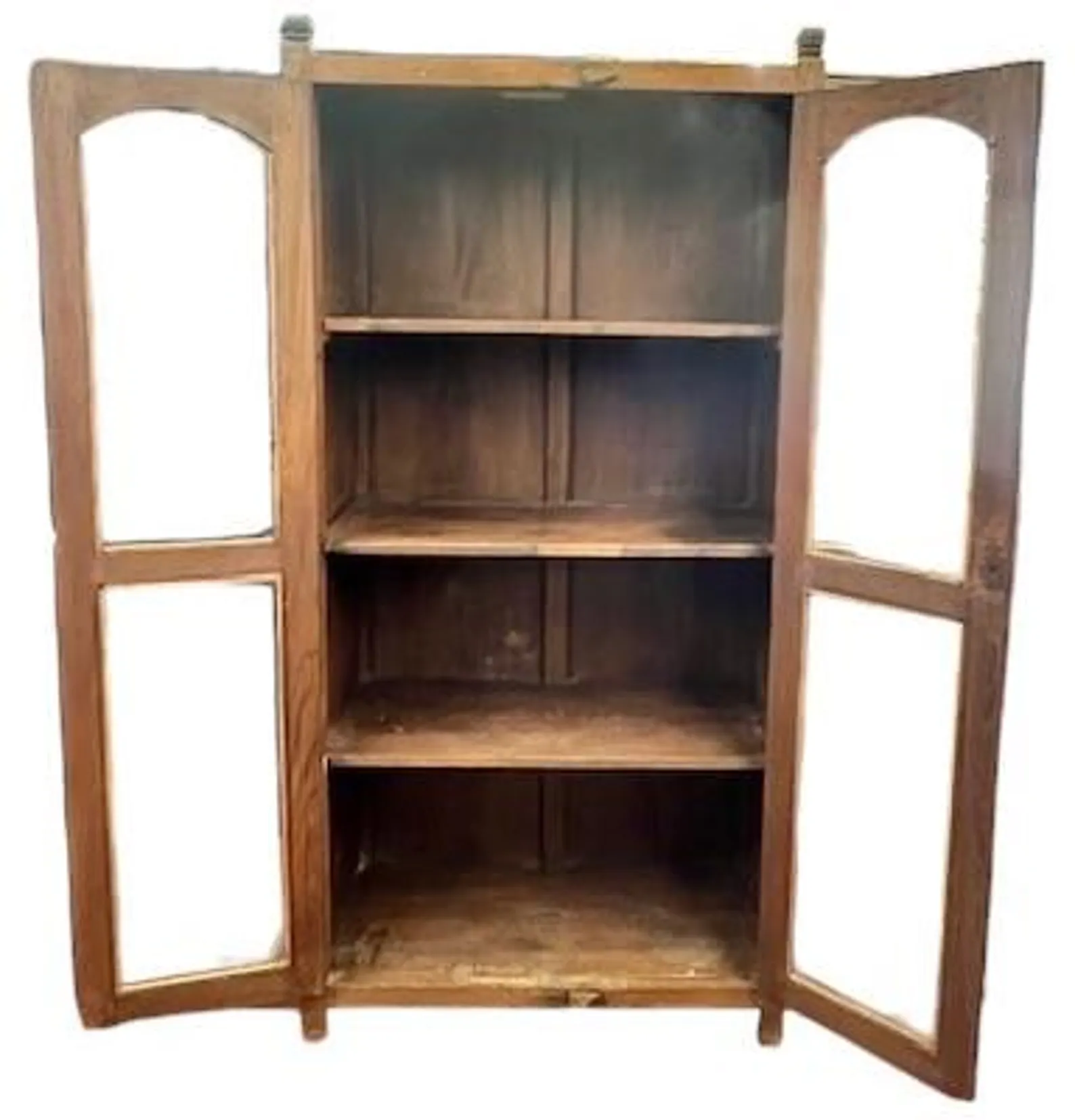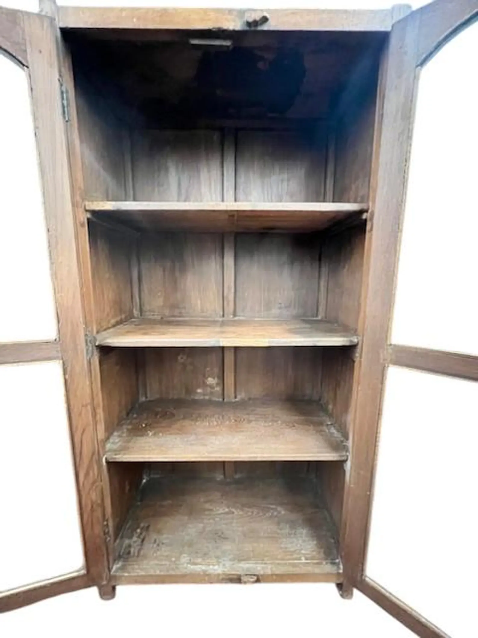 This one-of-a-kind Old Farmhouse rustic cabinet is crafted from reclaimed solid wood, featuring two glass doors, functioning as a bookcase, china display closet, tall linen storage cabinet, or sturdy kitchen pantry.