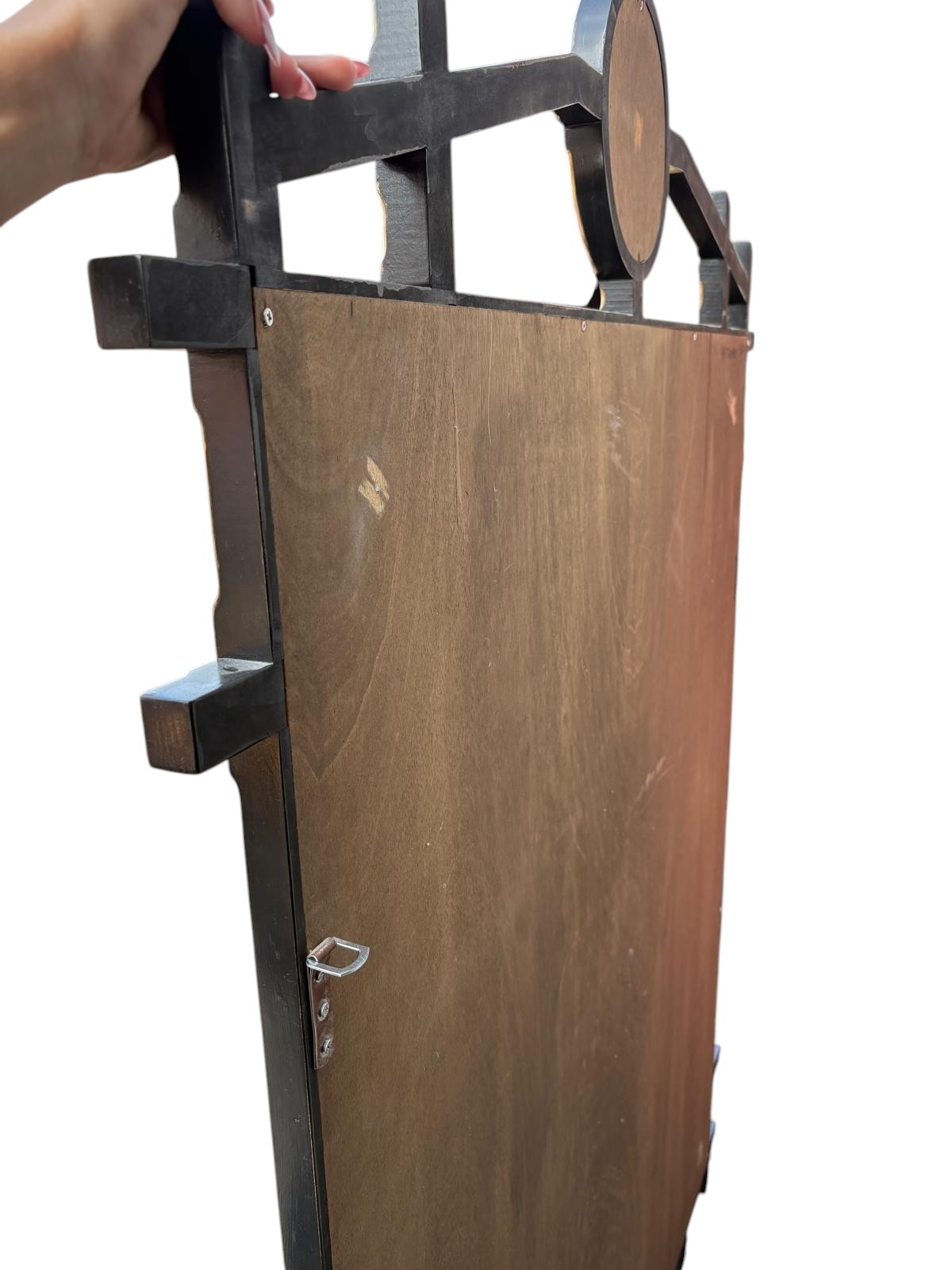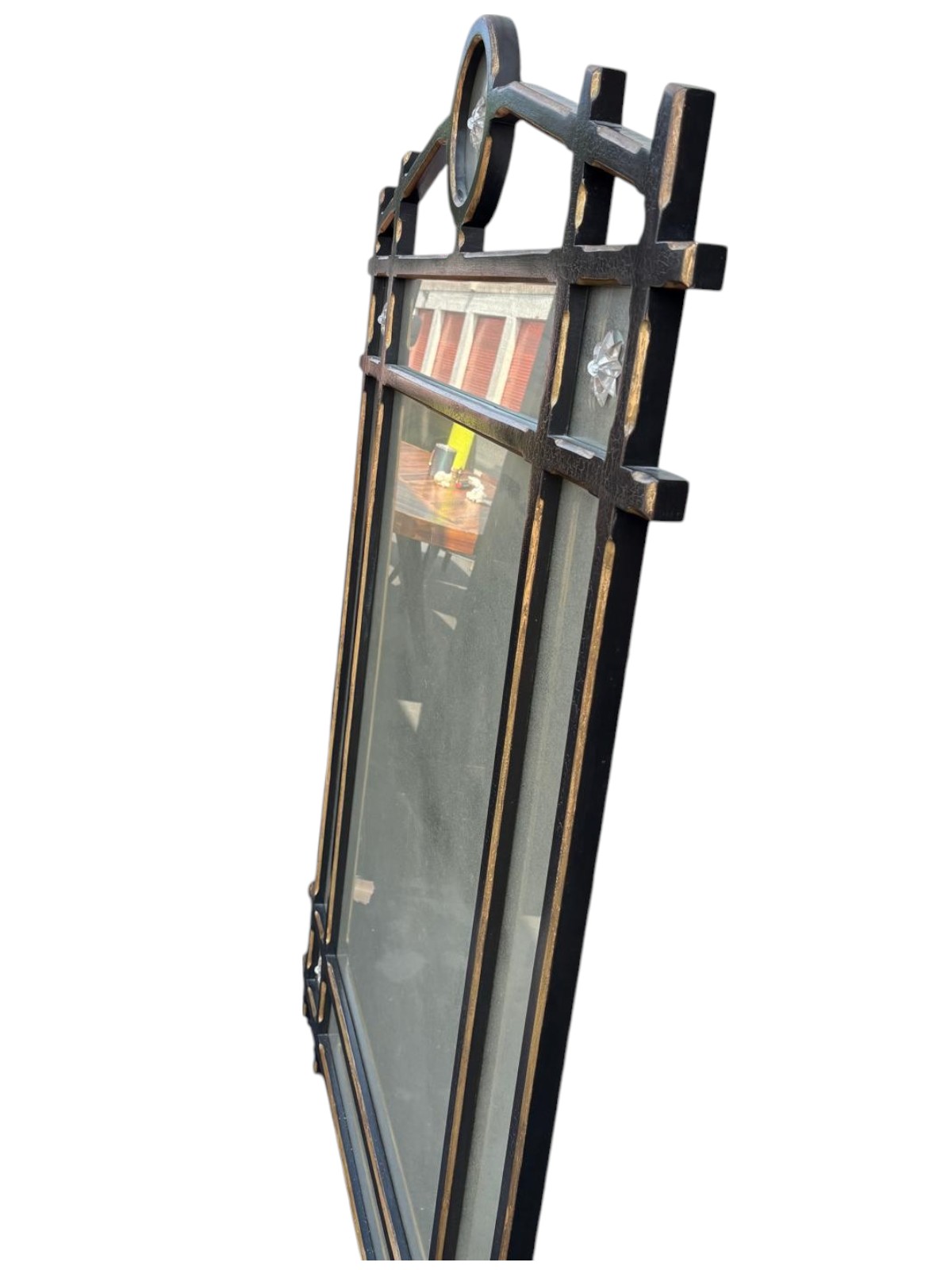 Large vintage Arts and Crafts ebonized mirror. One of a kind piece. The mirror itself has an antiqued look. Little flower/star accents on each corner & the top. Frame is made of solid wood.