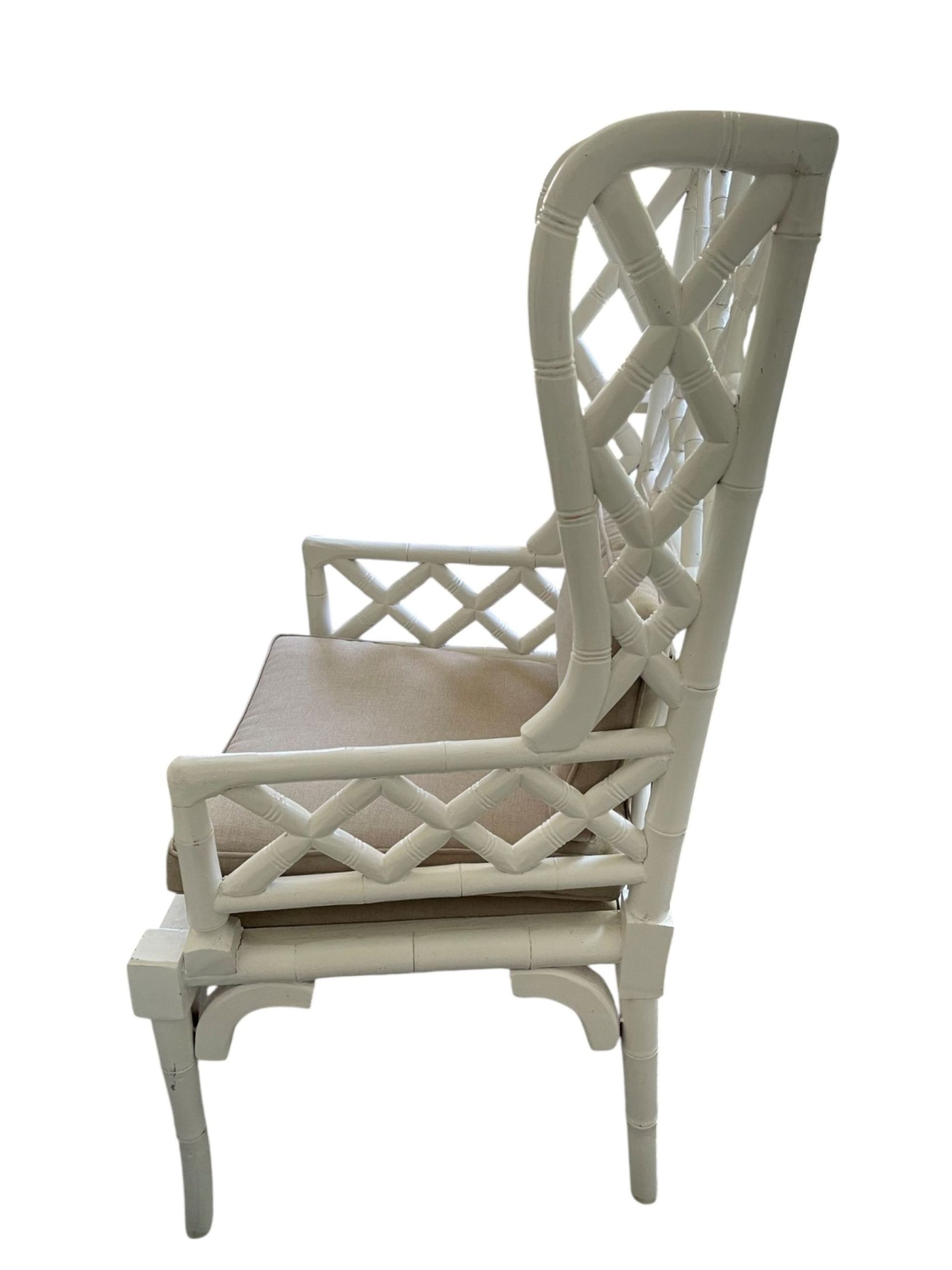 This pair of two Coastal Boho accent armchairs features carved fretwork on solid mahogany wood, with a Chinese bamboo style and white pagoda design, perfect as wingback chairs for a bedroom, porch, or sunroom.