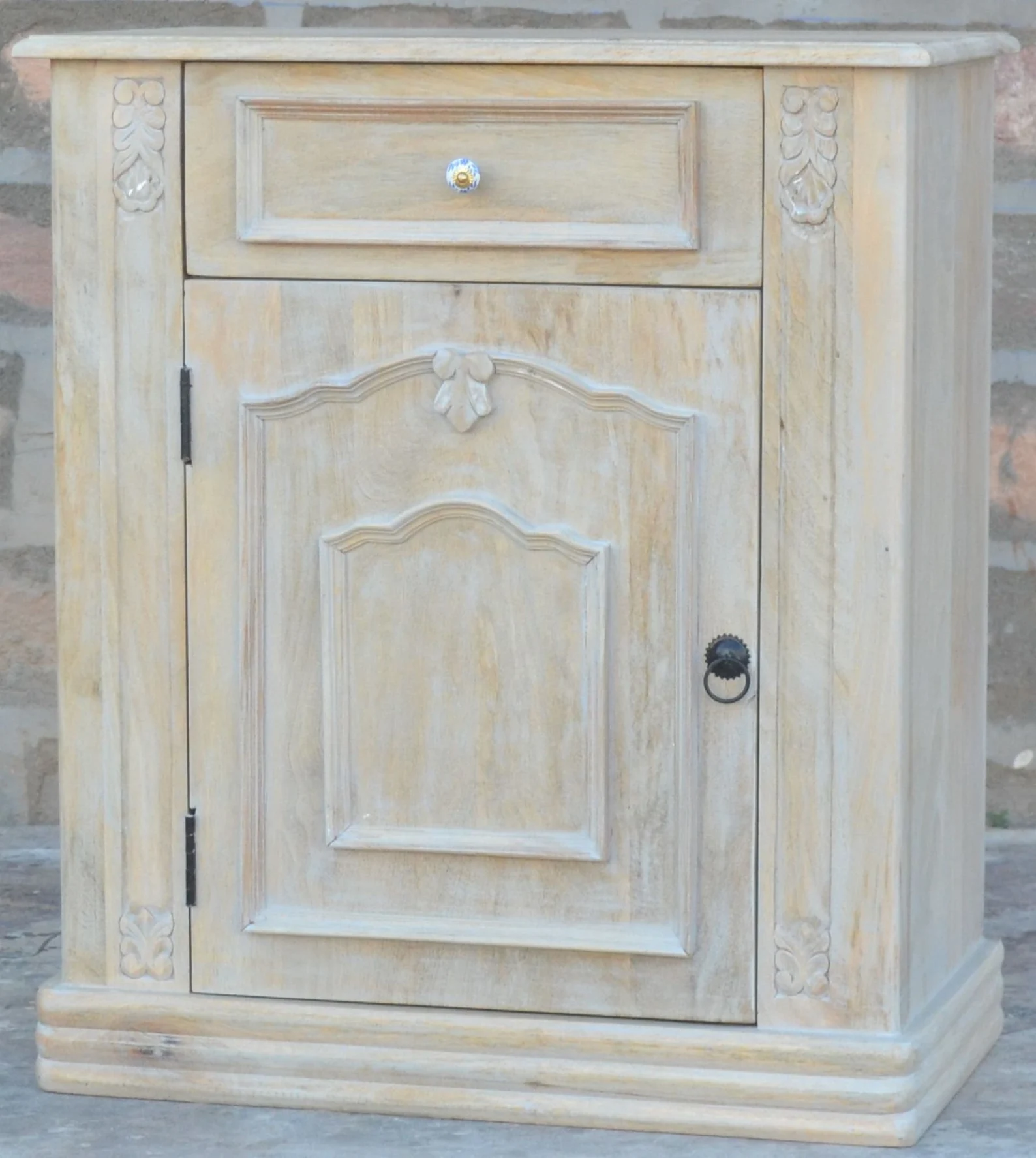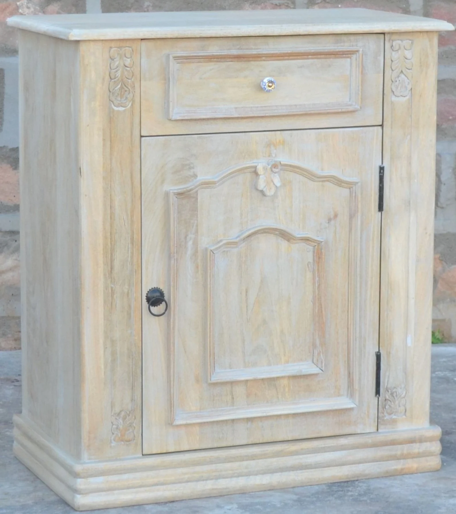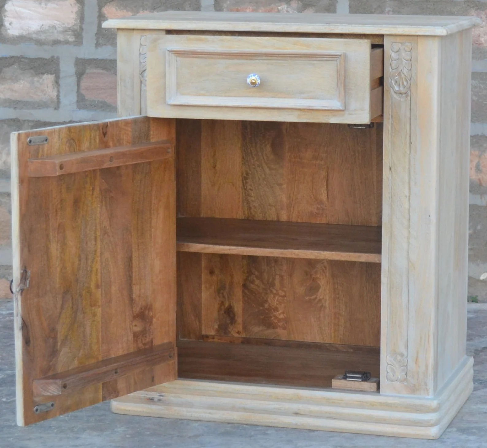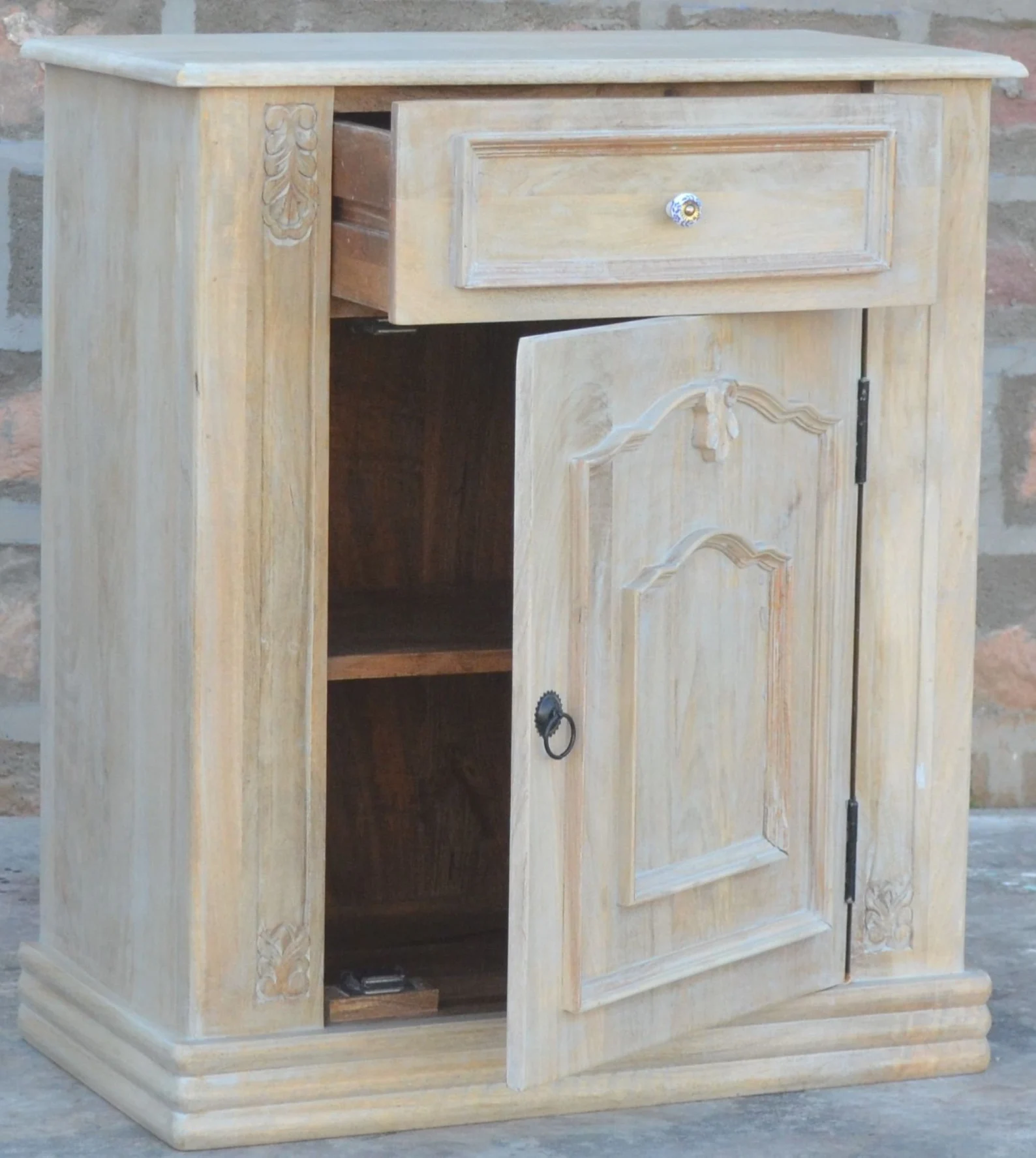 This pair of two French Country Cottage bedside end tables is crafted from carved solid mango wood, featuring one drawer and one door, perfect as a bedroom nightstand set.