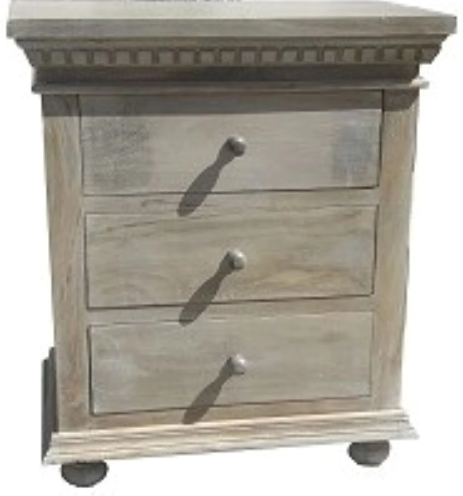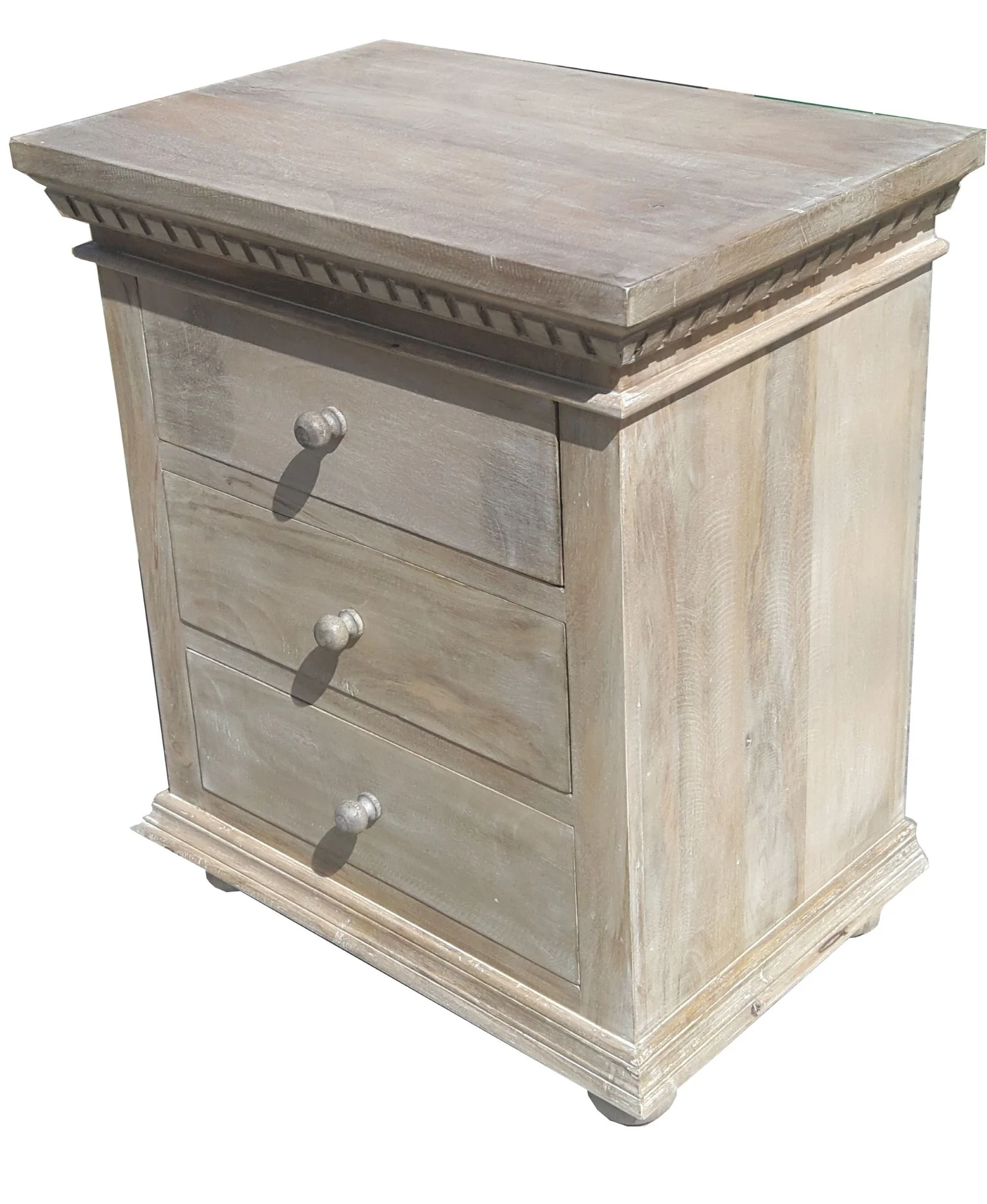 This pair of two French Country chests features three drawers and is crafted from solid wood with a driftwood finish, perfect as bedside end tables or nightstands.