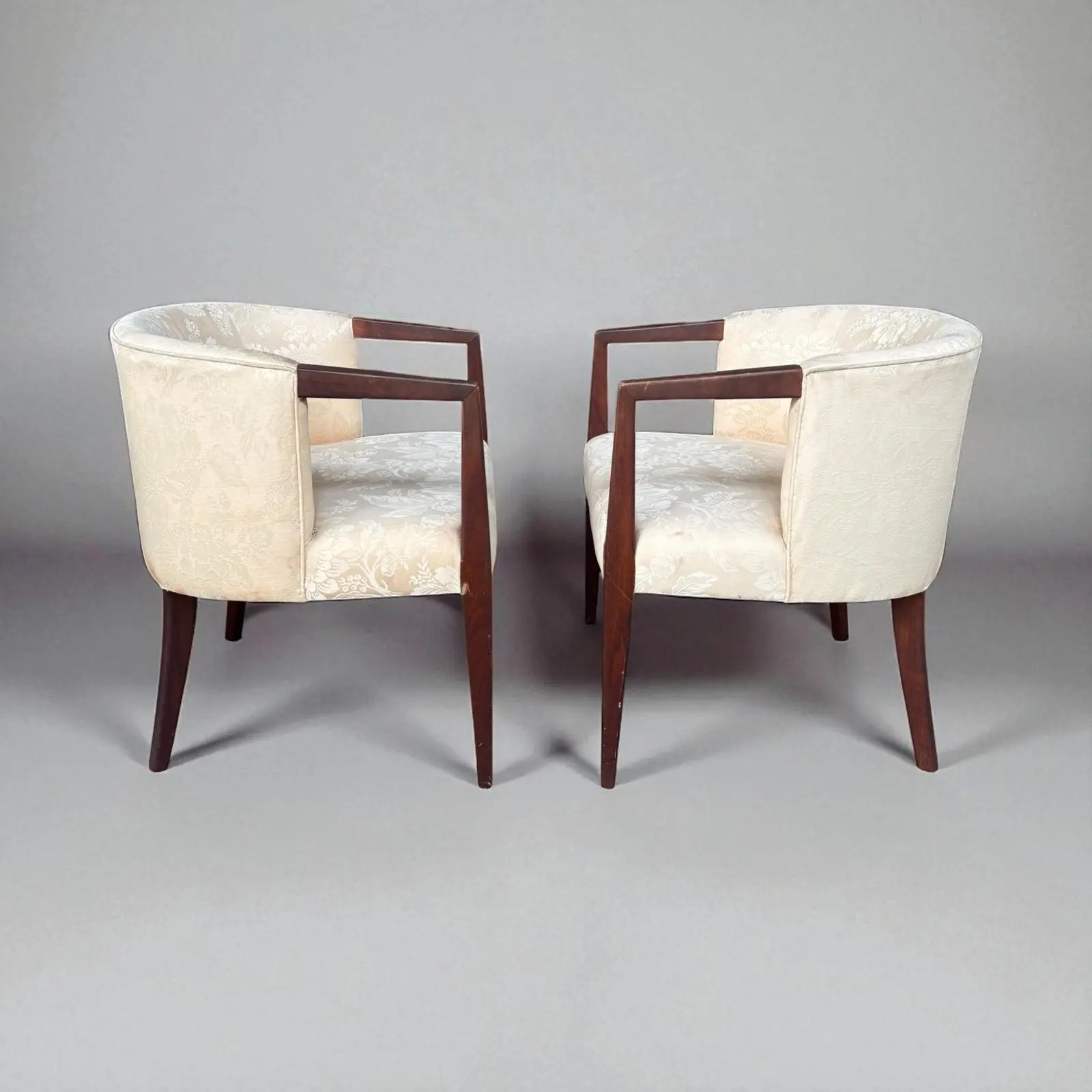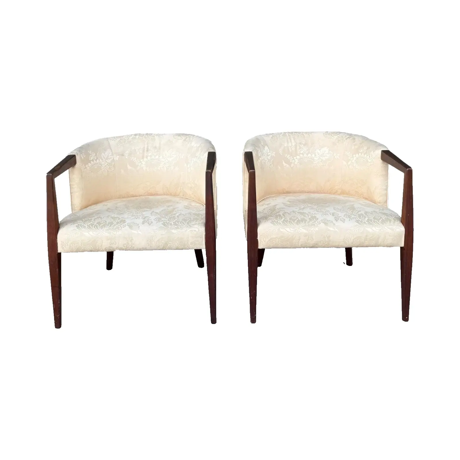 This stunning pair of vintage barrel-back armchairs blends sculptural Mid-Century Modern form with timeless traditional elegance. Featuring gracefully tapered solid walnut legs and angular open arms, each chair offers a refined silhouette that nods to the sleek lines of the 1960s. There are a few stains and marks on the fabric (pics included).