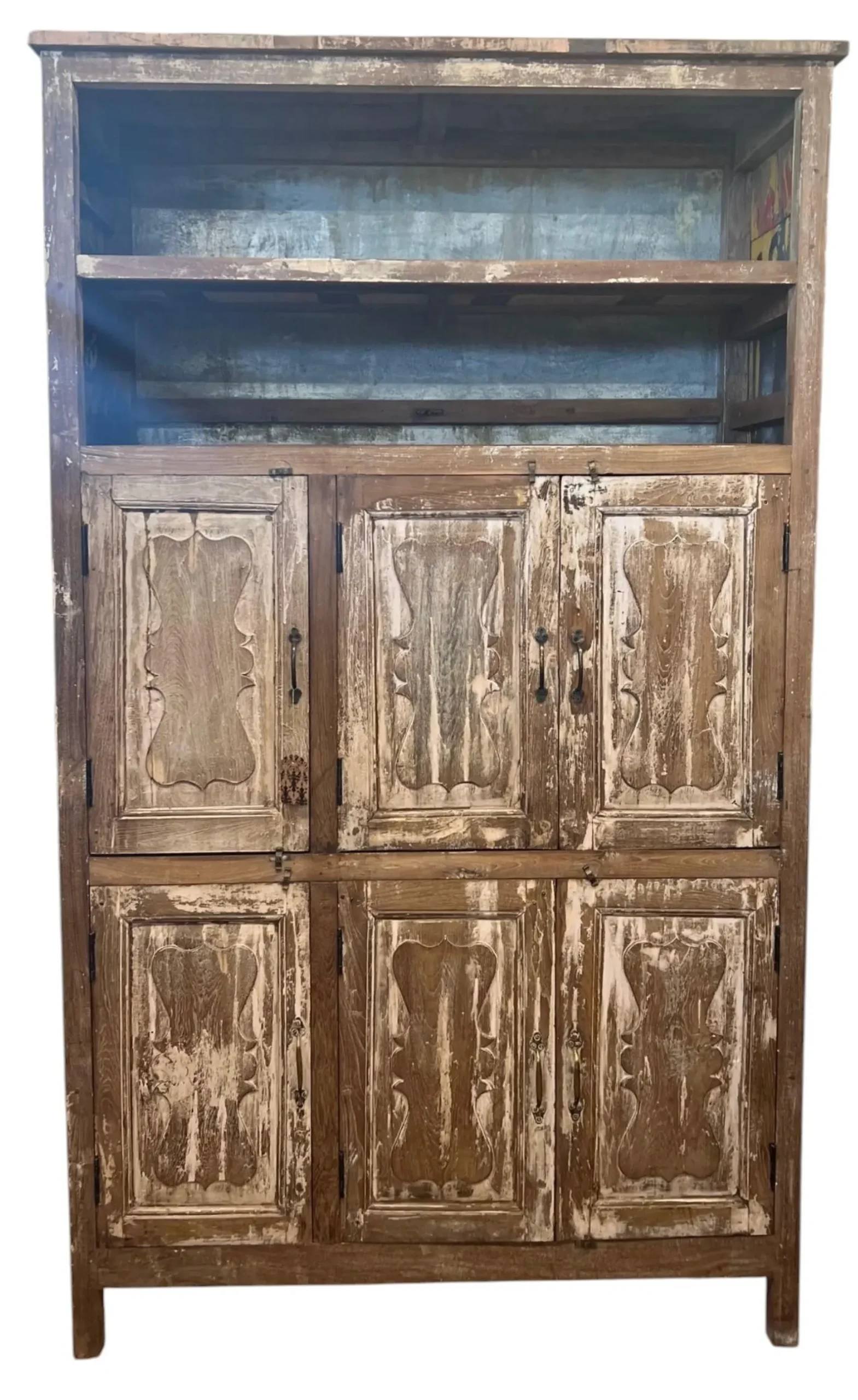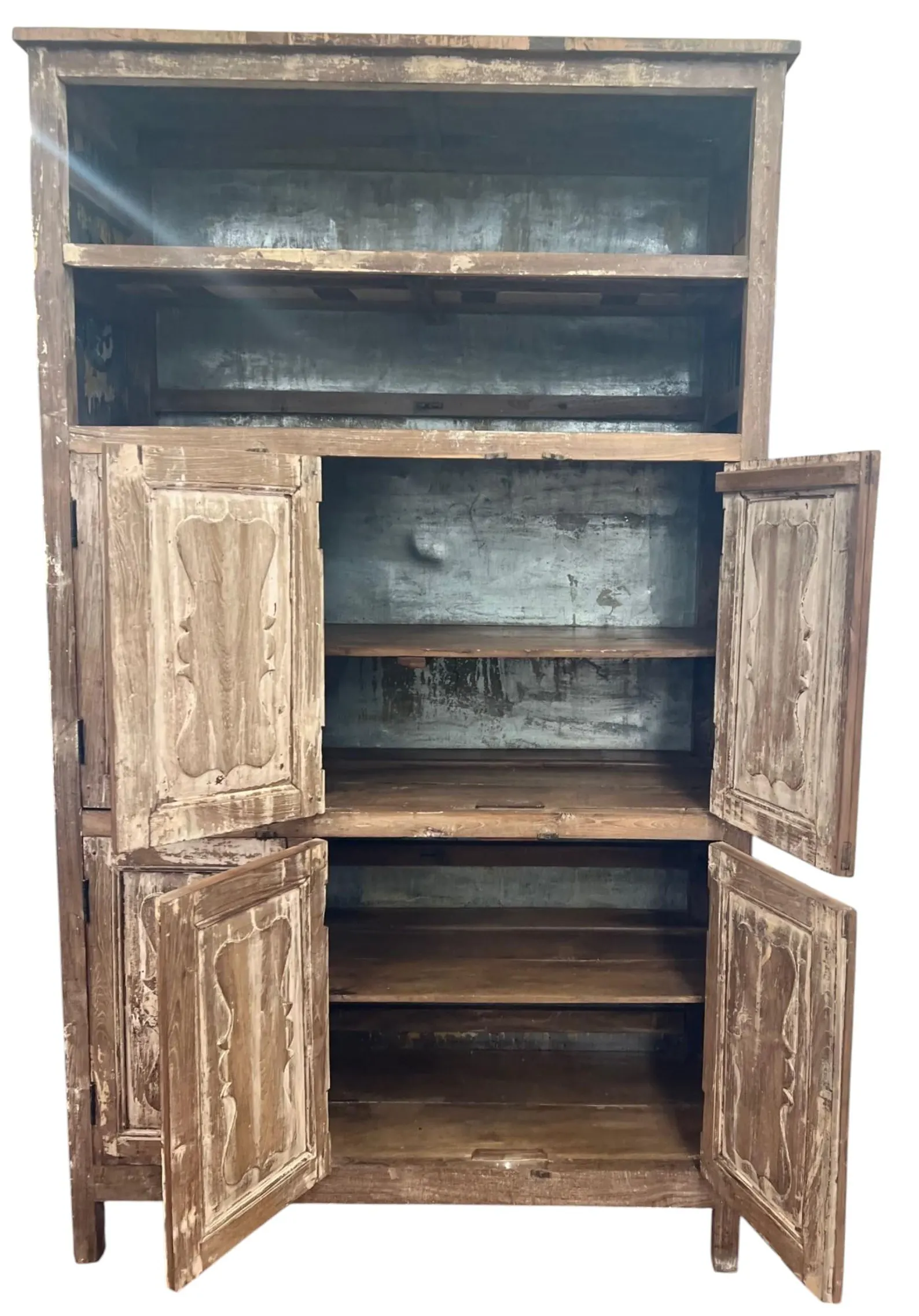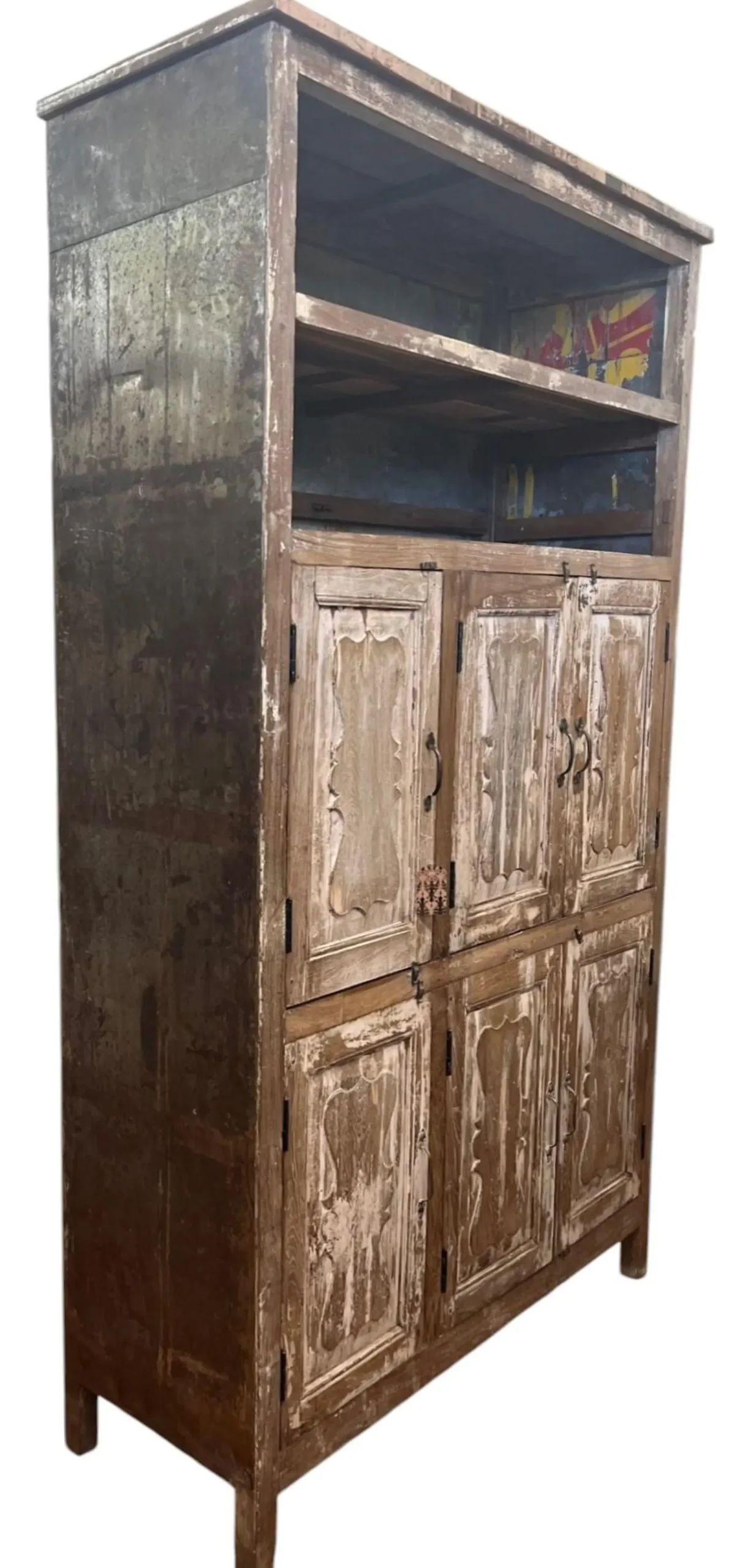 This reclaimed Old Tin large farmhouse kitchen cupboard is crafted from tall rustic solid mango wood with six doors and two open shelves, offering an oversized distressed pantry cabinet.