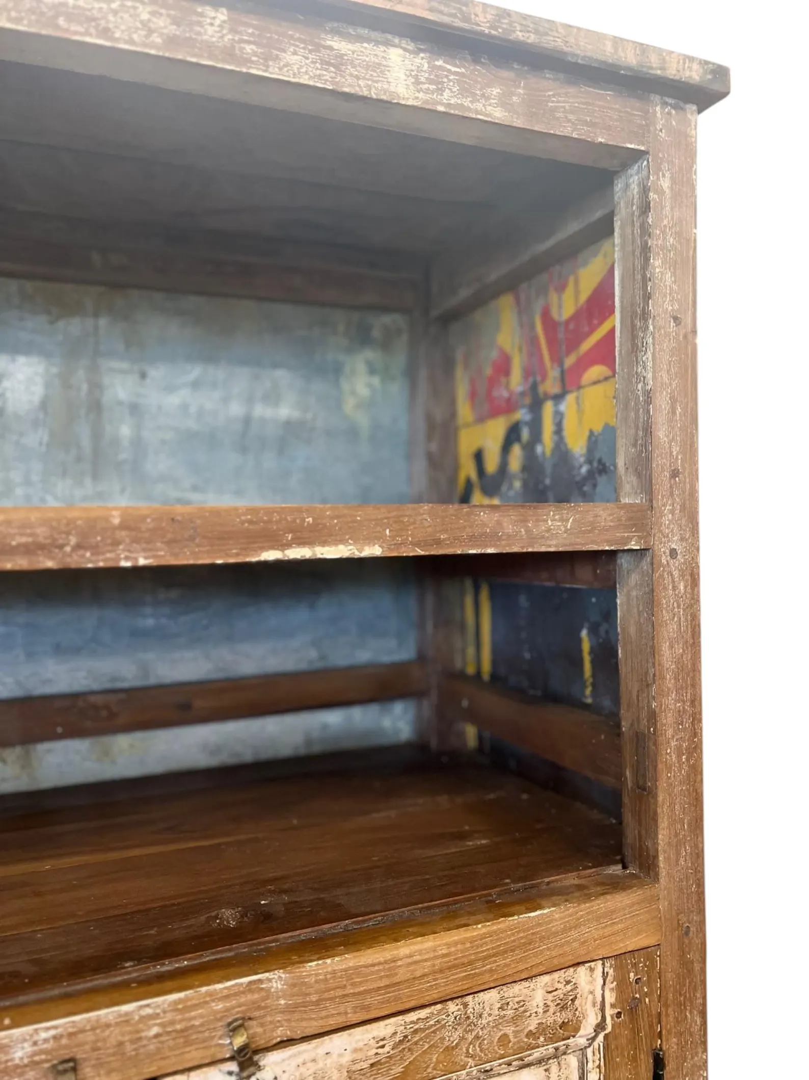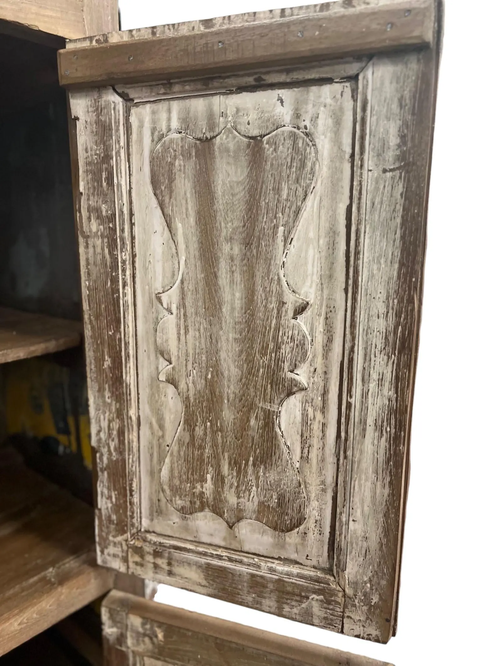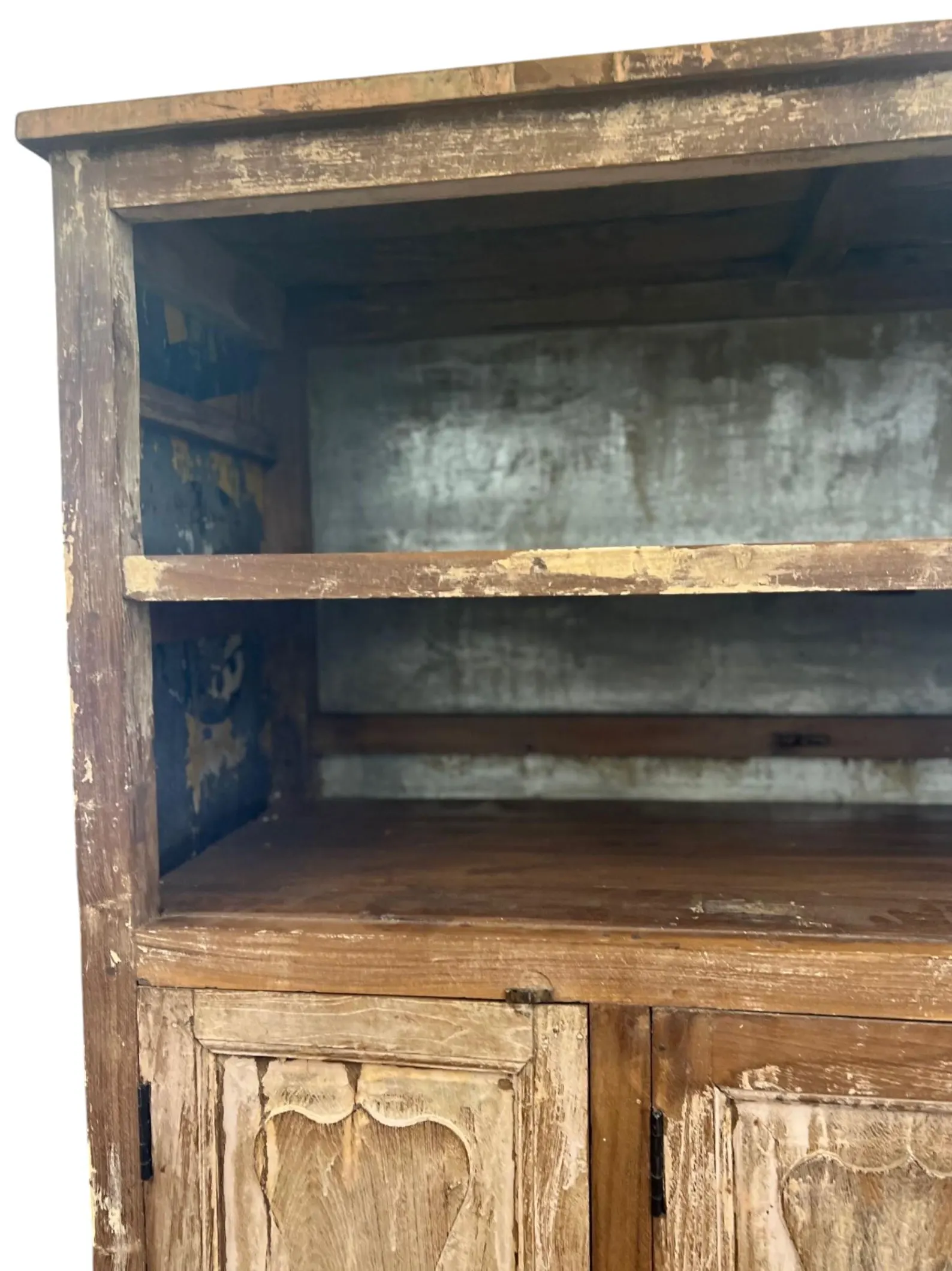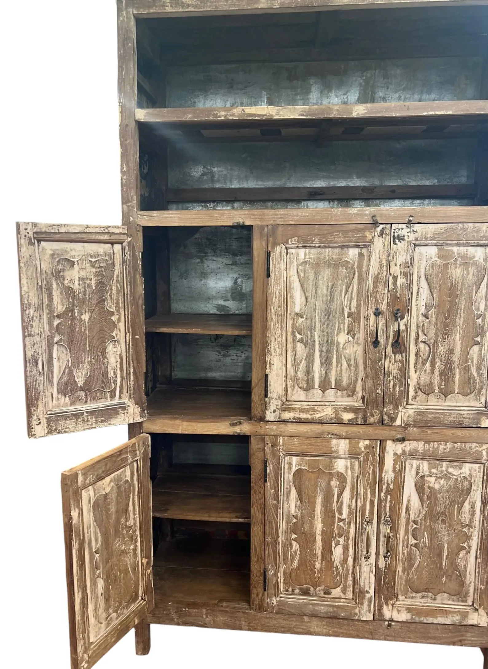 This reclaimed Old Tin large farmhouse kitchen cupboard is crafted from tall rustic solid mango wood with six doors and two open shelves, offering an oversized distressed pantry cabinet.