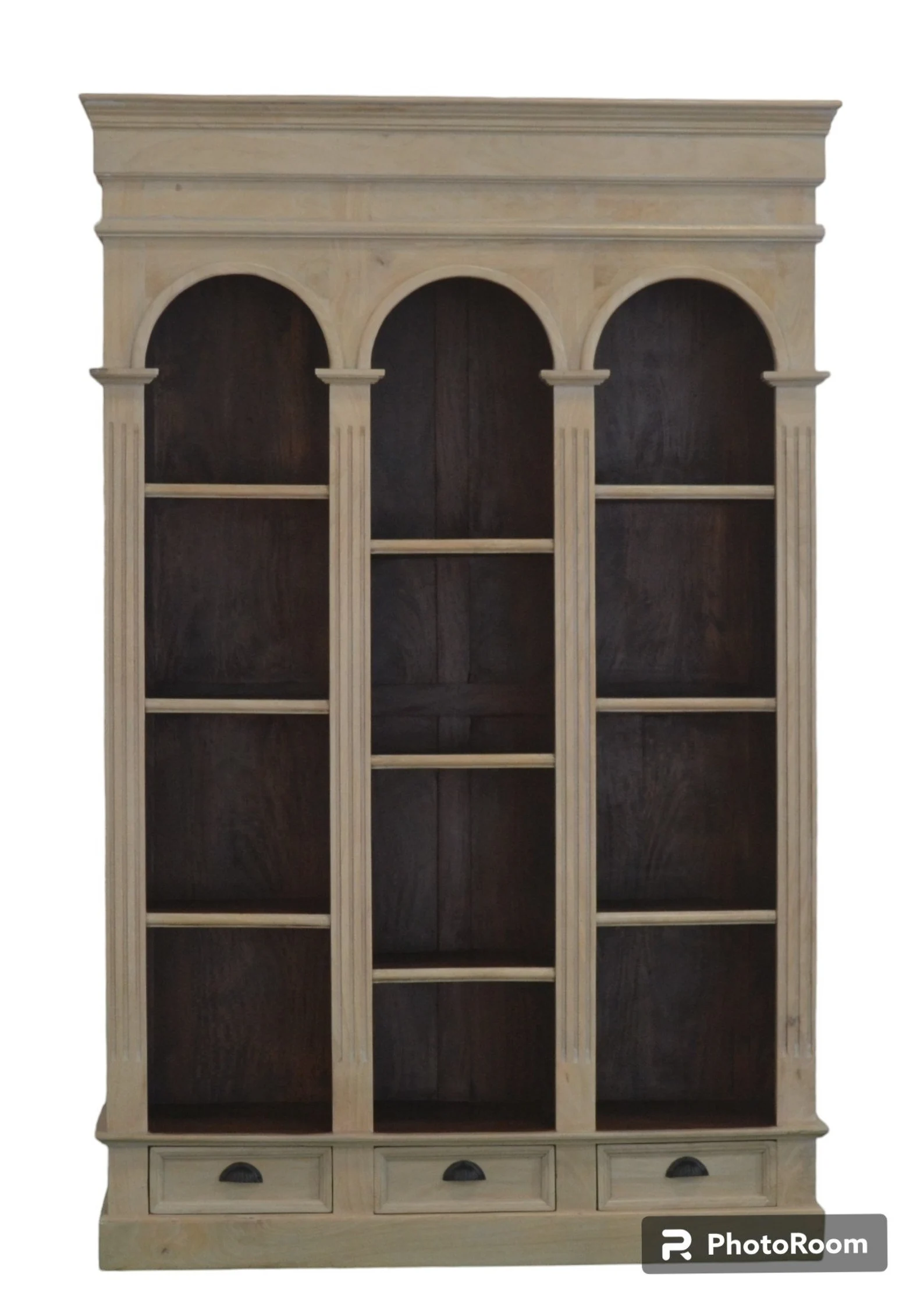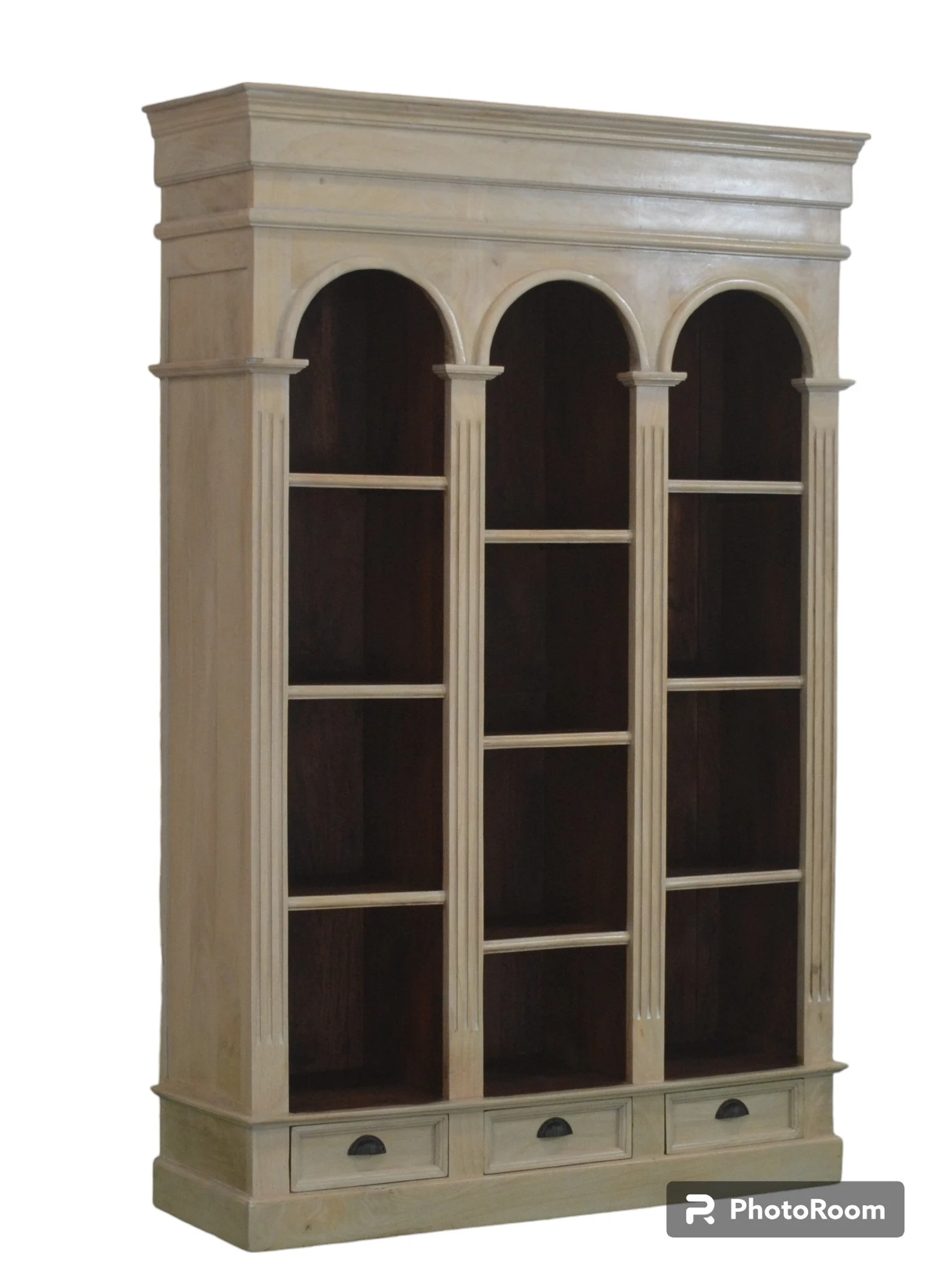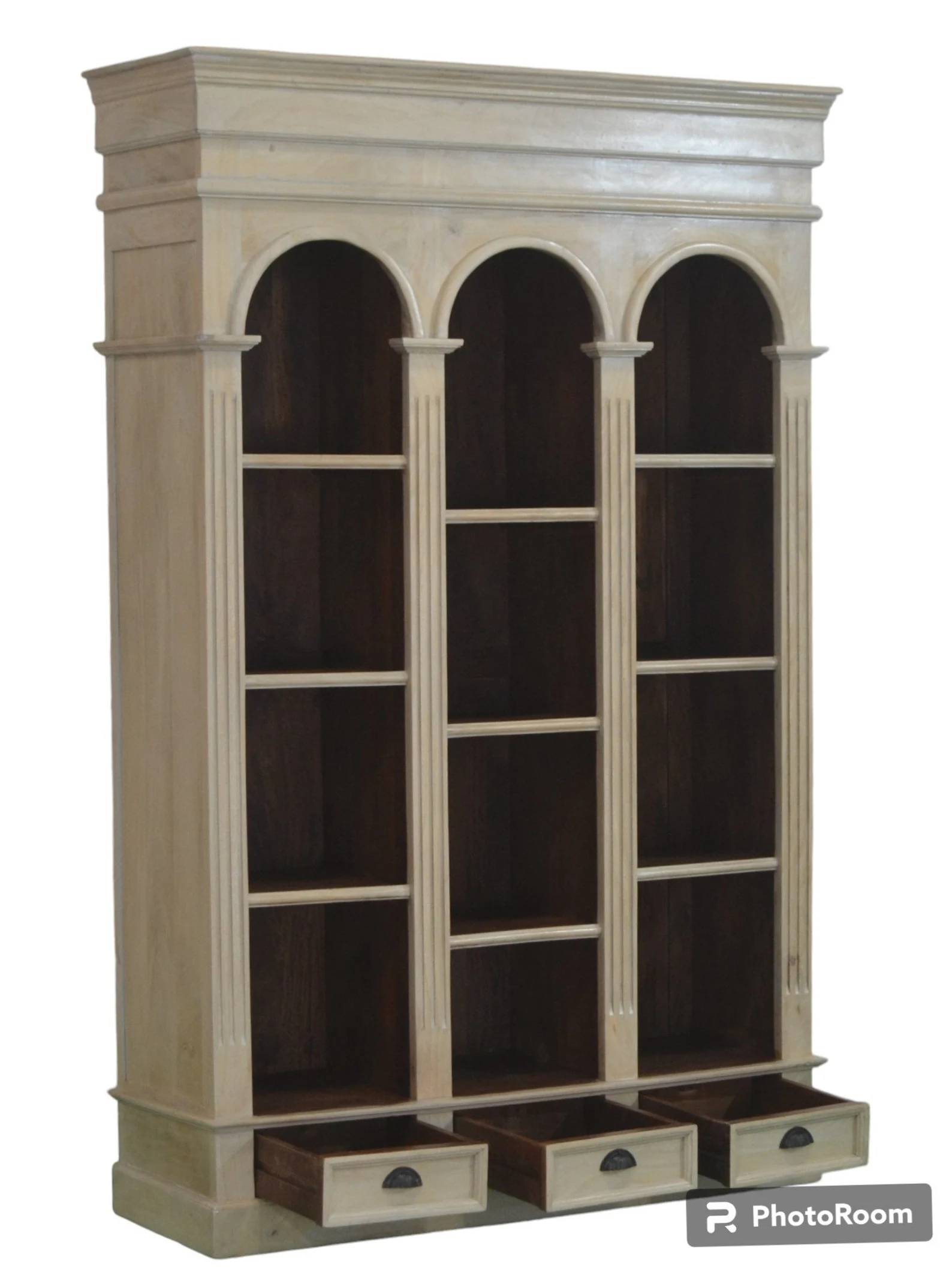 This Roosevelt triple arch bookcase is crafted from solid mango wood with a driftwood finish, featuring a tall and wide open bookshelf cabinet with three convenient bottom drawers for storage.