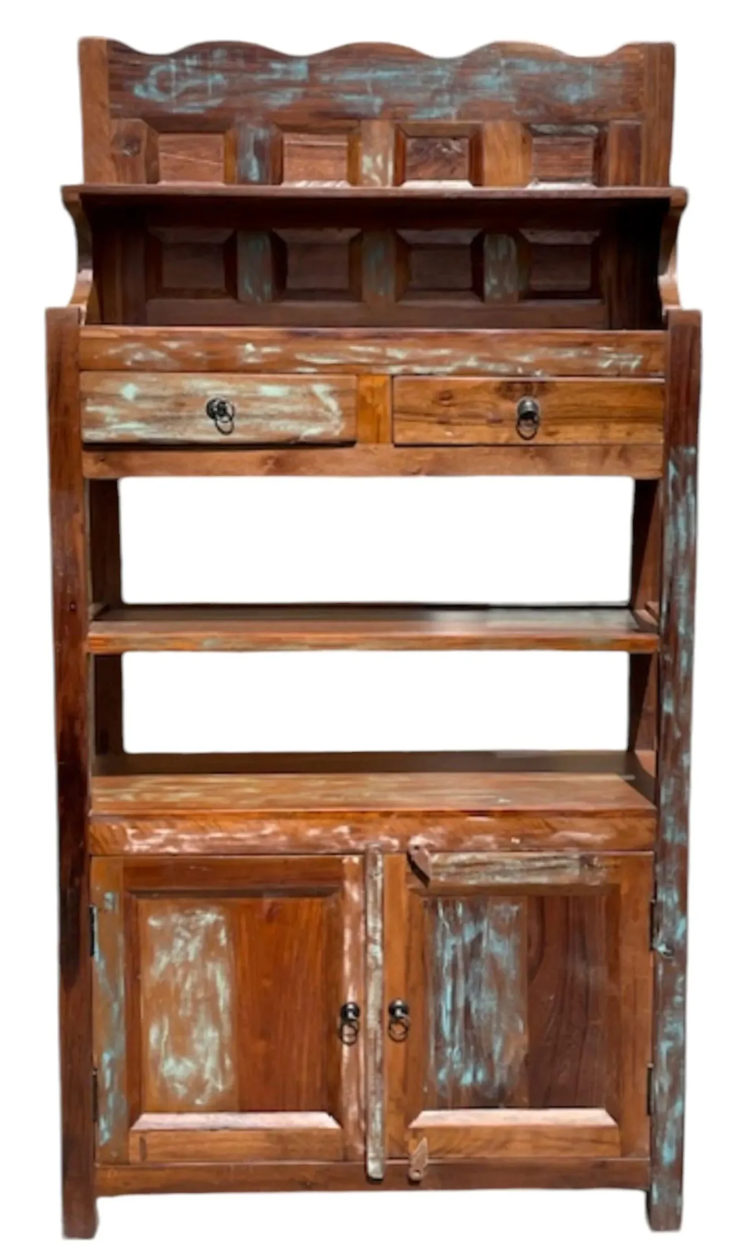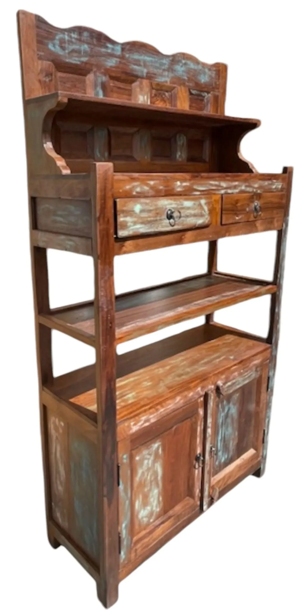 This one-of-a-kind rustic accent cabinet is crafted from reclaimed solid wood, featuring a repurposed tall open shelf bookcase display rack with two doors and two drawers for unique storage.