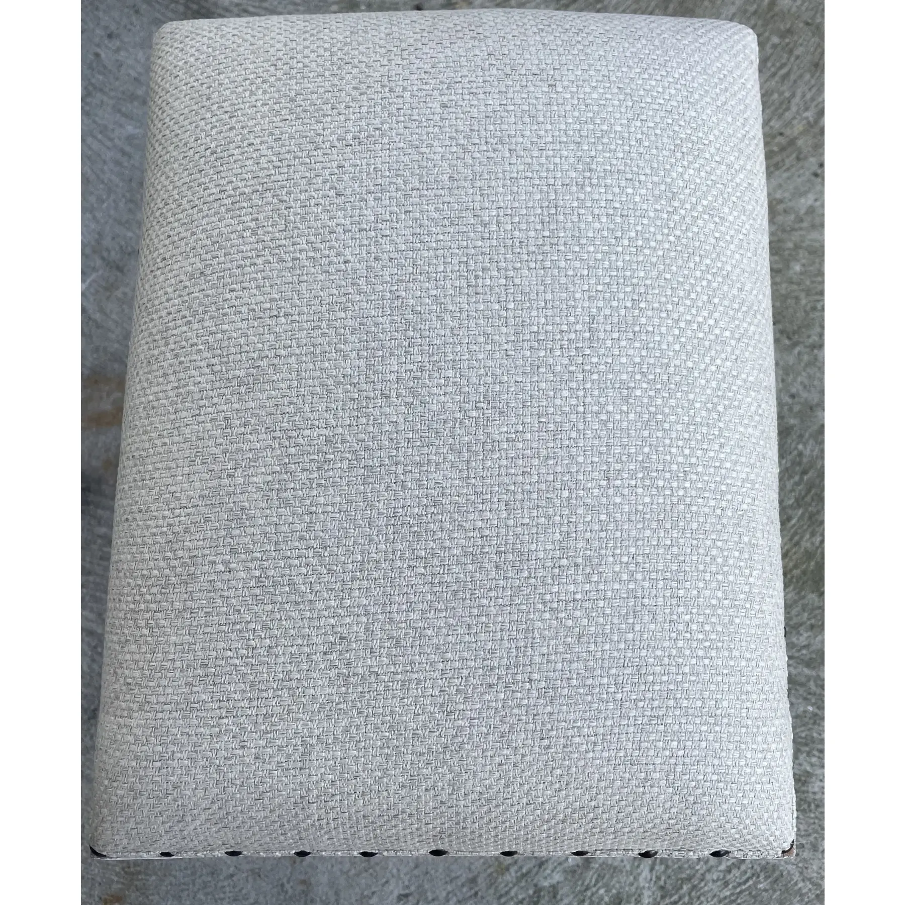 This shabby chic distressed white bedroom makeup vanity features a cushioned stool, a solid wood dressing table, and an extra-tall triple mirror, ideal for ladies or students.