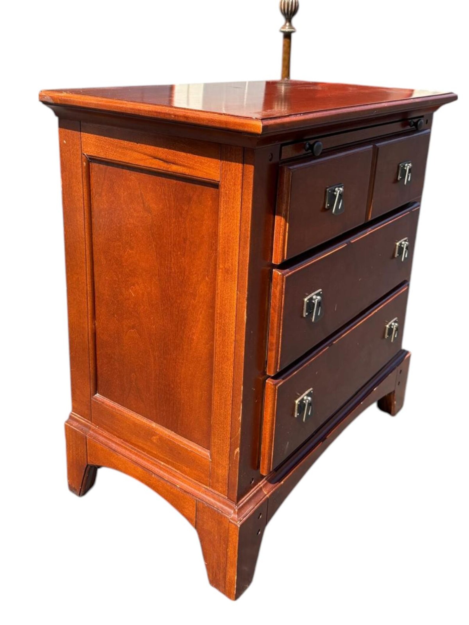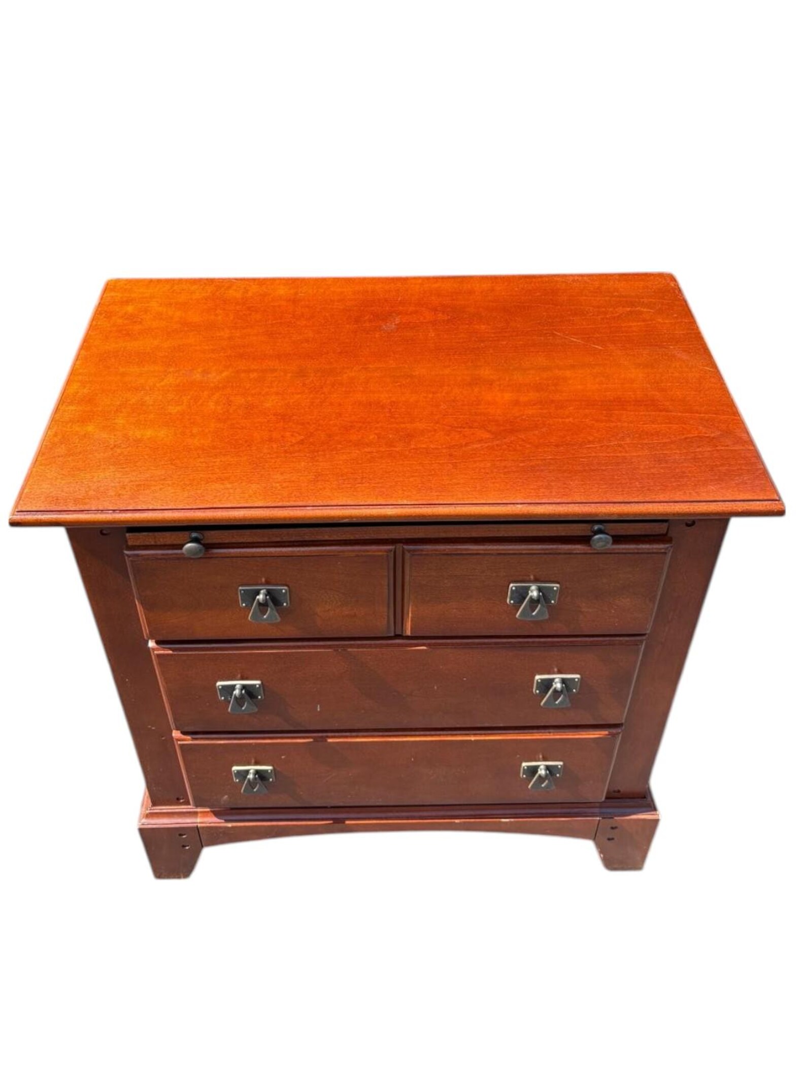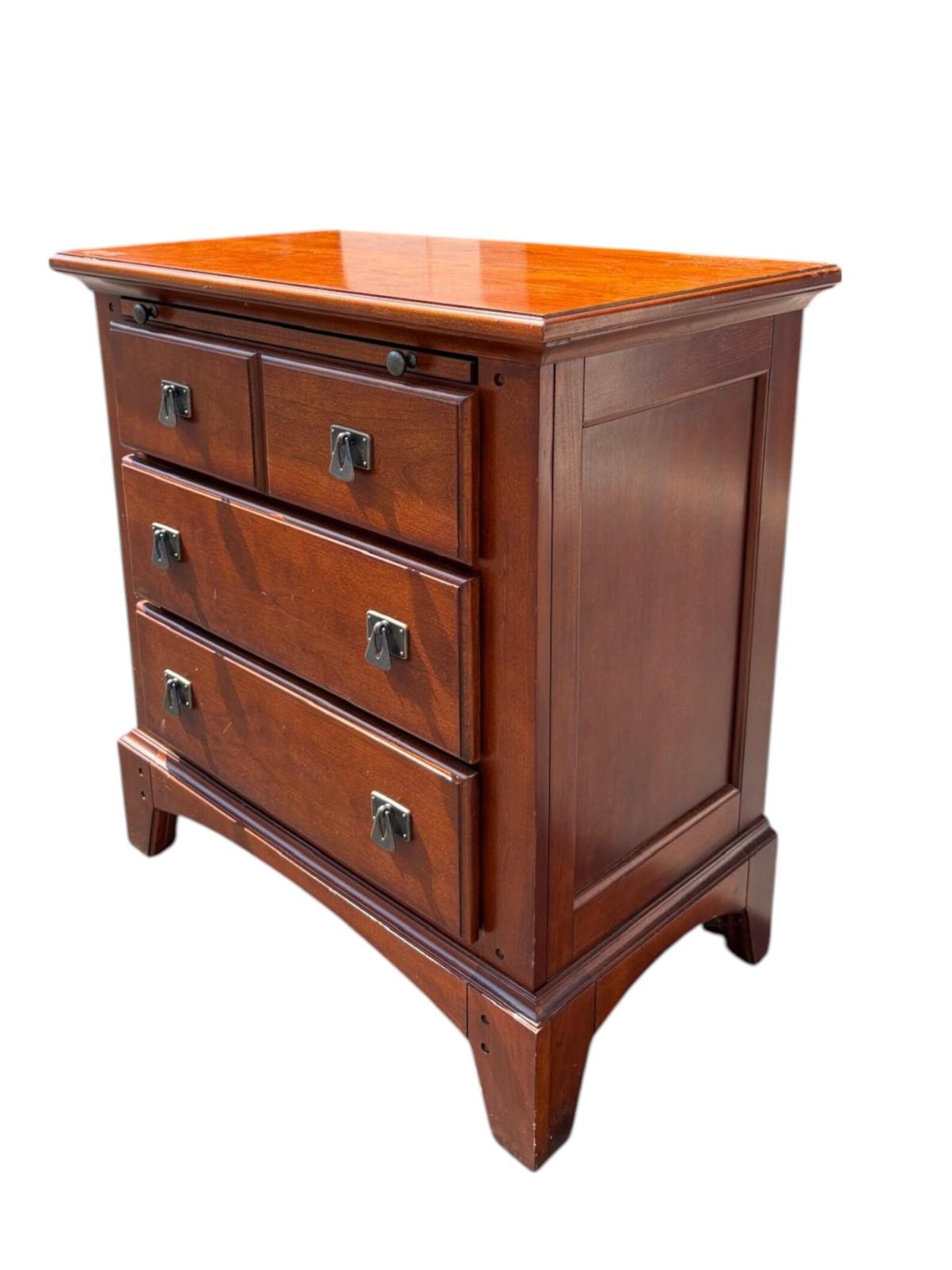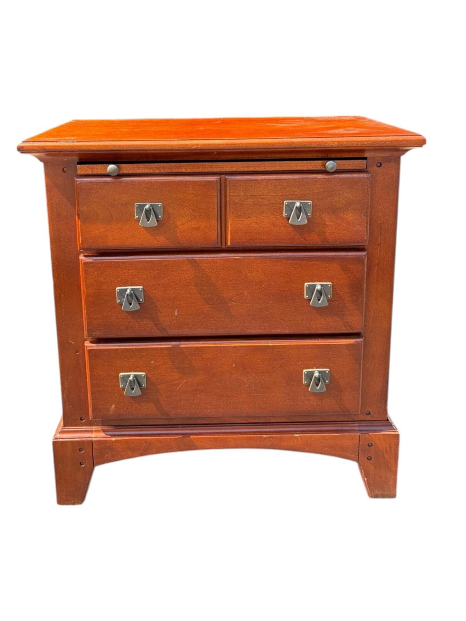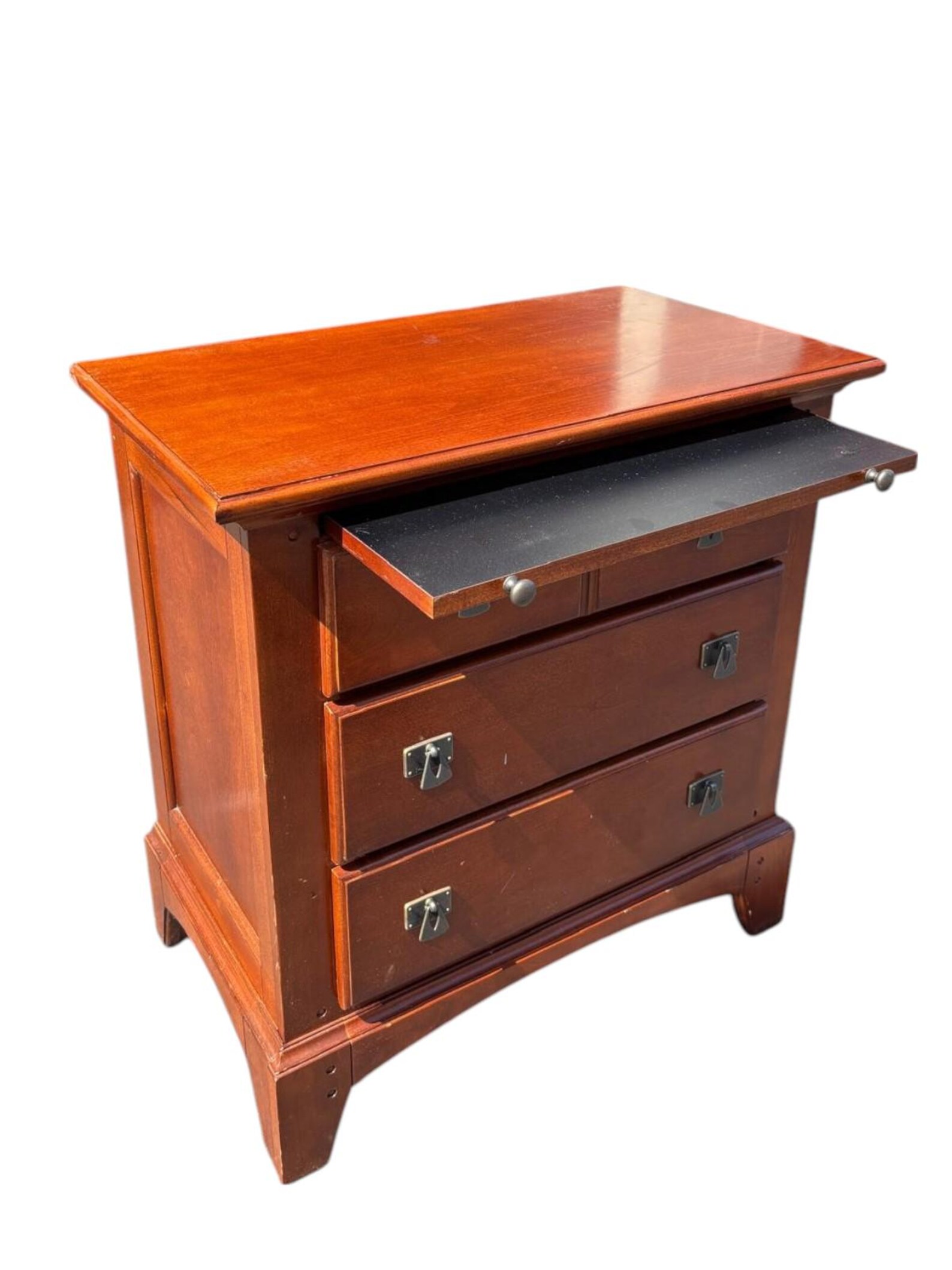Solid wood mission style three drawer chest in a reddish brown finish. Clean and simple lines make this piece very easy to style. Each drawer has distinct metal drop pull handles. Functional and stylish. In good condition.