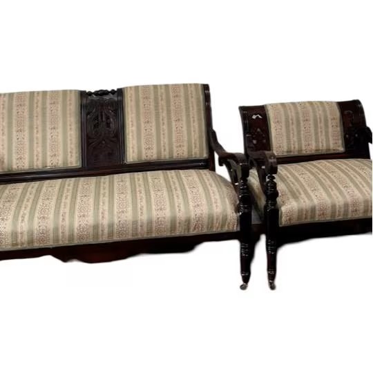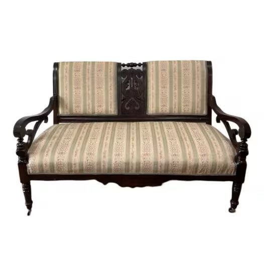 Beautiful details in the scrollwork and turnings done in Walnut make this set stand out. The Upholstery has soft shades of cream, Sage, and blush. There is a small scuff mark on the chair arm that could use old English polish otherwise, the pieces are in very clean condition. Both pieces have brass casters and clean upholstery. From the 1930s.