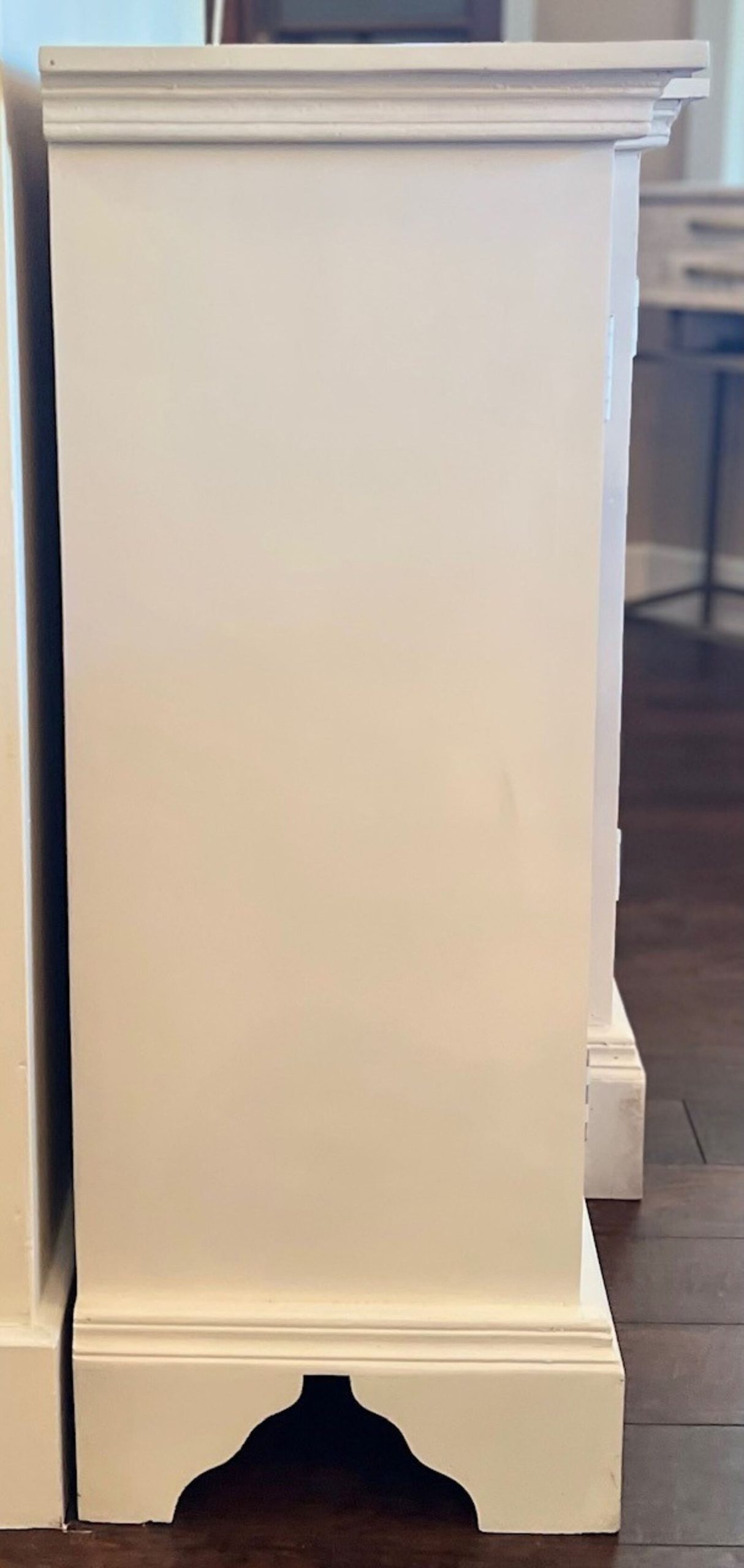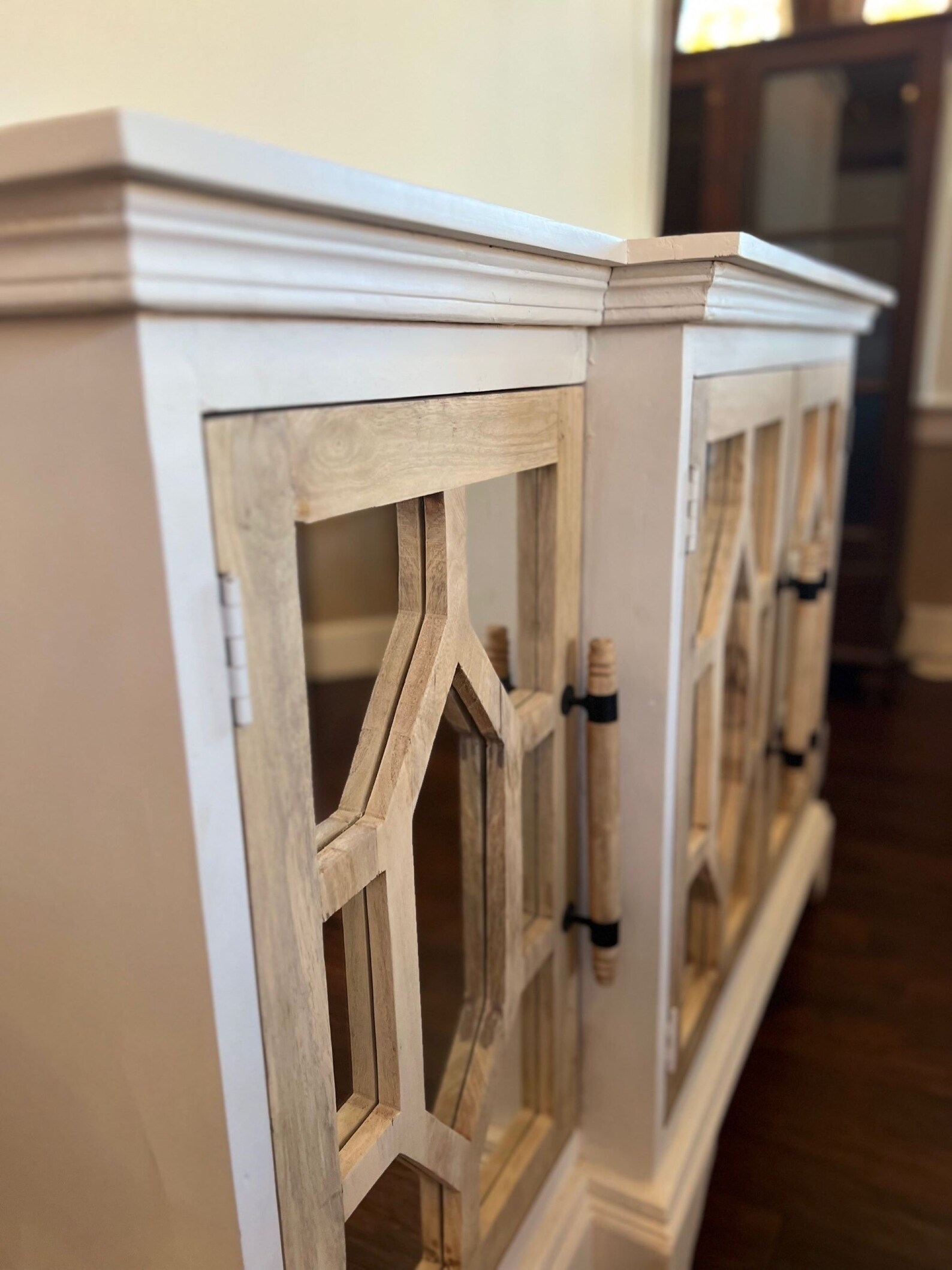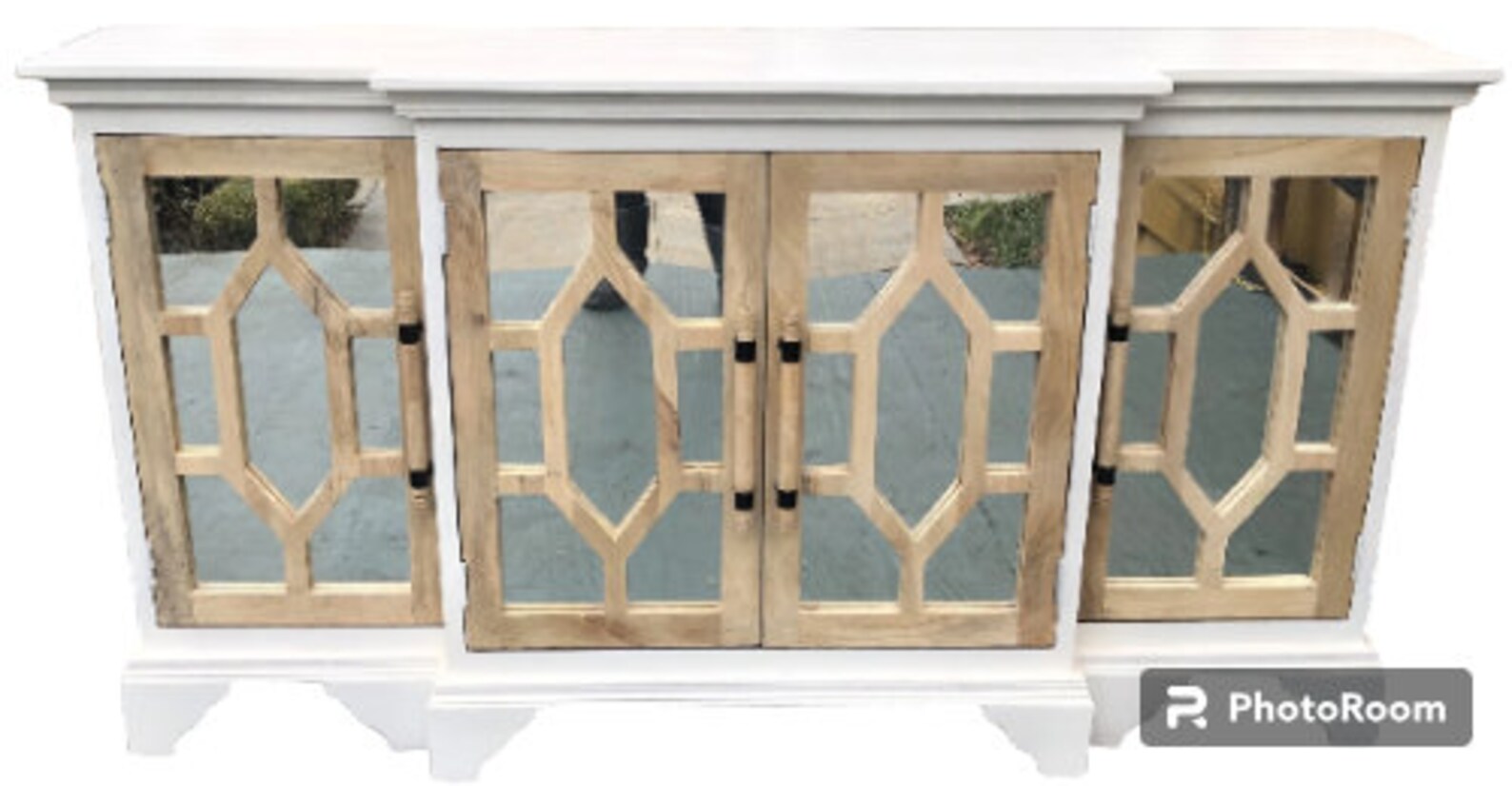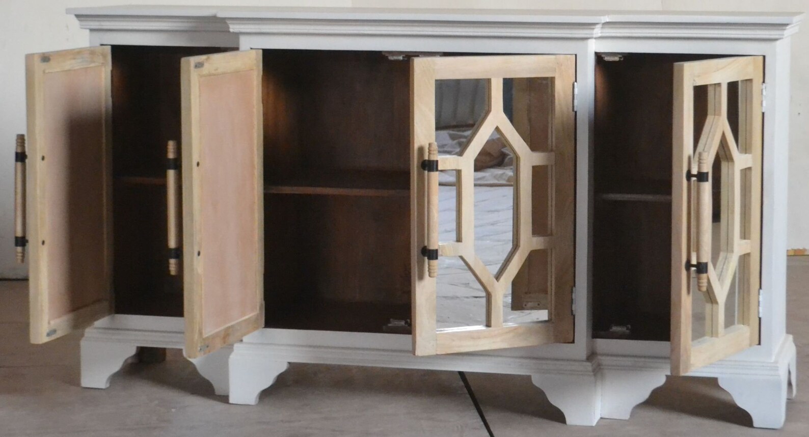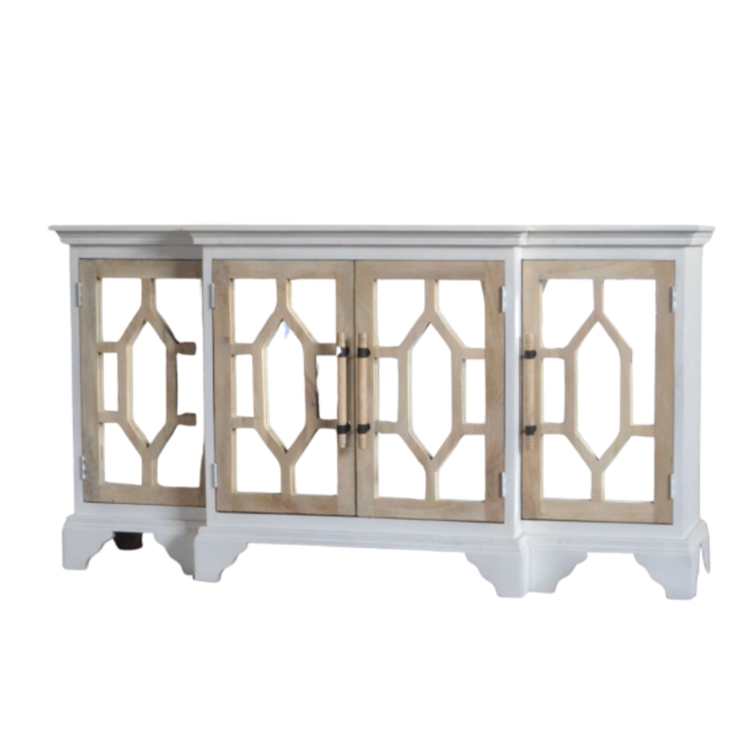 This Coastal entryway credenza features carved solid wood and mirror doors, offering a tall breakfront sideboard or media console with a natural wood and white finish.