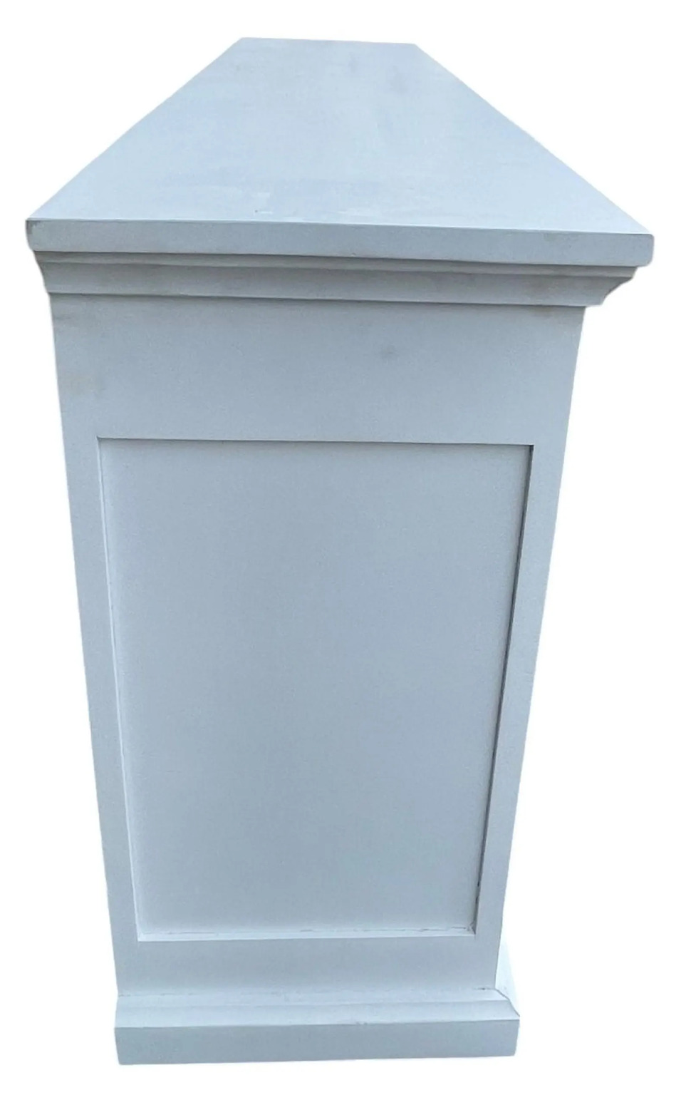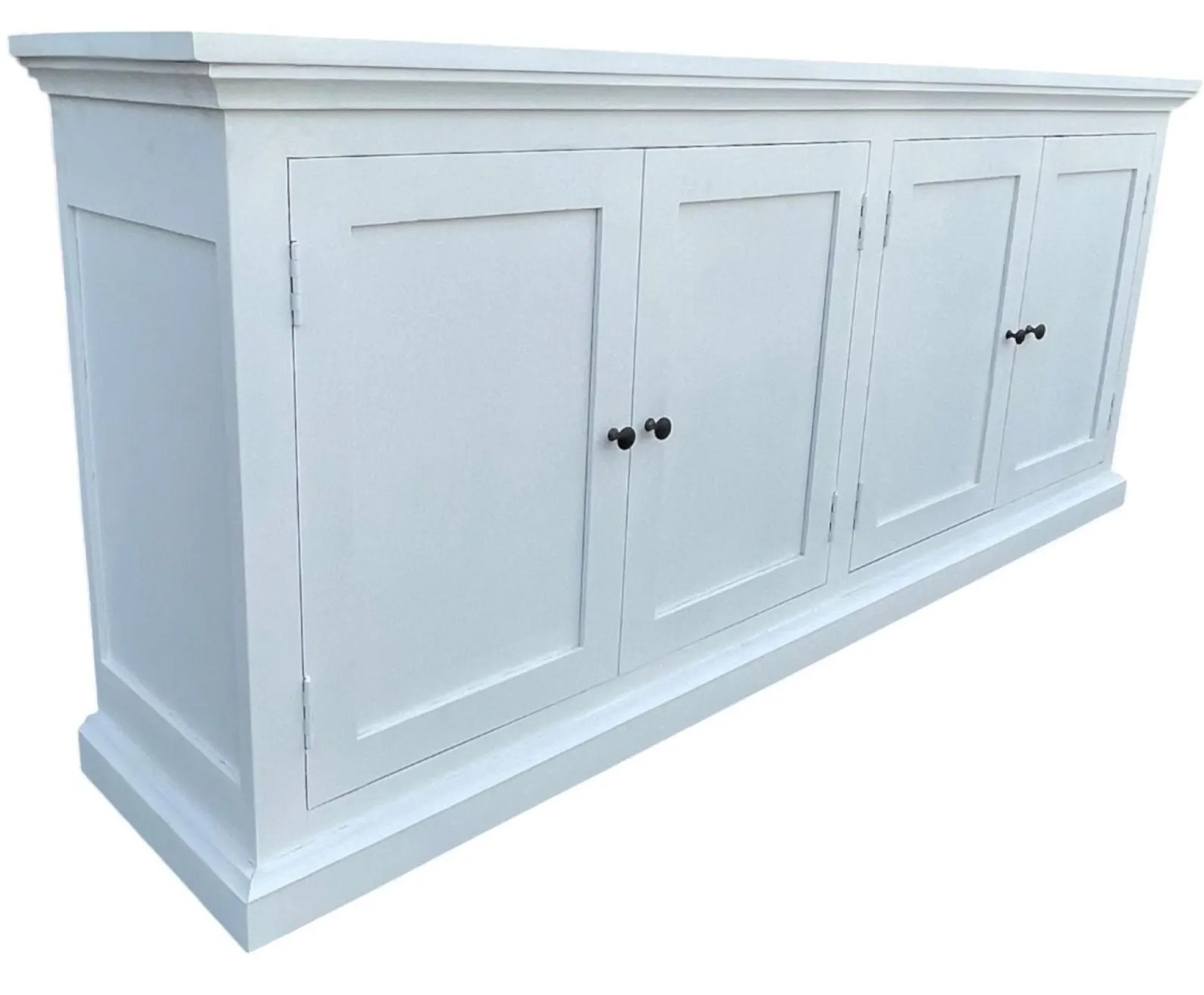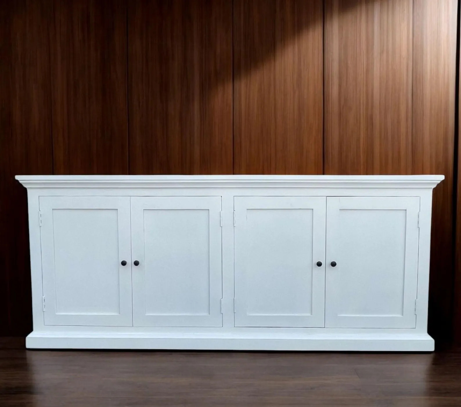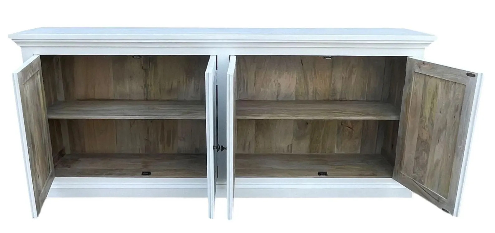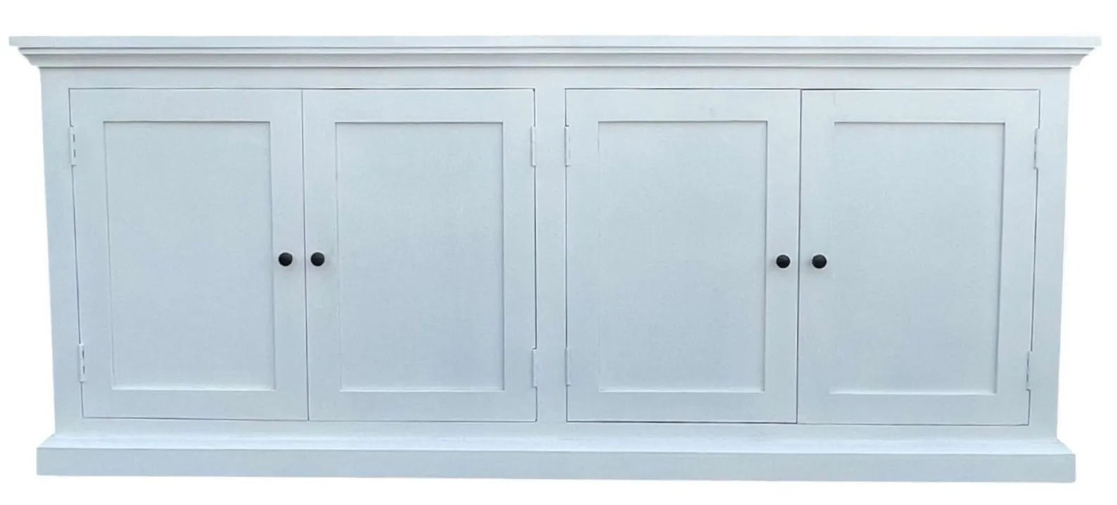 This Modern Farmhouse entryway media console features four doors and is crafted from white solid mango wood, functioning as a credenza, dining buffet server, or storage cabinet.